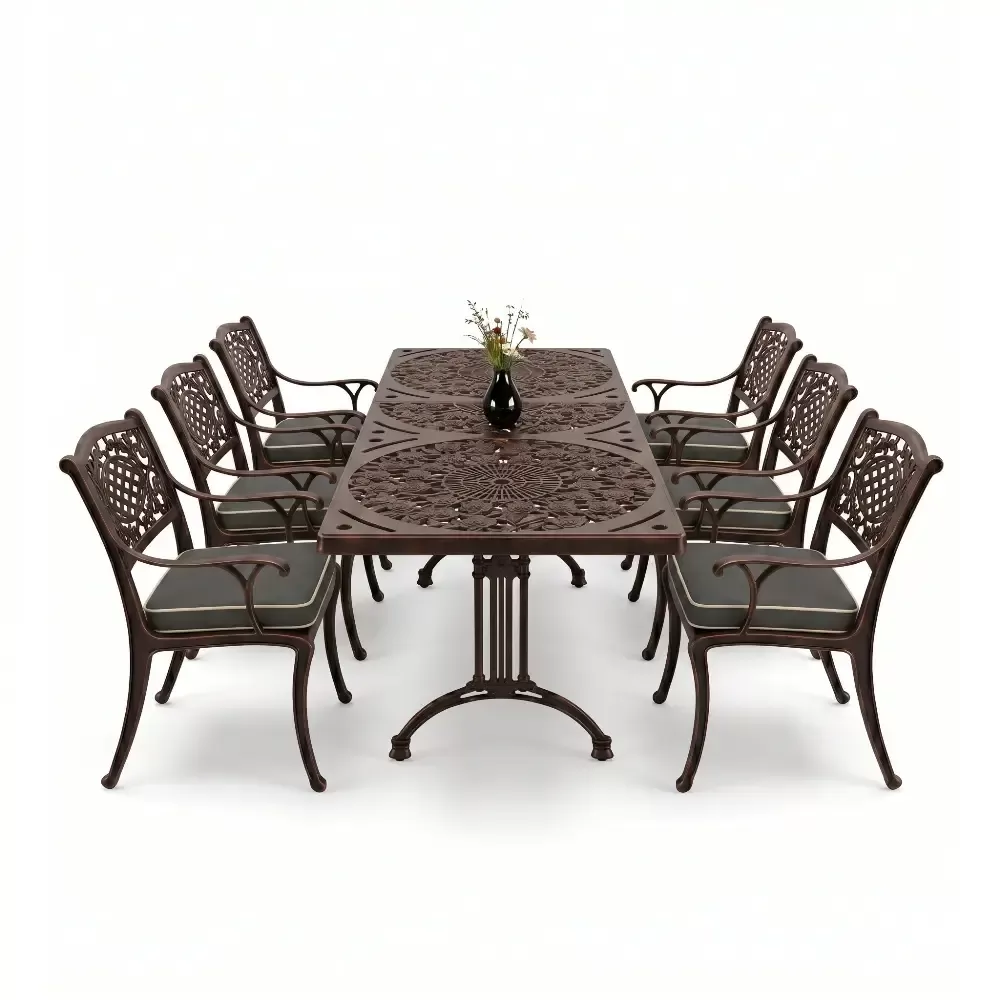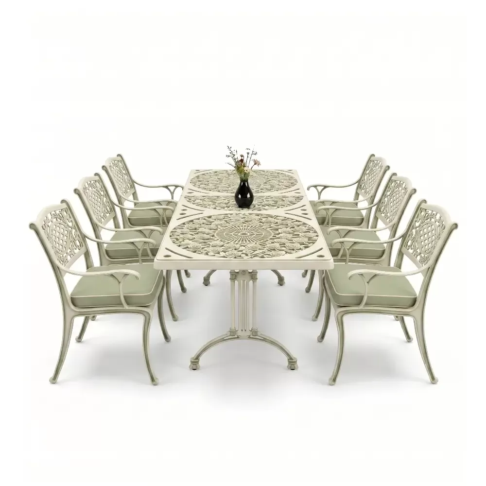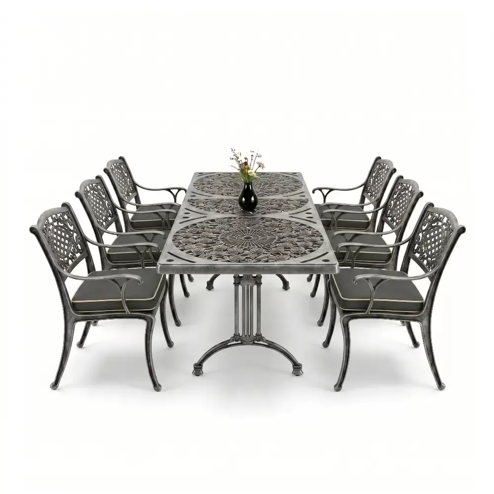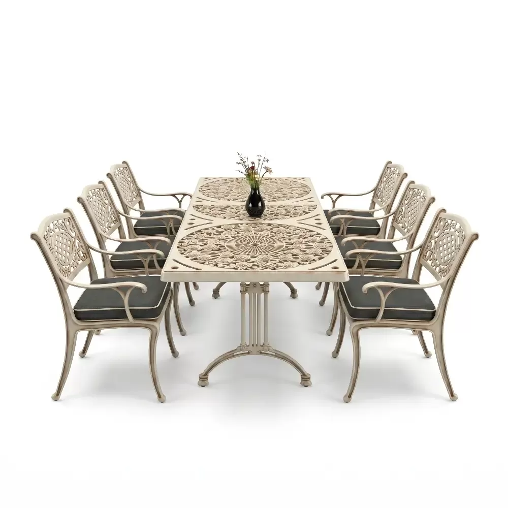Acik hava yasam alanlarinizi birer sanat eserine donusturmek uzere tasarlanan 98 MHS dikdortgen yemek grubu, klasik ferforje hatlarini modern aluminyum dokum teknolojisiyle bulusturuyor. Alti kisilik genis oturma kapasitesi ve ergonomik yapisiyla Akbrella kalitesini her detayda hissettiren bu set, bahce, balkon ve teraslarinizda sadece bir mobilya degil, ayni zamanda prestijli bir stil beyani sunuyor. Paslanmaya karsi dogal direnci ve yuksek mukavemeti sayesinde nesiller boyu size eslik etmek uzere uretilmistir.