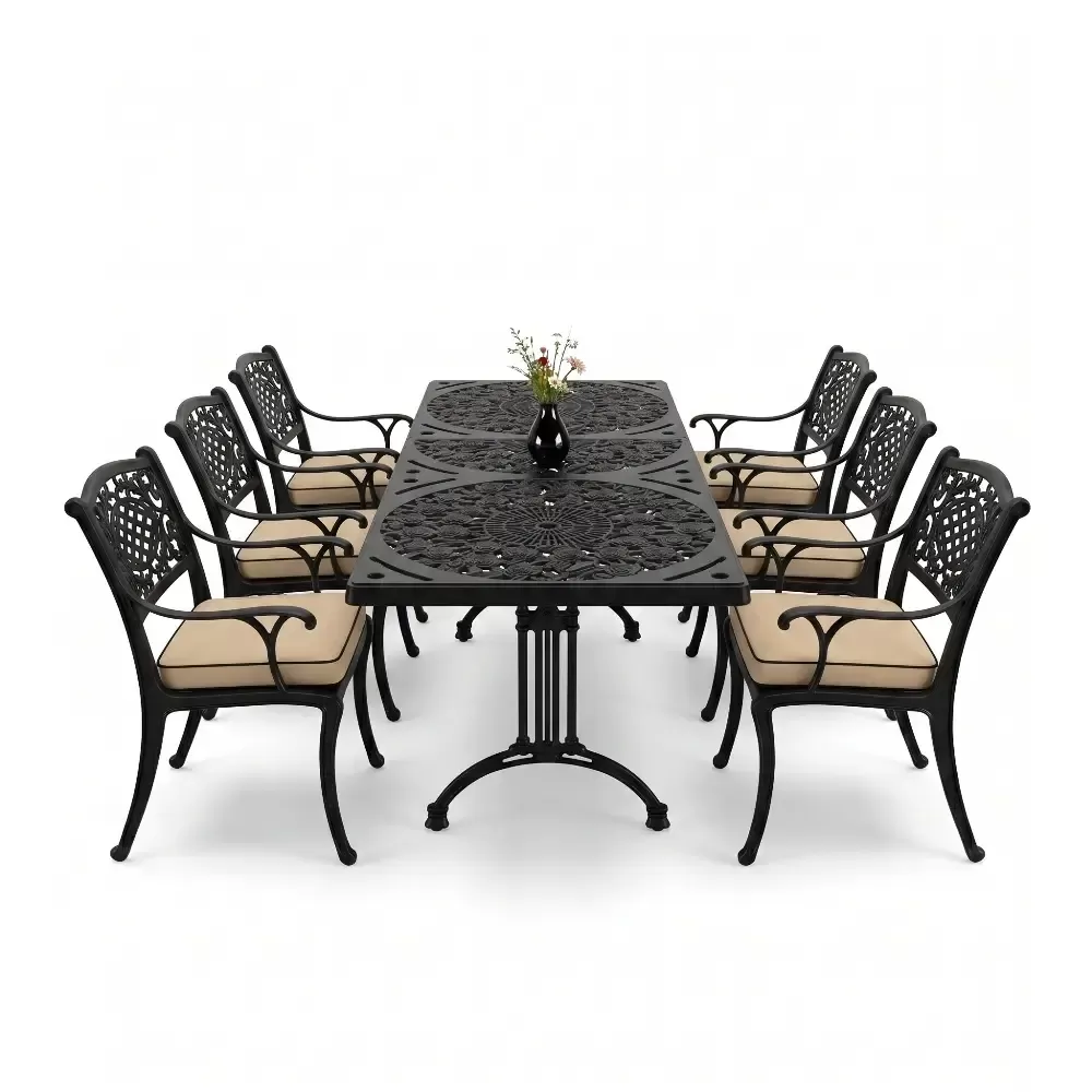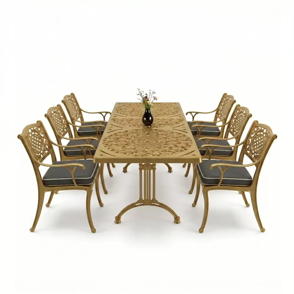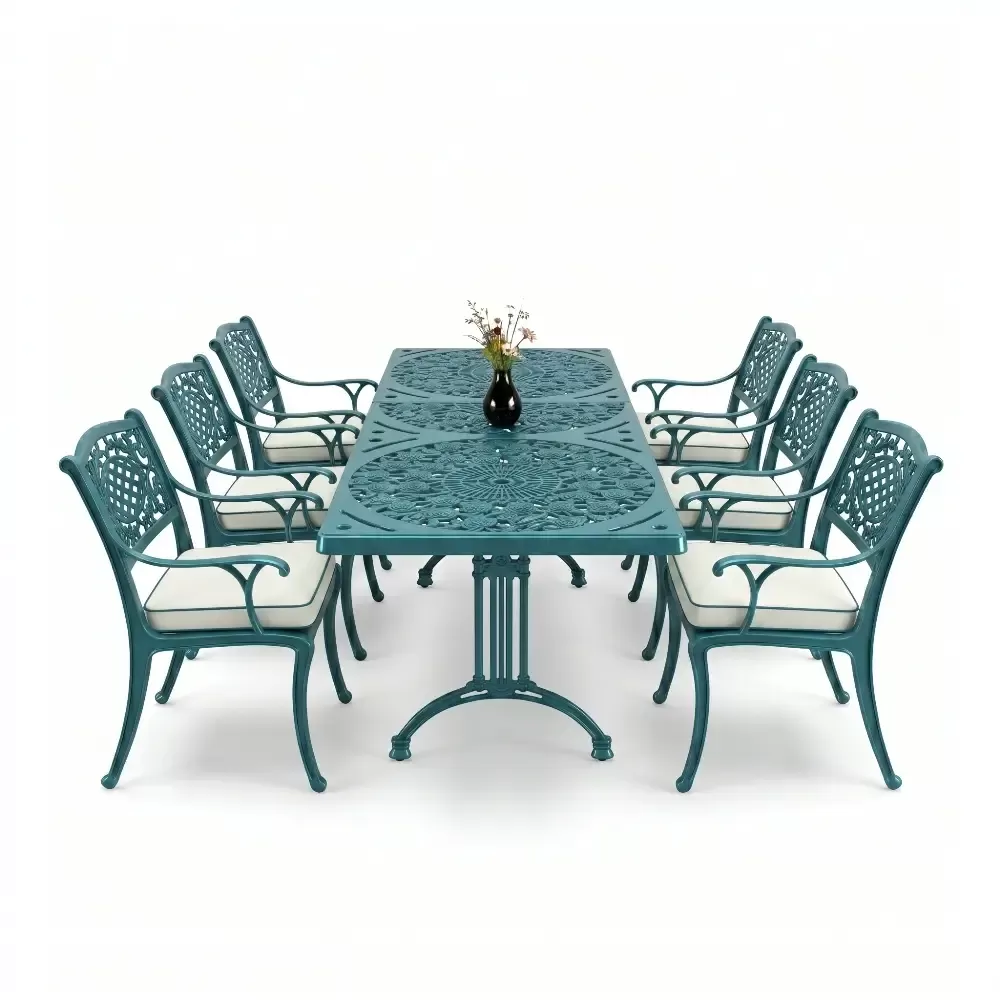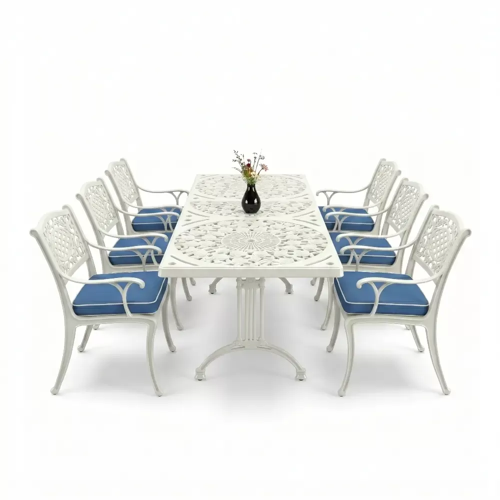 Acik hava yasam alanlarinizi birer sanat eserine donusturmek uzere tasarlanan 98 MHS dikdortgen yemek grubu, klasik ferforje hatlarini modern aluminyum dokum teknolojisiyle bulusturuyor. Alti kisilik genis oturma kapasitesi ve ergonomik yapisiyla Akbrella kalitesini her detayda hissettiren bu set, bahce, balkon ve teraslarinizda sadece bir mobilya degil, ayni zamanda prestijli bir stil beyani sunuyor. Paslanmaya karsi dogal direnci ve yuksek mukavemeti sayesinde nesiller boyu size eslik etmek uzere uretilmistir.