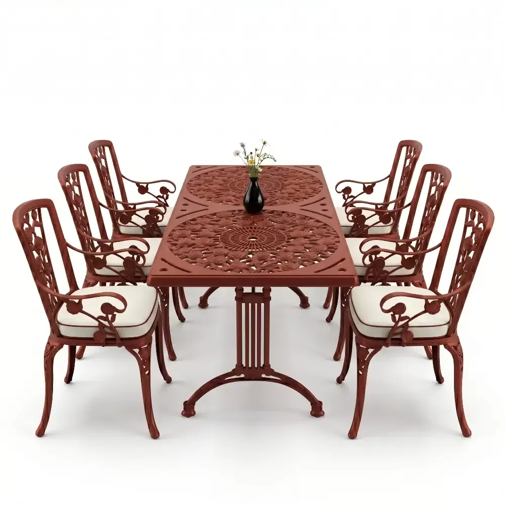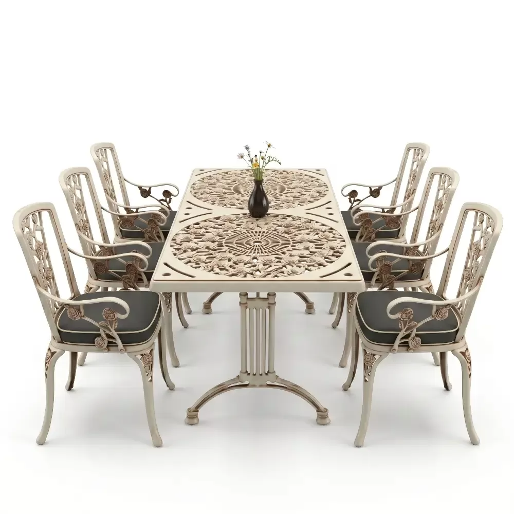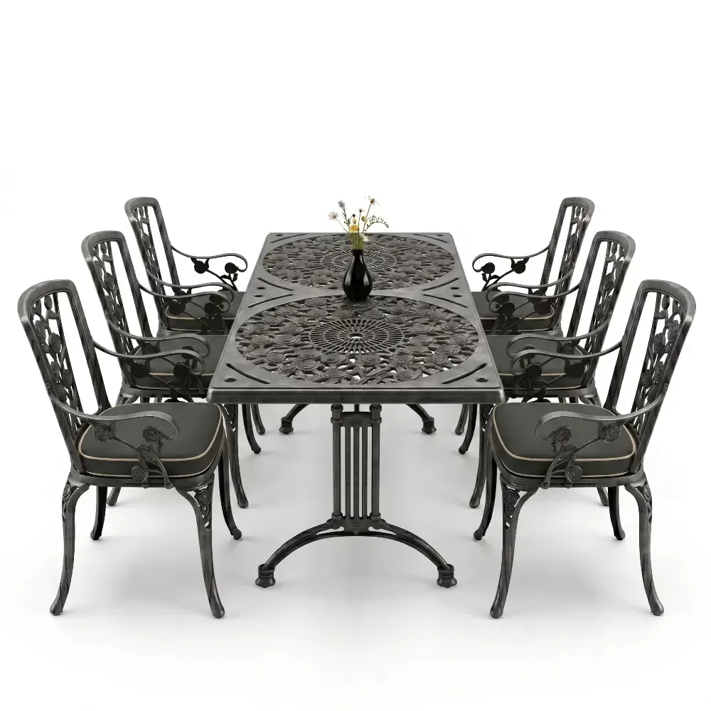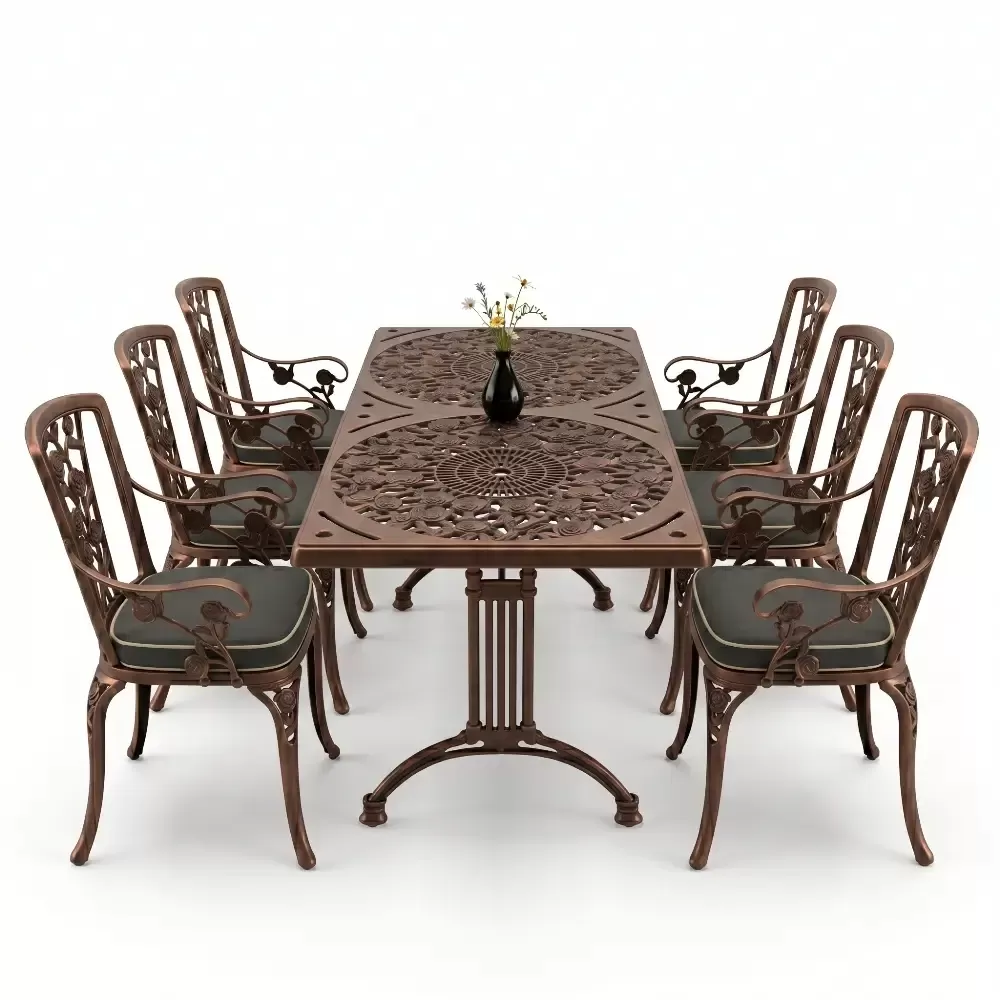 Acik hava yasam alanlarinizi birer sanat eserine donusturmek uzere tasarlanan 99 MHS dikdortgen yemek grubu, klasik ferforje hatlarini modern aluminyum dokum teknolojisiyle bulusturuyor. Alti kisilik genis oturma kapasitesi ve ergonomik yapisiyla Akbrella kalitesini her detayda hissettiren bu set, bahce, balkon ve teraslarinizda sadece bir mobilya degil, ayni zamanda prestijli bir stil beyani sunuyor. Paslanmaya karsi dogal direnci ve yuksek mukavemeti sayesinde nesiller boyu size eslik etmek uzere uretilmistir.