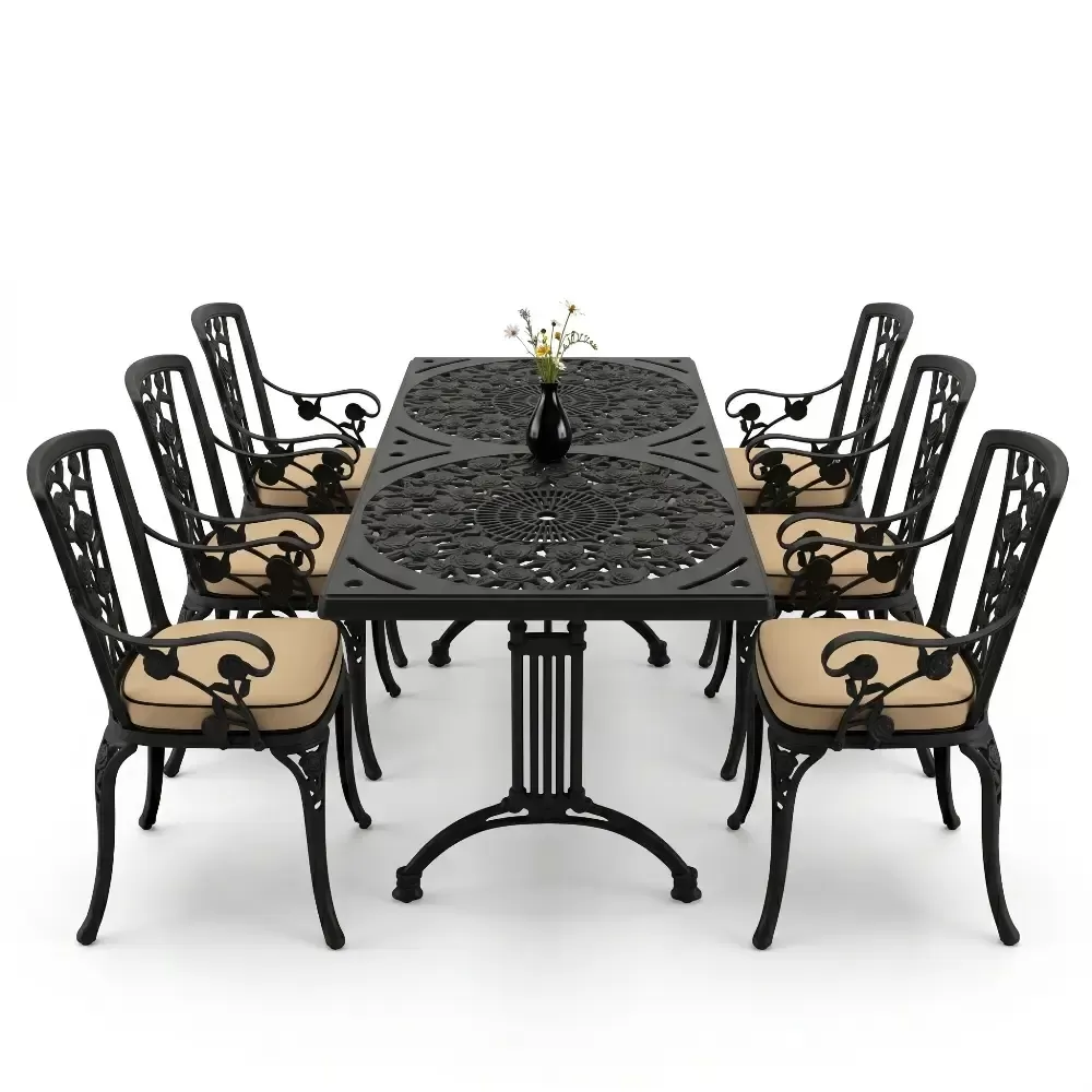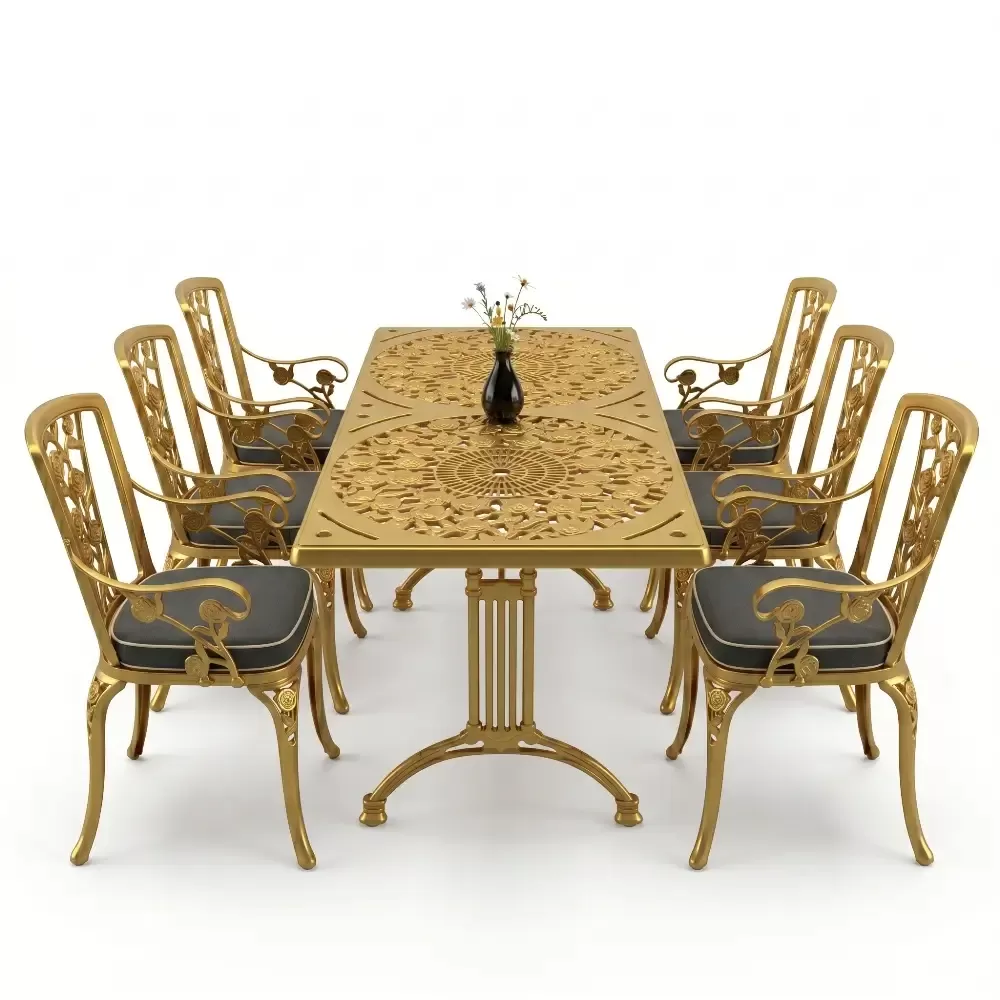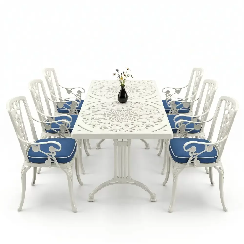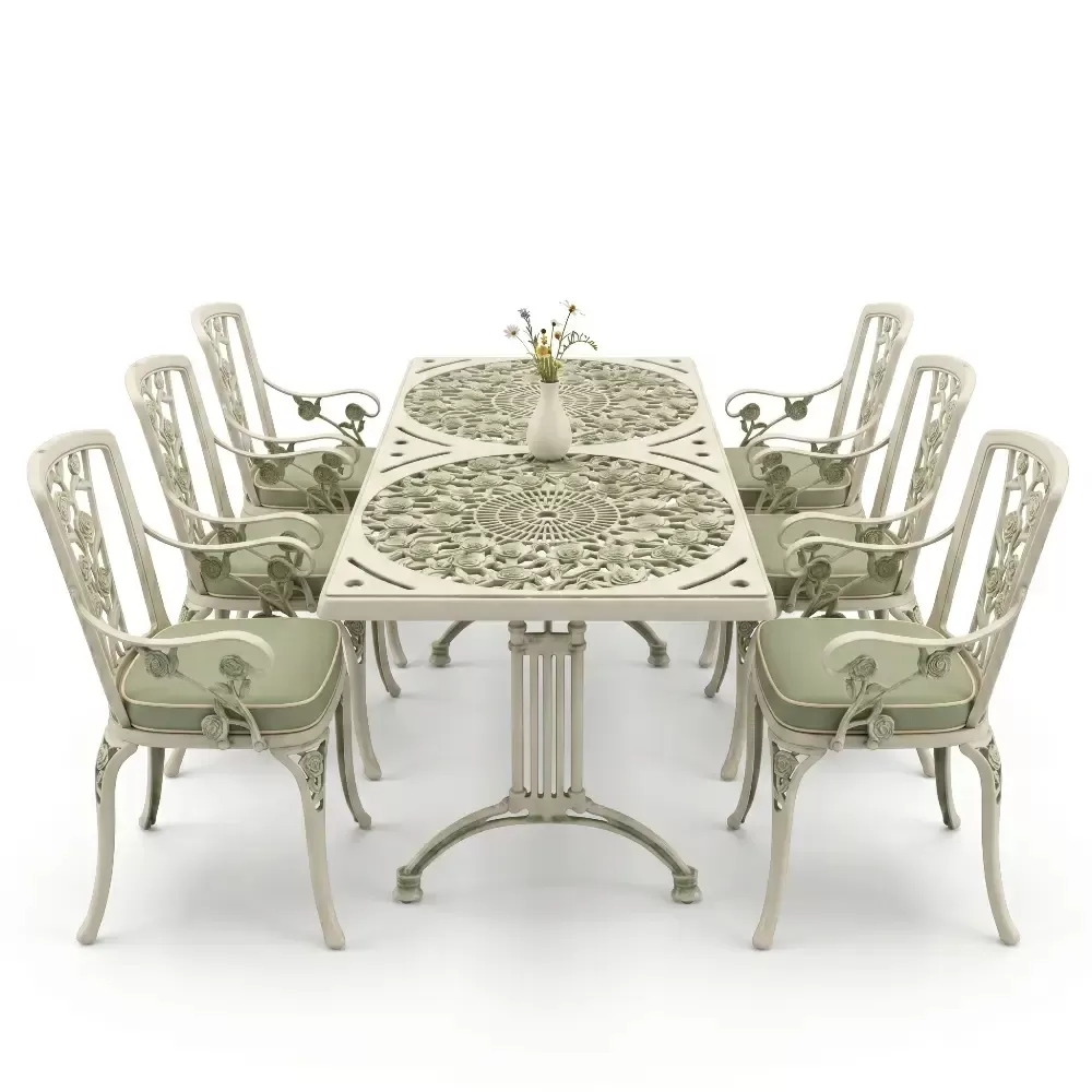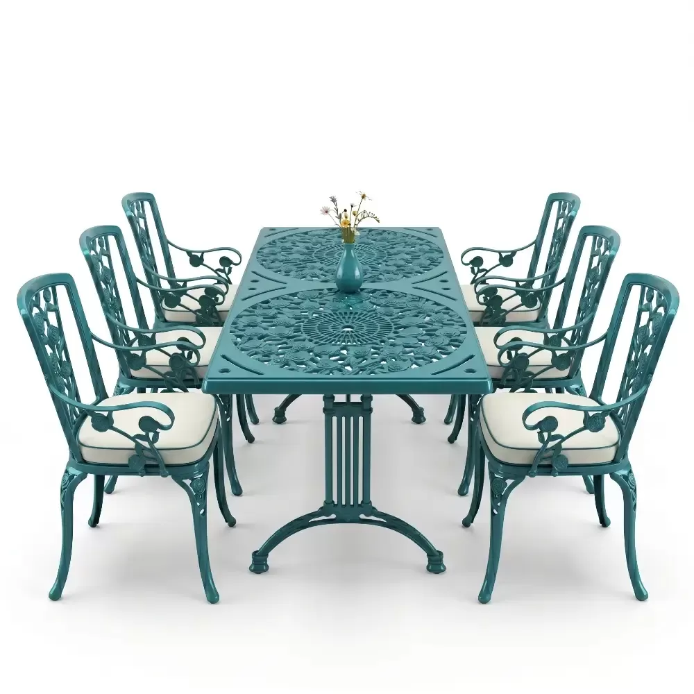 Acik hava yasam alanlarinizi birer sanat eserine donusturmek uzere tasarlanan 99 MHS dikdortgen yemek grubu, klasik ferforje hatlarini modern aluminyum dokum teknolojisiyle bulusturuyor. Alti kisilik genis oturma kapasitesi ve ergonomik yapisiyla Akbrella kalitesini her detayda hissettiren bu set, bahce, balkon ve teraslarinizda sadece bir mobilya degil, ayni zamanda prestijli bir stil beyani sunuyor. Paslanmaya karsi dogal direnci ve yuksek mukavemeti sayesinde nesiller boyu size eslik etmek uzere uretilmistir.
