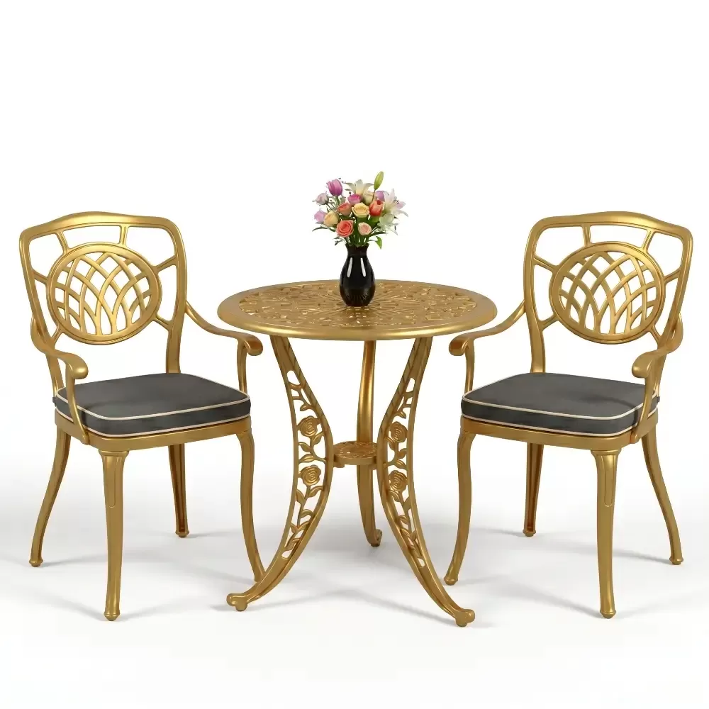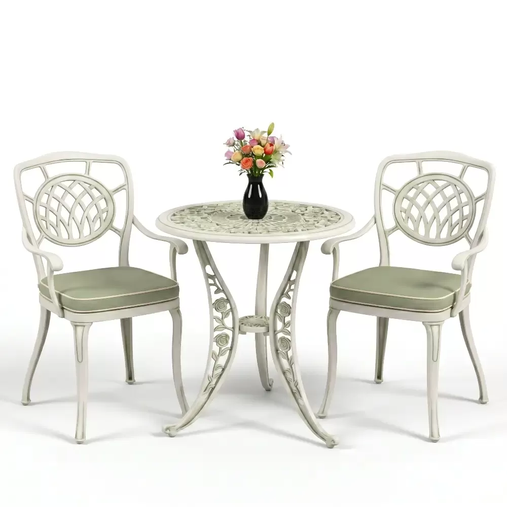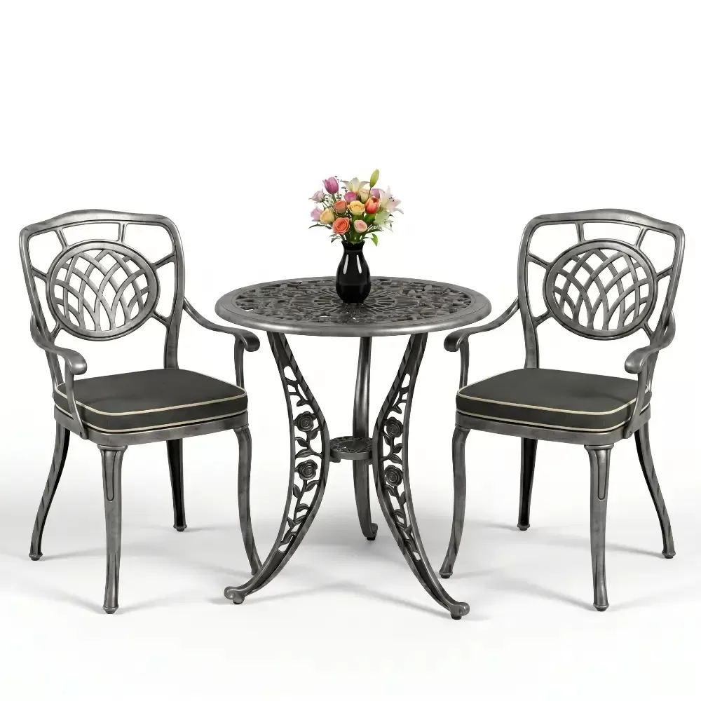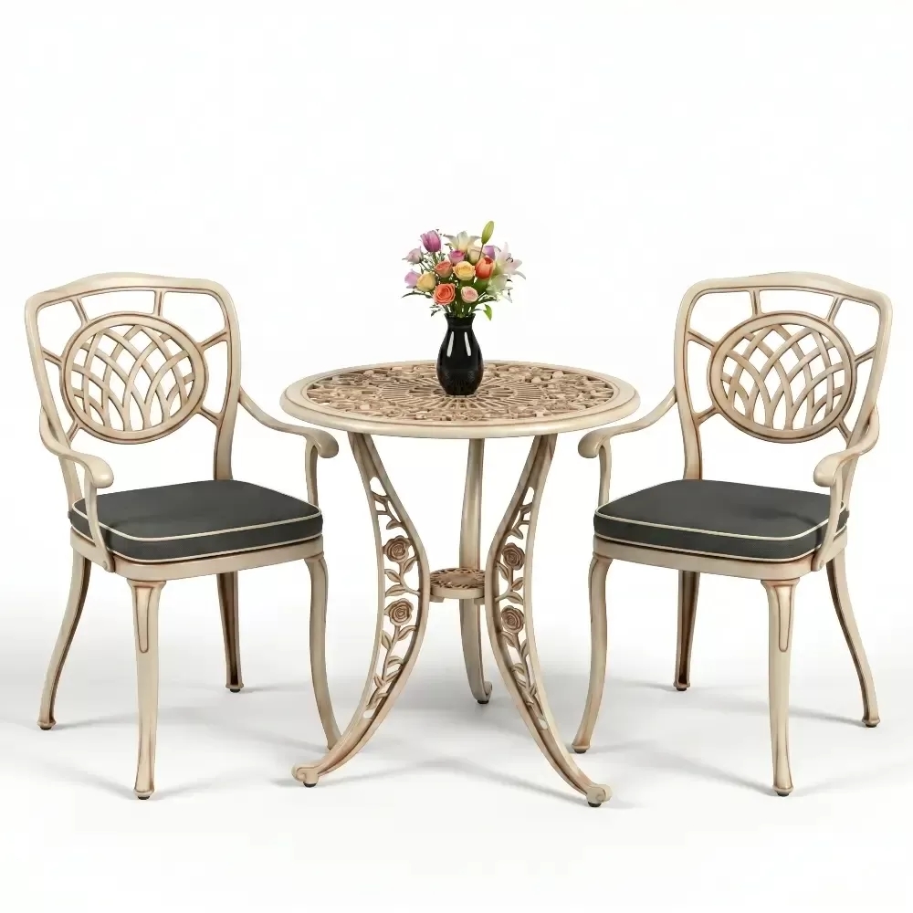 Yüksek kaliteli alüminyum döküm malzemeden üretilen bu takım, doğa şartlarına karşı tam direnç gösterecek şekilde tasarlanmıştır. Demir mobilyaların aksine paslanma ve korozyon riski barındırmaz. Elektrostatik fırın boya teknolojisi ile desteklenen yüzey dokusu; UV ışınlarına, aşırı sıcaklara ve nemli ortamlara karşı üstün koruma sağlayarak ürünün ilk günkü zarafetini uzun yıllar boyunca korumasına yardımcı olur.
