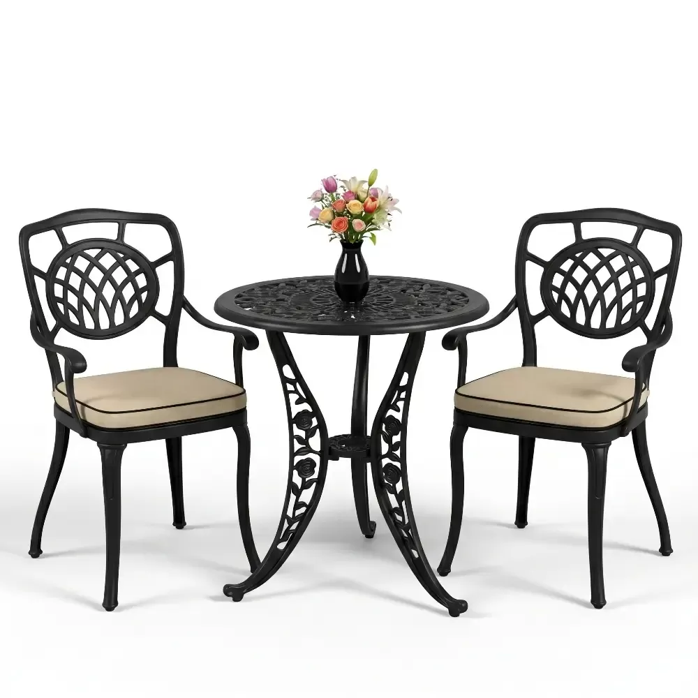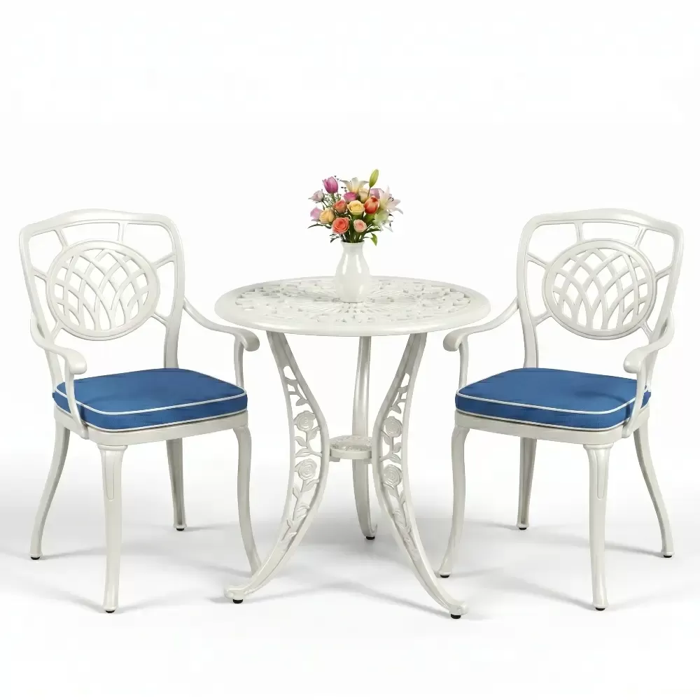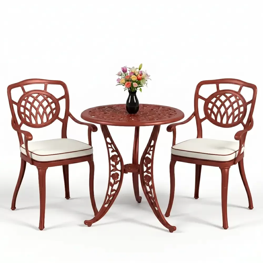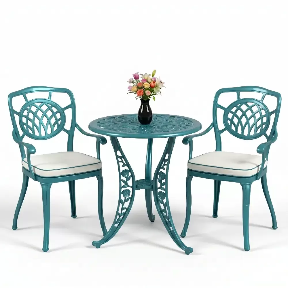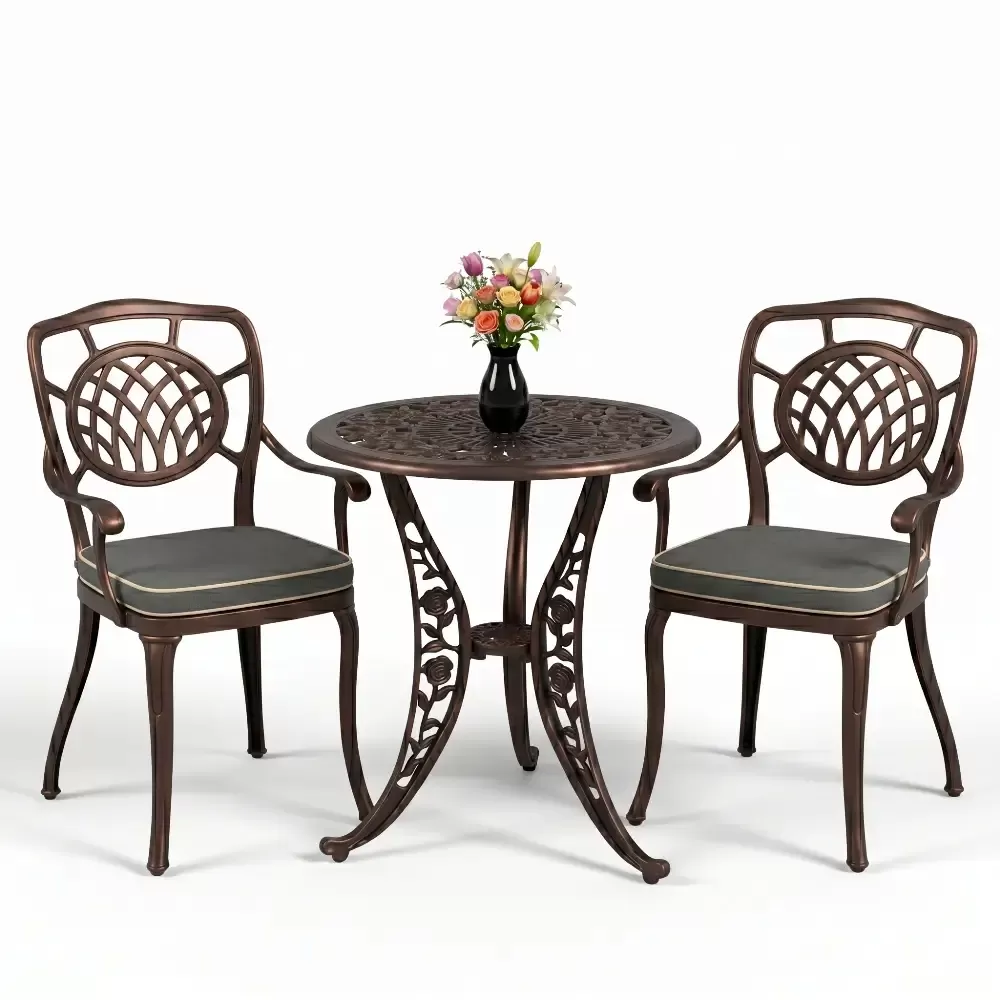 Yüksek kaliteli alüminyum döküm malzemeden üretilen bu takım, doğa şartlarına karşı tam direnç gösterecek şekilde tasarlanmıştır. Demir mobilyaların aksine paslanma ve korozyon riski barındırmaz. Elektrostatik fırın boya teknolojisi ile desteklenen yüzey dokusu; UV ışınlarına, aşırı sıcaklara ve nemli ortamlara karşı üstün koruma sağlayarak ürünün ilk günkü zarafetini uzun yıllar boyunca korumasına yardımcı olur.