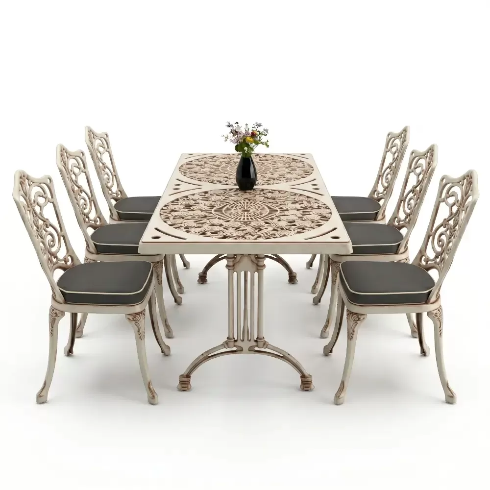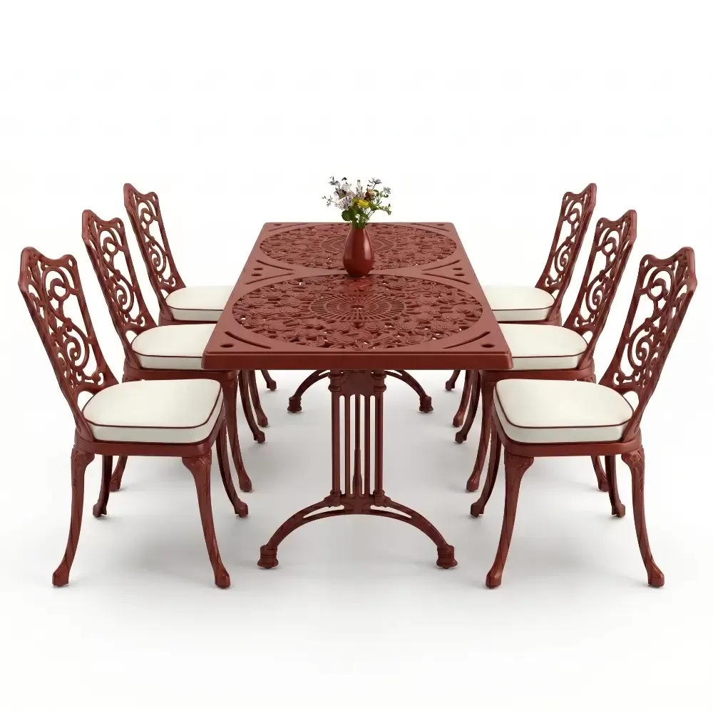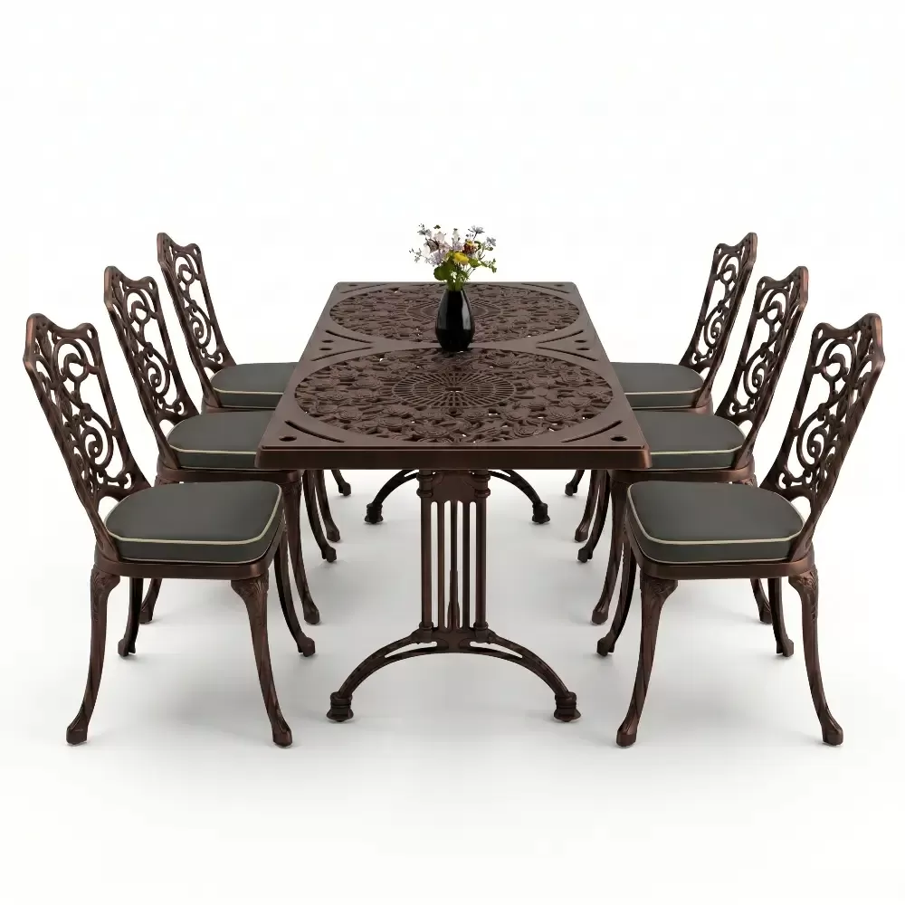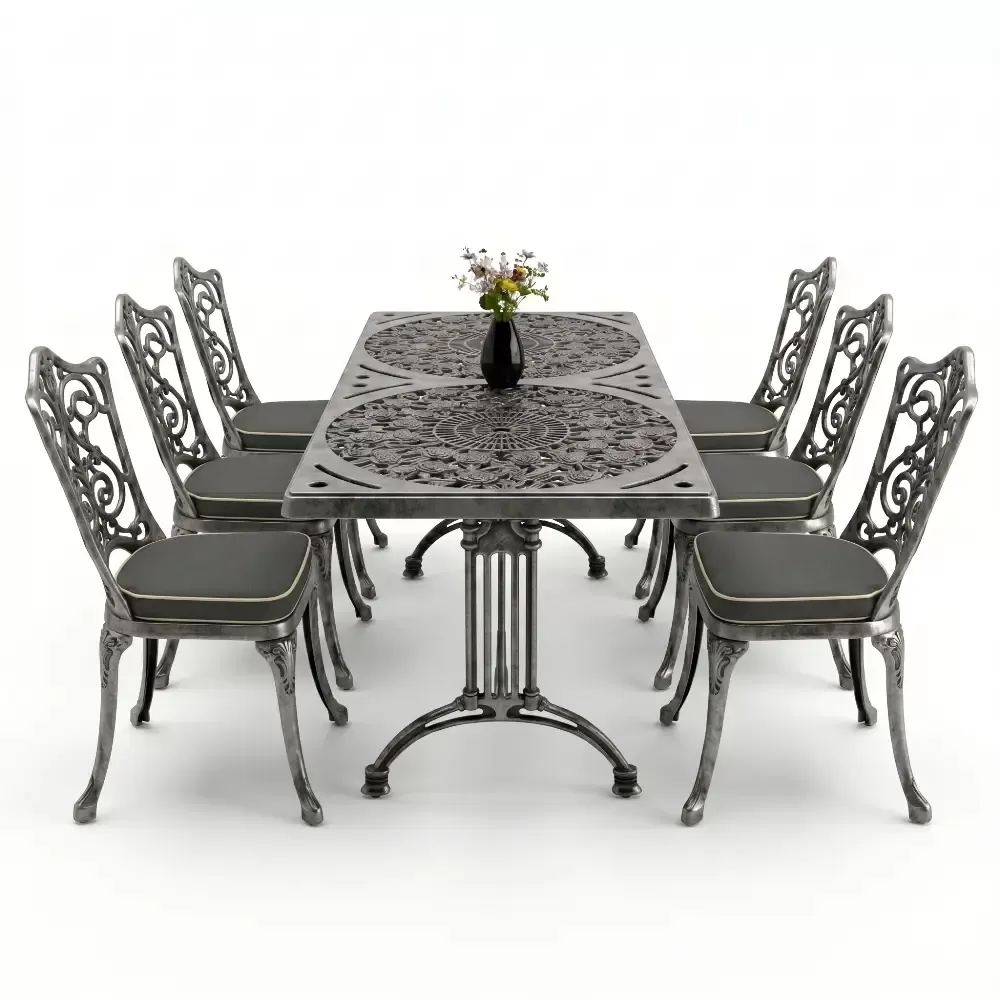 Akbrella kalitesiyle sunulan bu 6 kişilik yemek grubu, geleneksel ferforje estetiğini modern alüminyum döküm teknolojisinin avantajlarıyla mekanlarınıza taşıyor. Paslanmaya karşı doğal direnci ve estetik detaylarıyla dikkat çeken bu set, açık hava yaşam alanlarınızın merkez noktası olmaya adaydır.