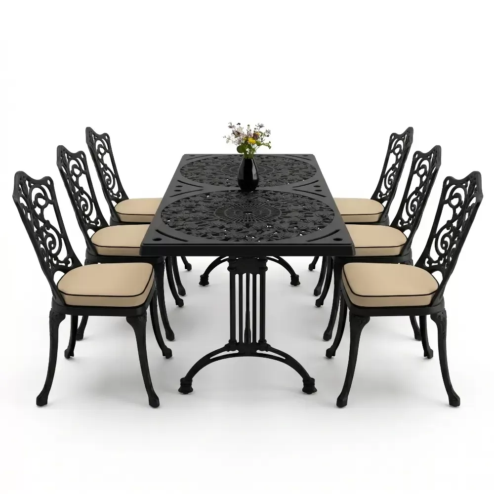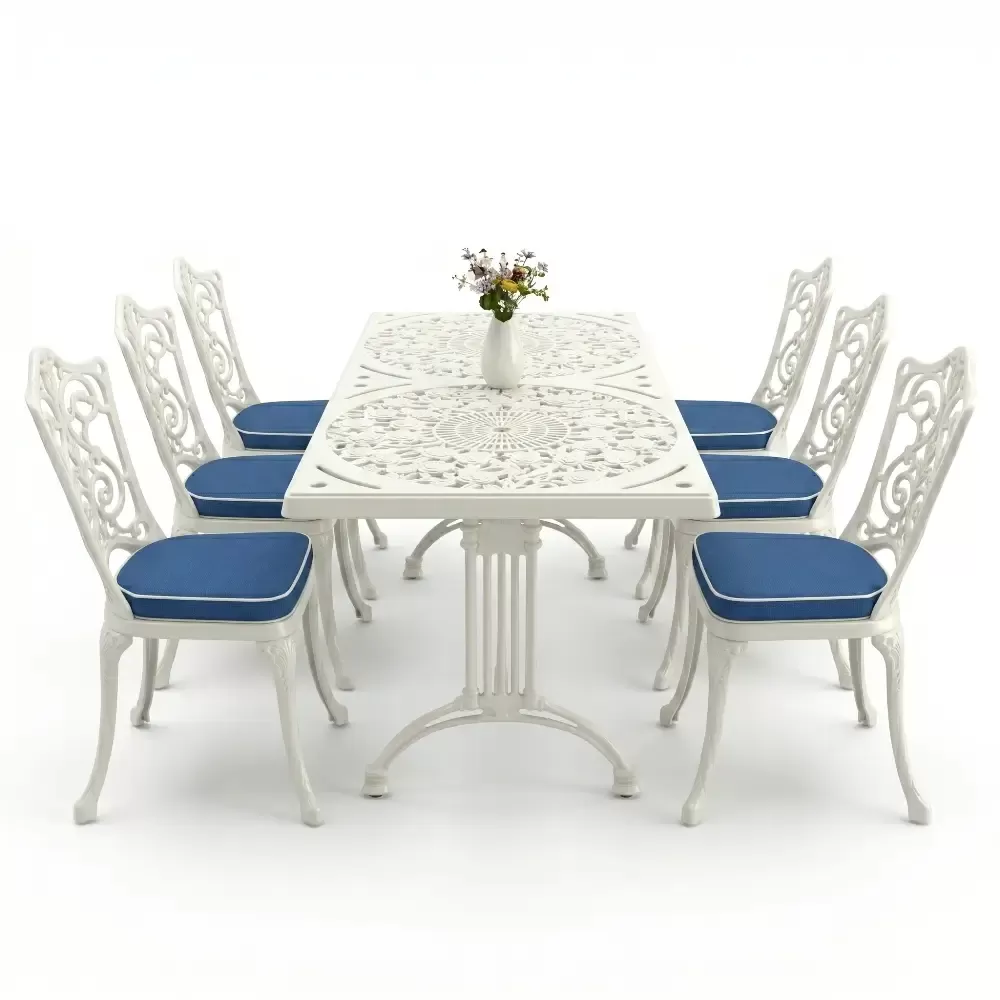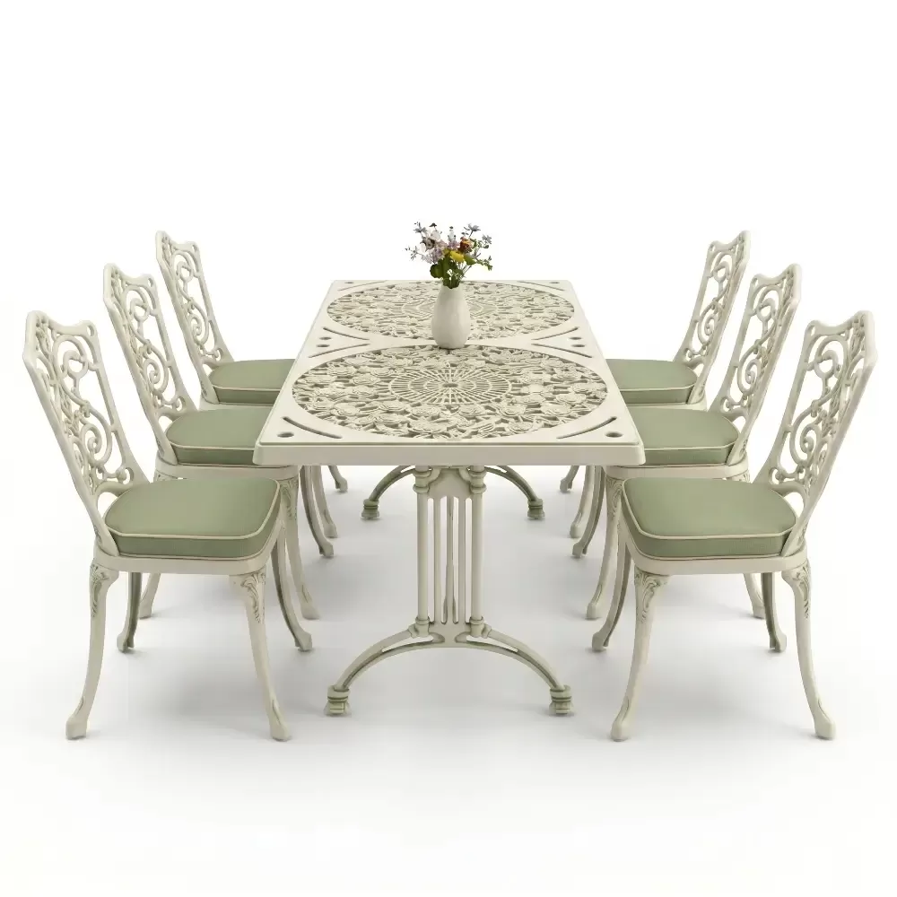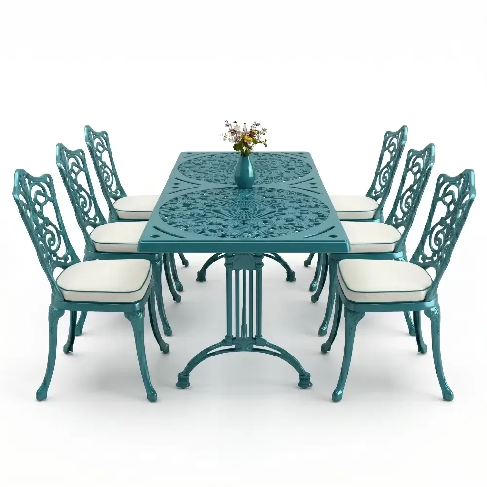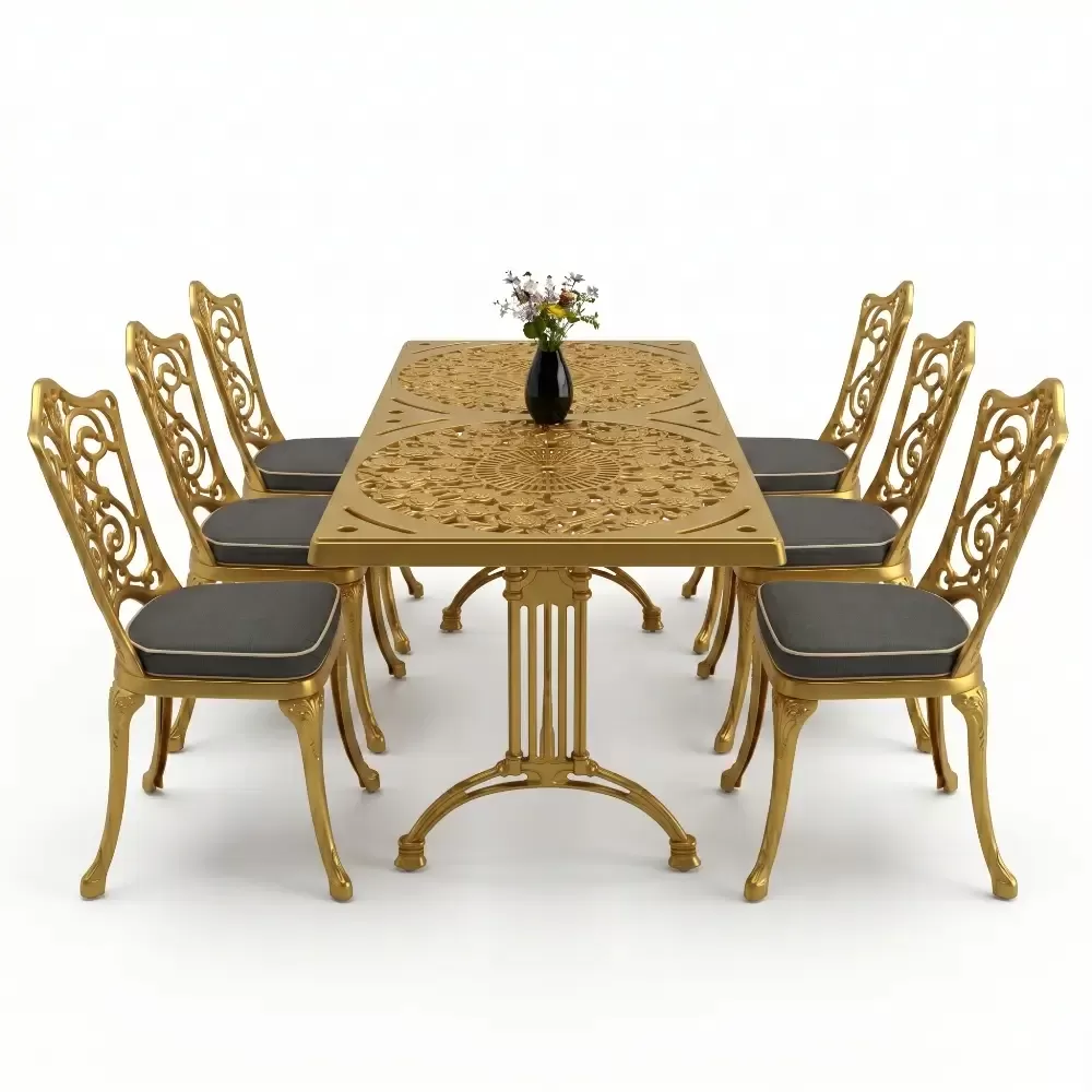 Akbrella kalitesiyle sunulan bu 6 kişilik yemek grubu, geleneksel ferforje estetiğini modern alüminyum döküm teknolojisinin avantajlarıyla mekanlarınıza taşıyor. Paslanmaya karşı doğal direnci ve estetik detaylarıyla dikkat çeken bu set, açık hava yaşam alanlarınızın merkez noktası olmaya adaydır.