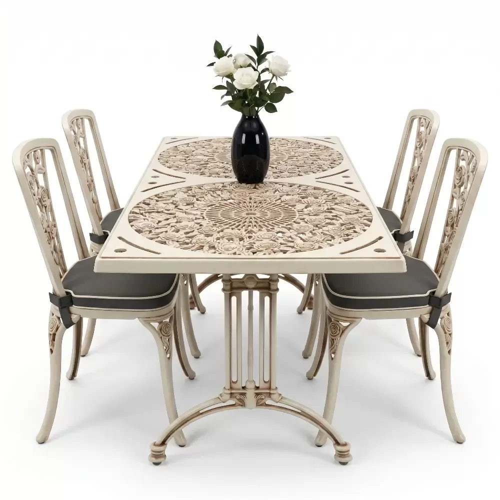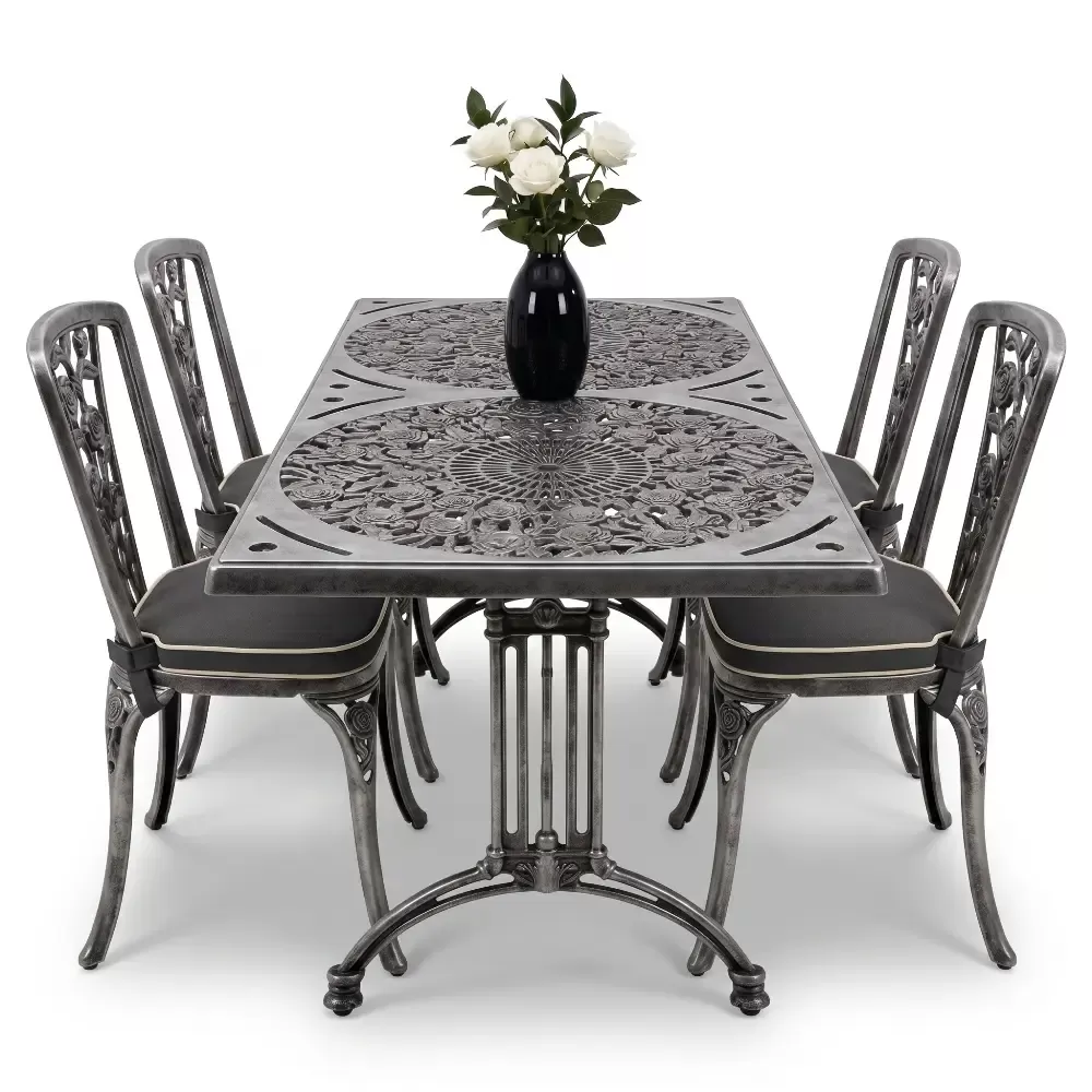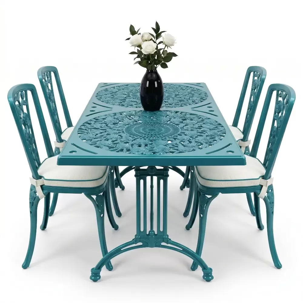 Alüminyum döküm materyalin doğal paslanmazlık özelliği sayesinde bu takım; havuz kenarlarındaki yoğun nemden sahil şeridindeki tuzlu havaya kadar her türlü zorlu şarta tam uyum sağlar. Cafe, otel ve restoran gibi ticari işletmelerin yanı sıra evlerin bahçe ve balkon bölümleri için ideal bir tercihtir. Alüminyumun hafifliği yer değiştirme sırasında kolaylık sağlarken, döküm yapısı rüzgara karşı dirençlidir. Bakım gereksinimi minimumdur; sadece su ve yumuşak bir bez ile silinmesi, mobilyanın ilk günkü ışıltılı görünümünü koruması için yeterlidir. Hijyenik yüzey yapısı kir tutmaz ve dış ortamın yıpratıcı etkilerine karşı yüksek direnç gösterir.