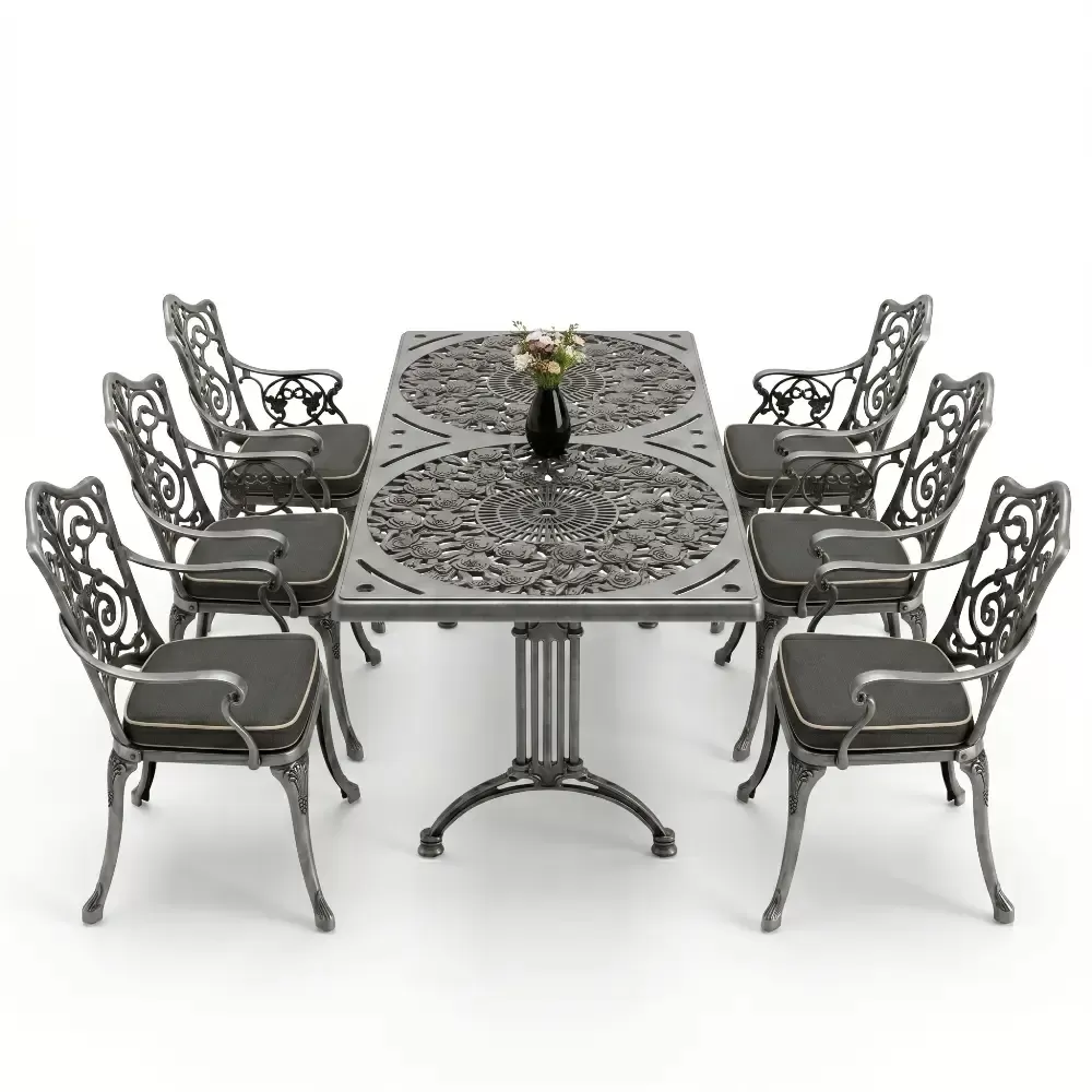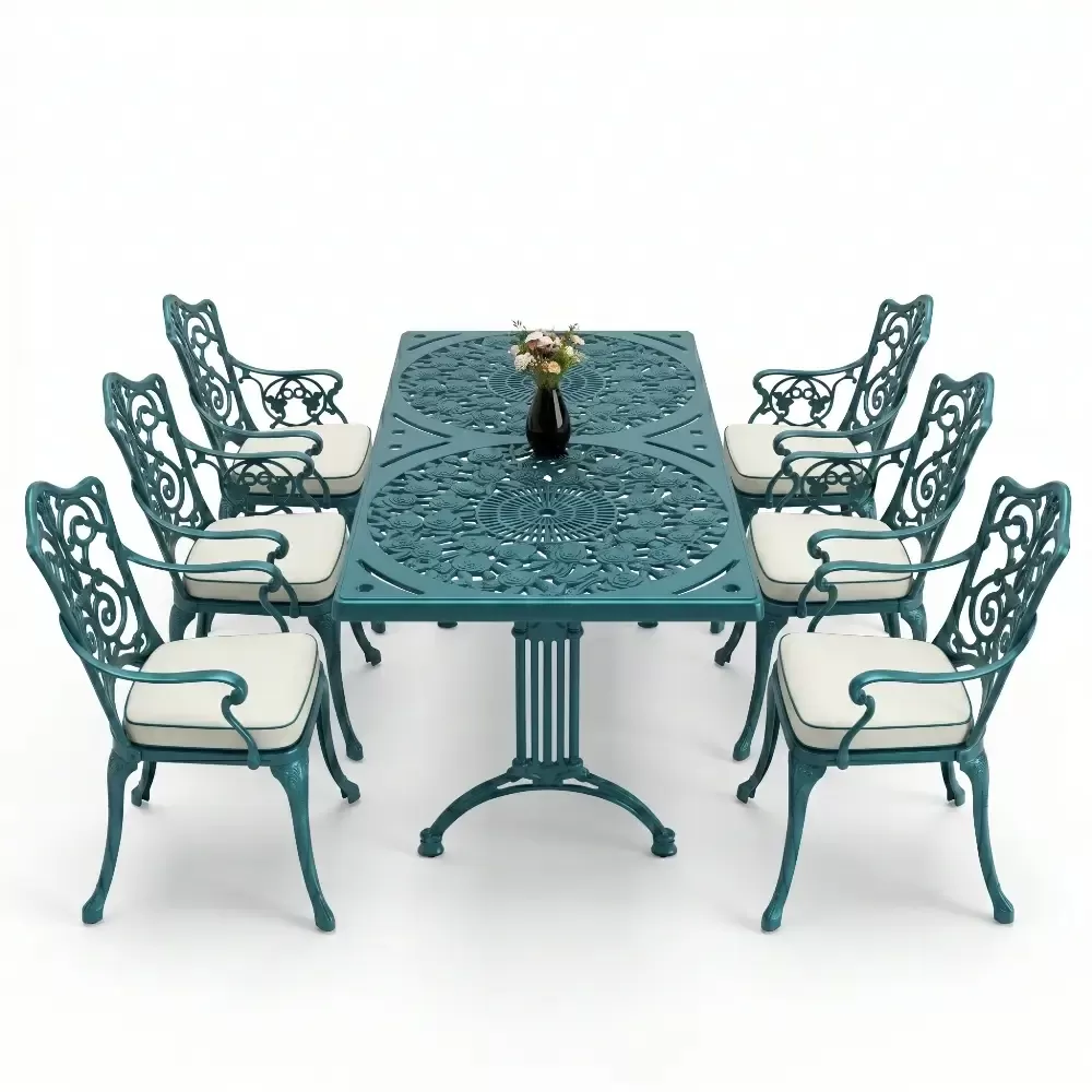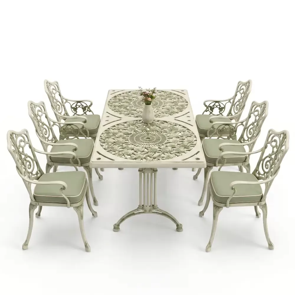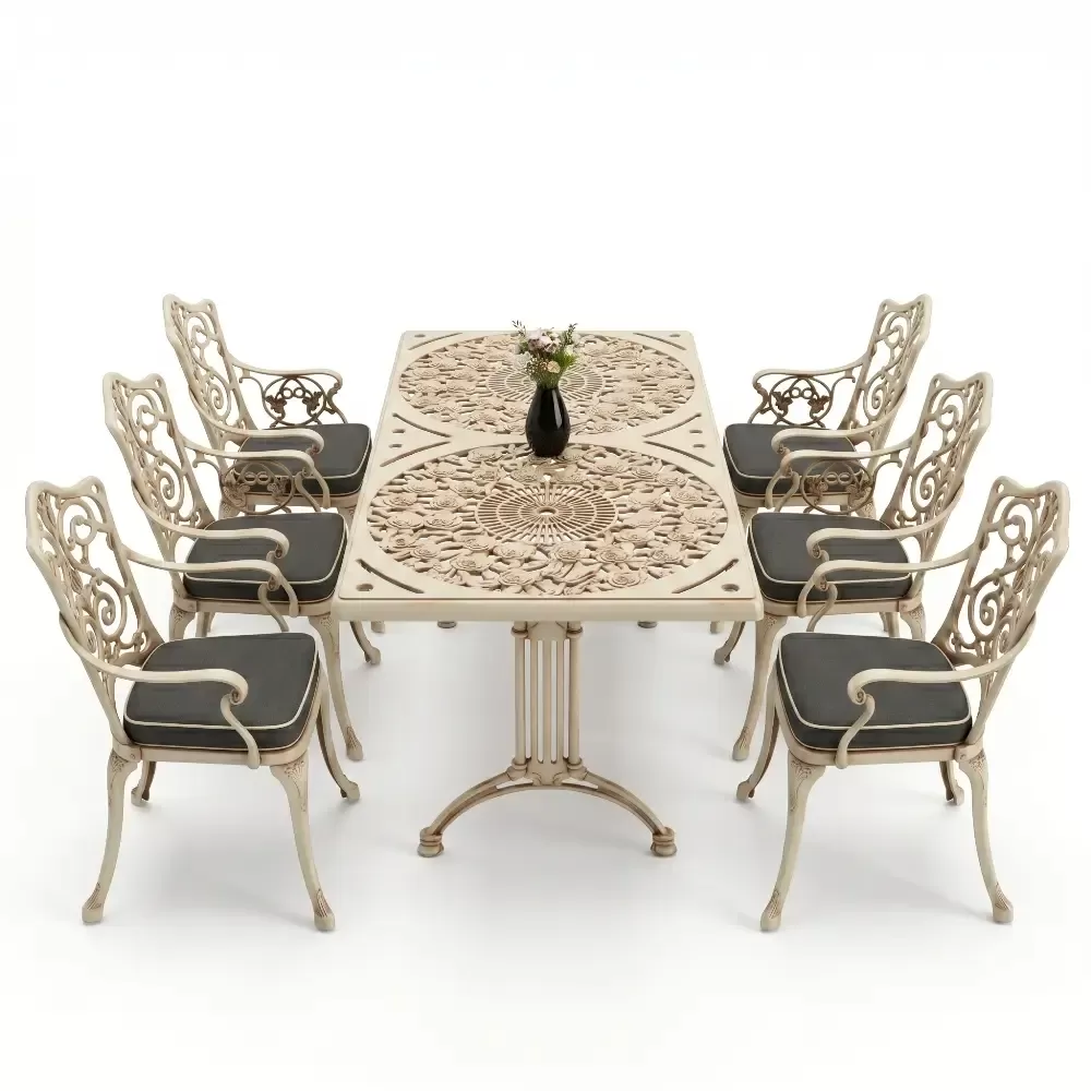 Akbrella tarafindan titizlikle uretilen 101 MHS model ferforje tip aluminyum dokum masa takimi, bahce ve teras dekorasyonunuza sofistike bir hava katmak icin tasarlandi. Klasik motiflerin modern döküm teknikleriyle bulustugu bu set, hafif yapisina ragmen yuksek dayaniklilik sergileyerek dis mekan mobilyasinda beklediginiz tum ihtiyaclari karsilar.