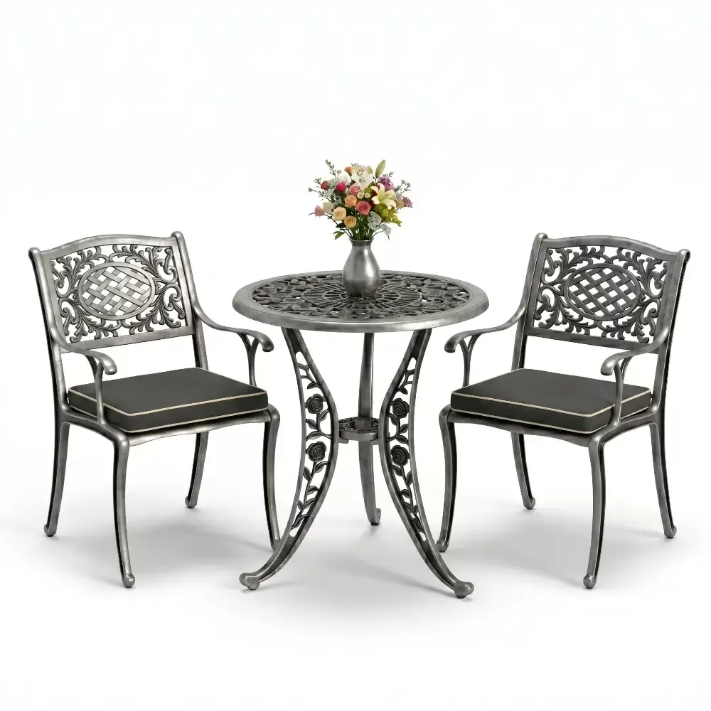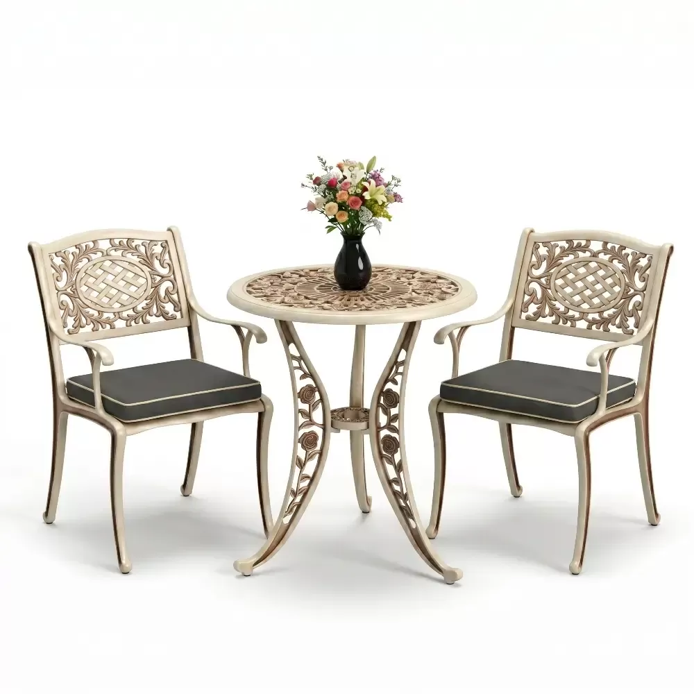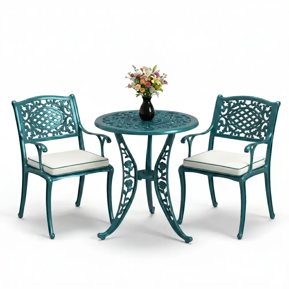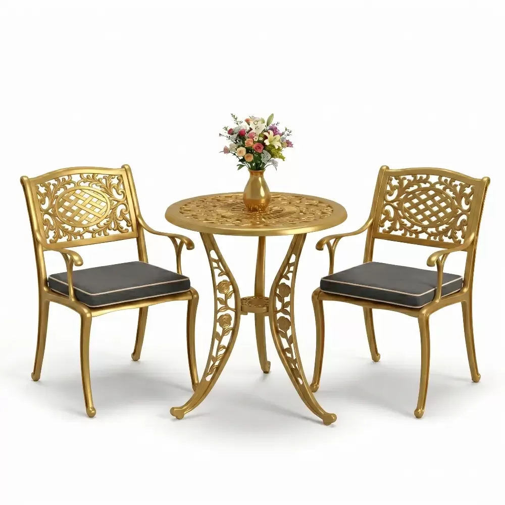 Yüksek kaliteli alüminyum döküm malzemeden üretilen bu takım, doğa şartlarına karşı tam direnç gösterecek şekilde tasarlanmıştır. Demir mobilyaların aksine paslanma ve korozyon riski barındırmaz. Elektrostatik fırın boya teknolojisi ile desteklenen yüzey dokusu; UV ışınlarına, aşırı sıcaklara ve nemli ortamlara karşı üstün koruma sağlayarak ürünün ilk günkü zarafetini uzun yıllar boyunca korumasına yardımcı olur.