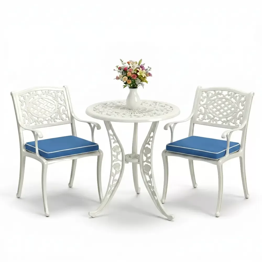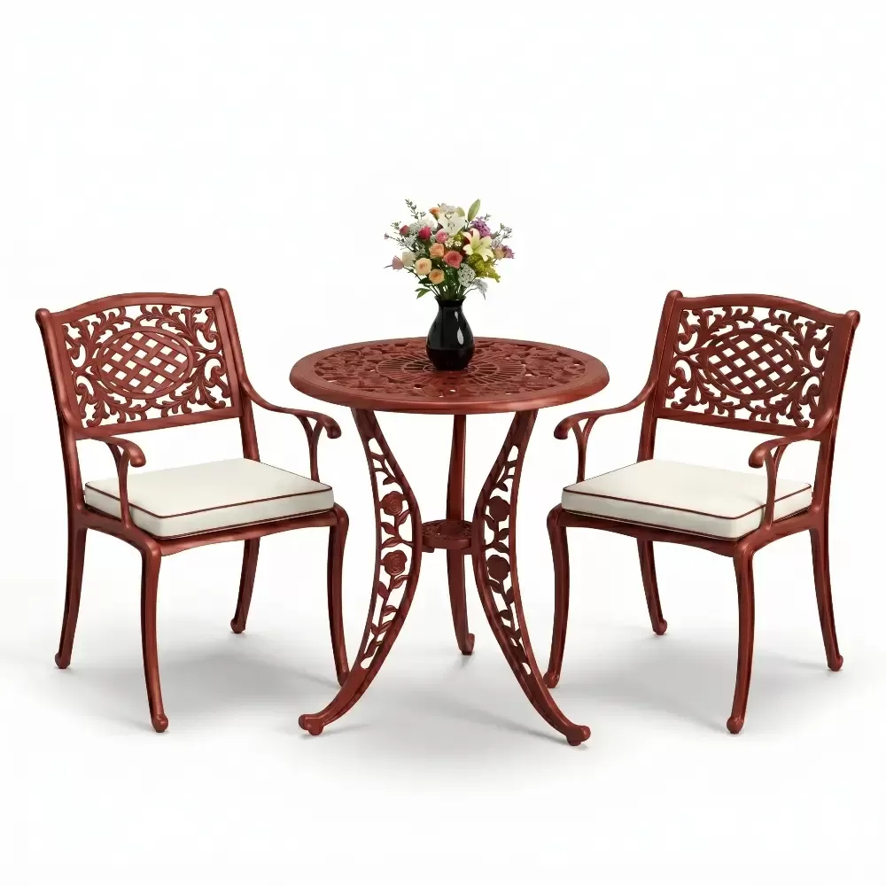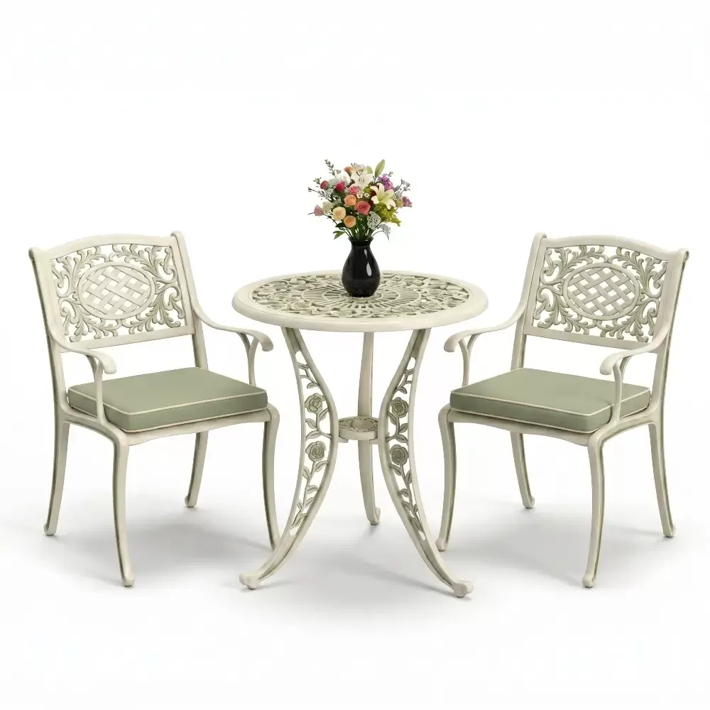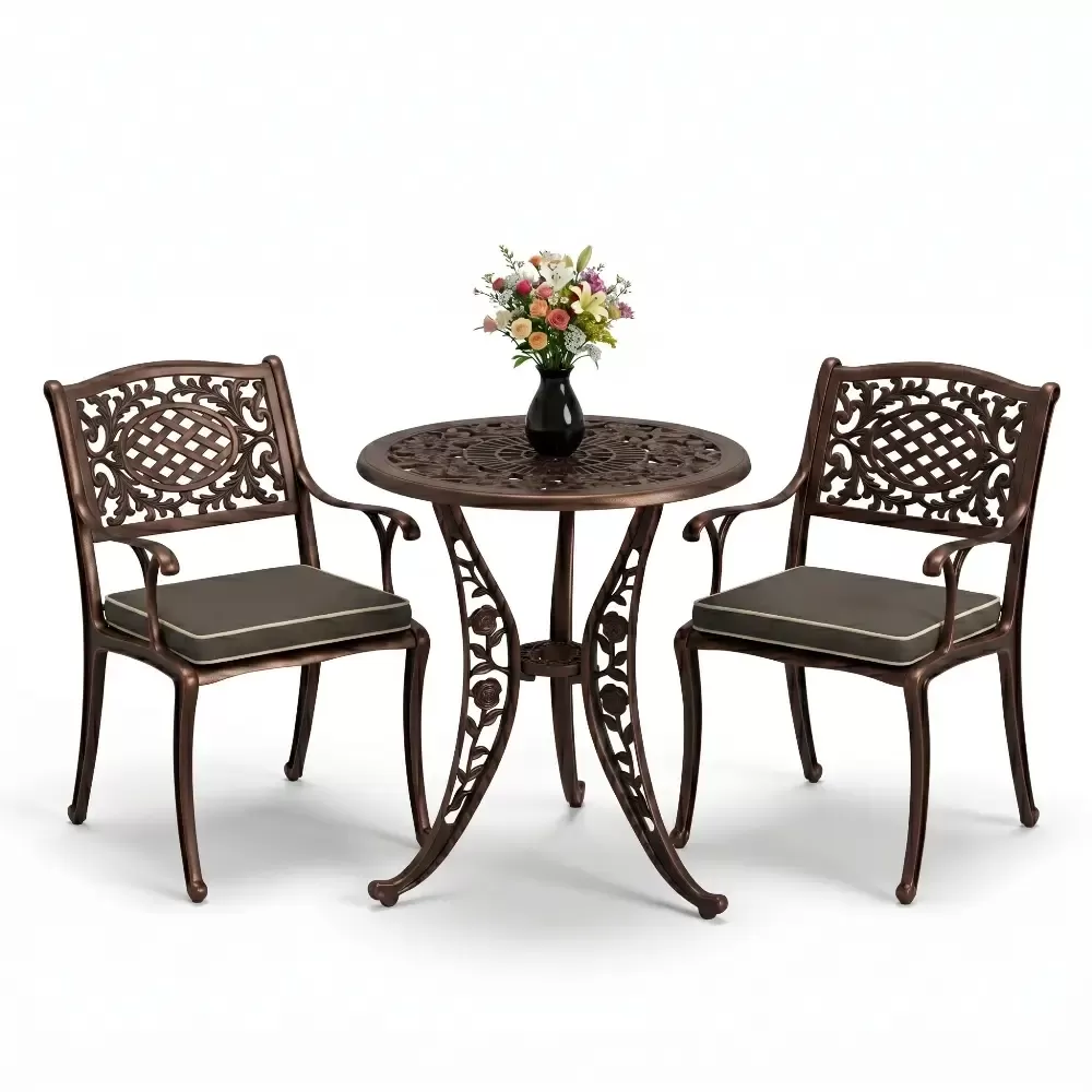 Yüksek kaliteli alüminyum döküm malzemeden üretilen bu takım, doğa şartlarına karşı tam direnç gösterecek şekilde tasarlanmıştır. Demir mobilyaların aksine paslanma ve korozyon riski barındırmaz. Elektrostatik fırın boya teknolojisi ile desteklenen yüzey dokusu; UV ışınlarına, aşırı sıcaklara ve nemli ortamlara karşı üstün koruma sağlayarak ürünün ilk günkü zarafetini uzun yıllar boyunca korumasına yardımcı olur.