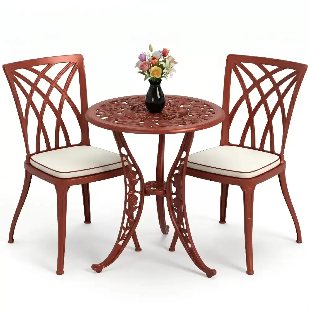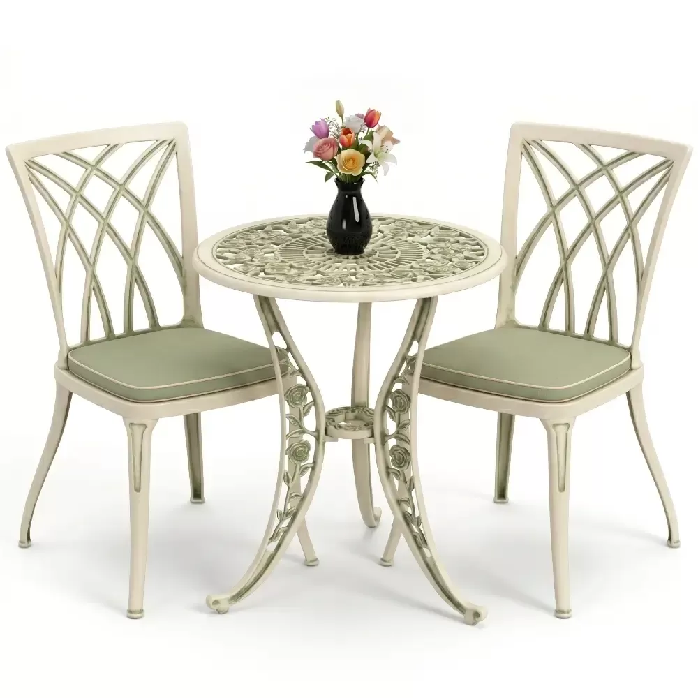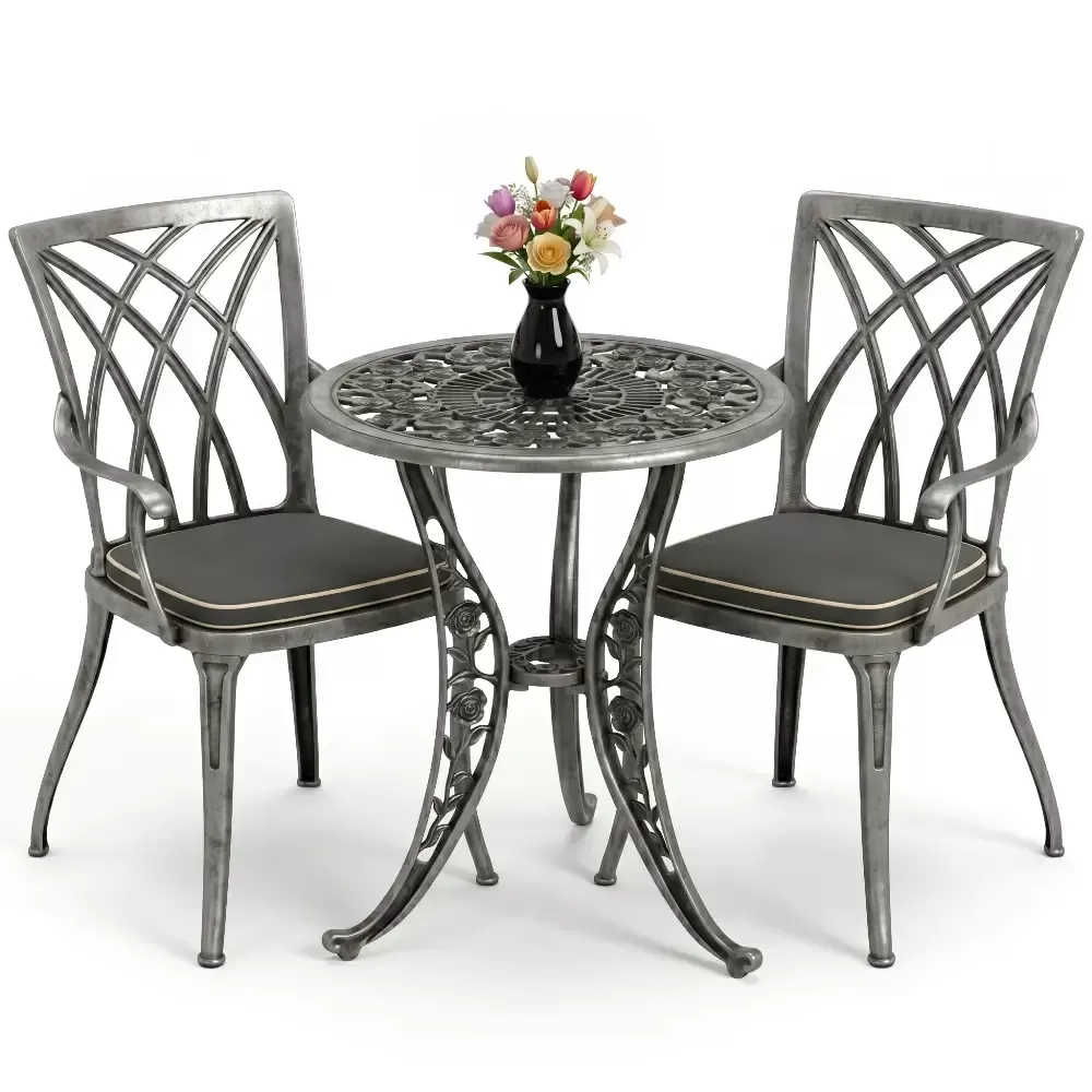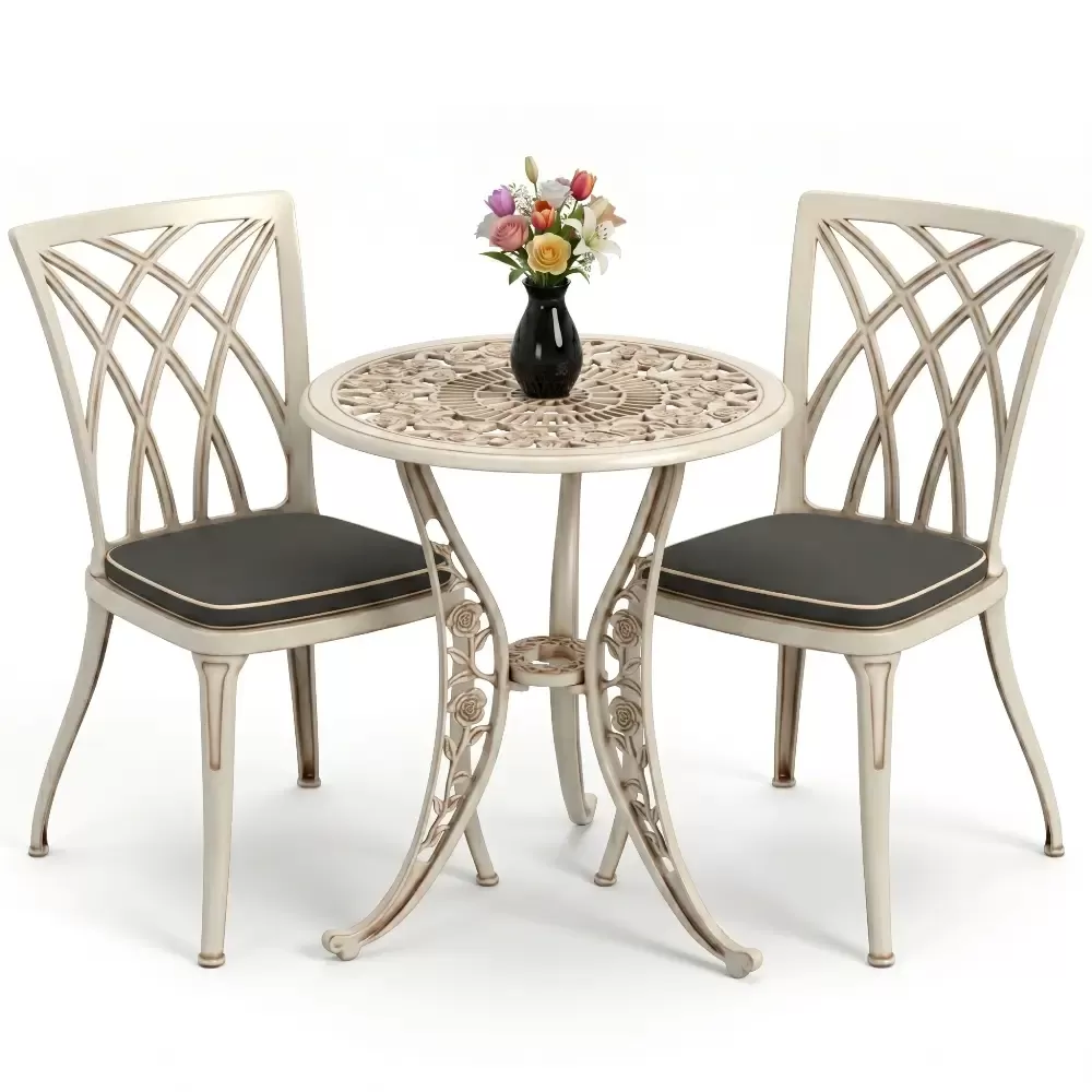 Bahçe, balkon ve teras gibi dış mekan yaşam alanlarınızda hem estetik bir görünüm hem de ömürlük bir kullanım arıyorsanız, Akbrella-nın 27 CAS serisi beklentilerinizi tam anlamıyla karşılar. Klasik ferforje motiflerinin zarafetini alüminyum döküm teknolojisinin hafifliği ve sağlamlığı ile birleştiren bu takım, iki kişilik kullanım için optimize edilmiştir. Yuvarlak hatlara sahip masa tasarımı, küçük alanlarda bile ferah bir oturma düzeni oluştururken mekanınıza premium bir dokunuş katar.