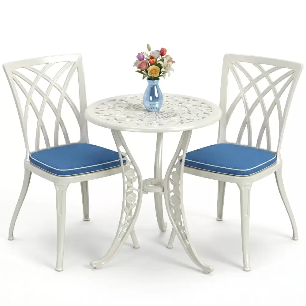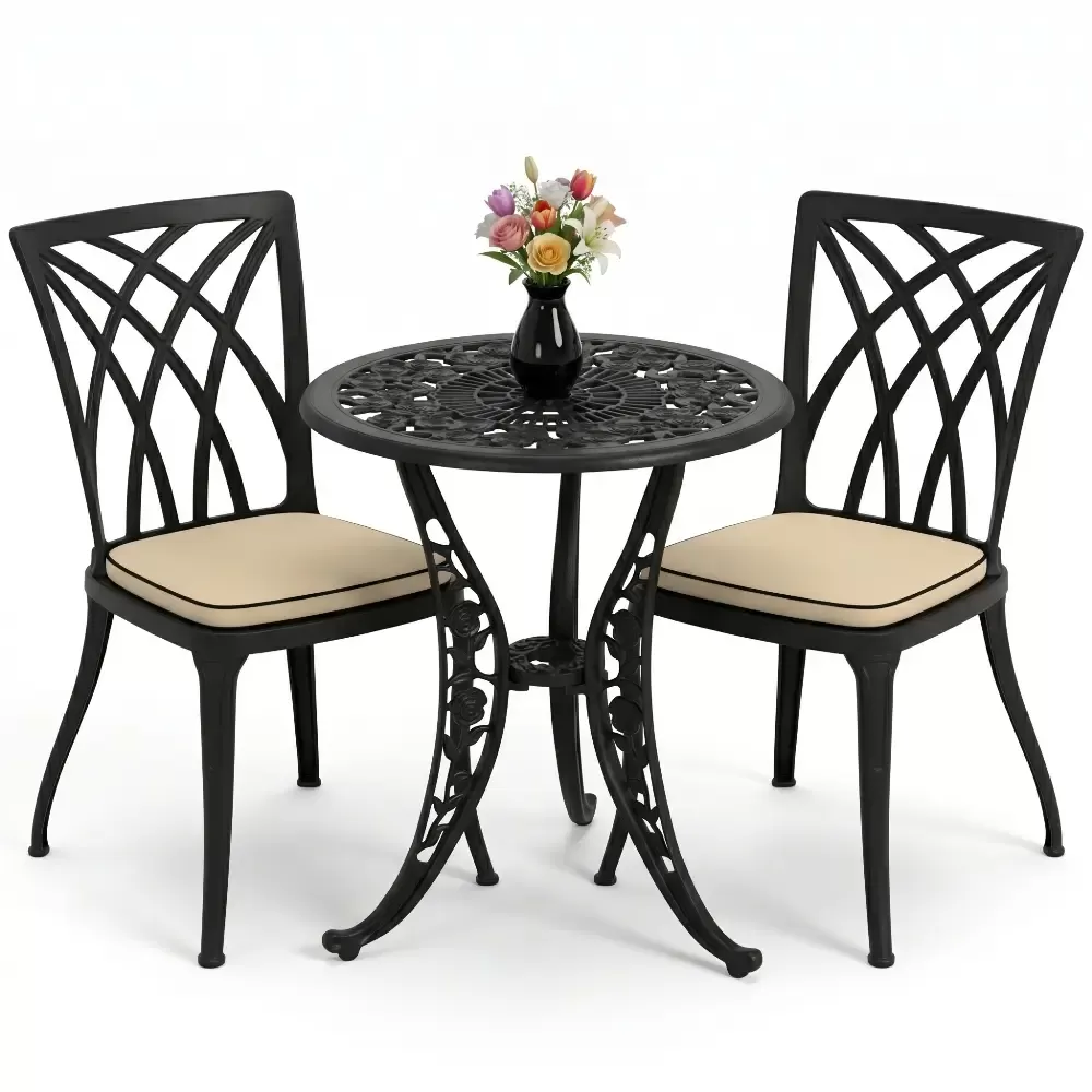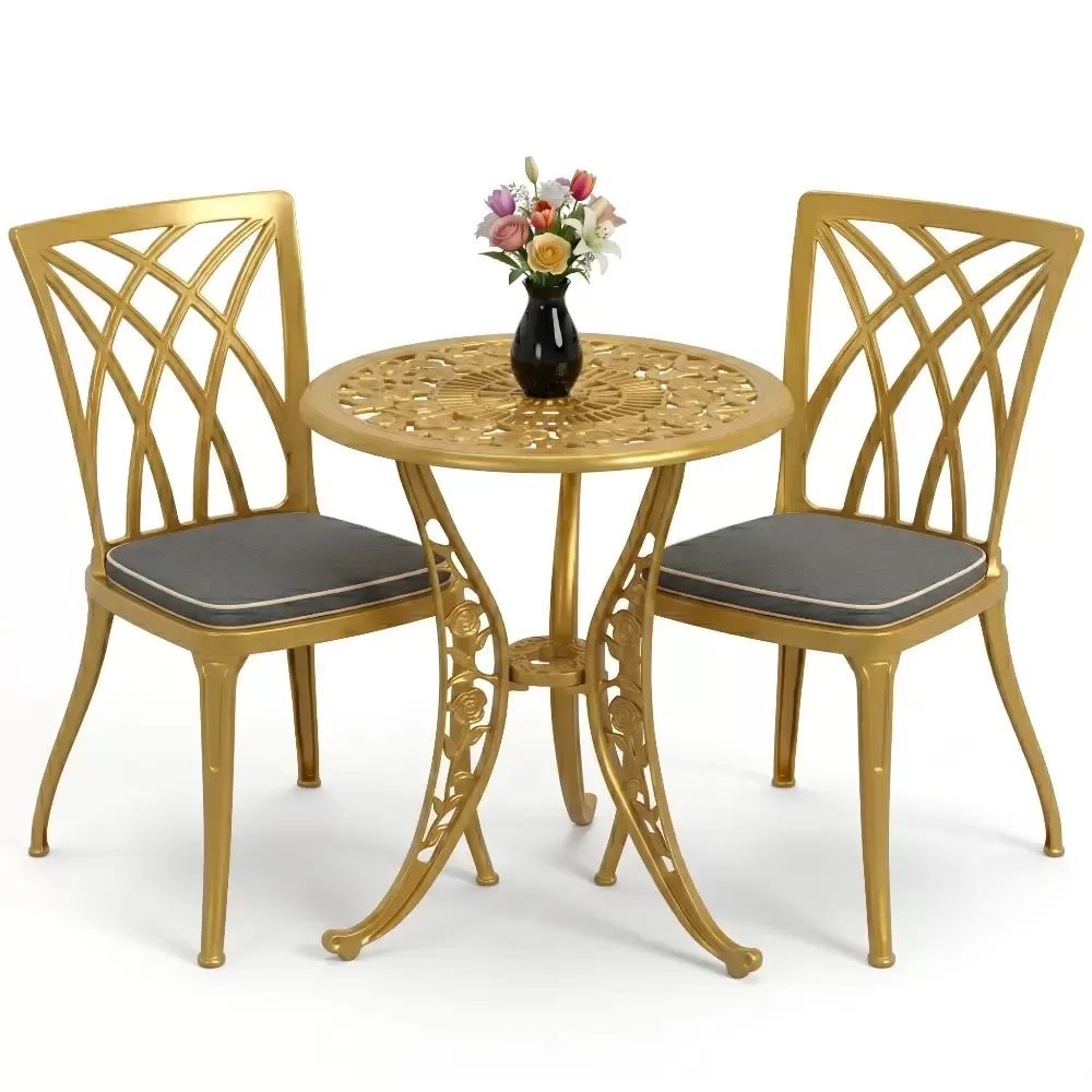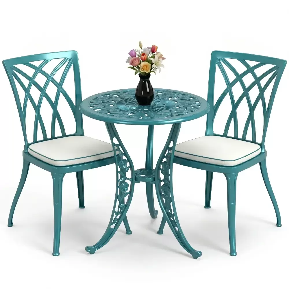Bahçe, balkon ve teras gibi dış mekan yaşam alanlarınızda hem estetik bir görünüm hem de ömürlük bir kullanım arıyorsanız, Akbrella-nın 27 CAS serisi beklentilerinizi tam anlamıyla karşılar. Klasik ferforje motiflerinin zarafetini alüminyum döküm teknolojisinin hafifliği ve sağlamlığı ile birleştiren bu takım, iki kişilik kullanım için optimize edilmiştir. Yuvarlak hatlara sahip masa tasarımı, küçük alanlarda bile ferah bir oturma düzeni oluştururken mekanınıza premium bir dokunuş katar.