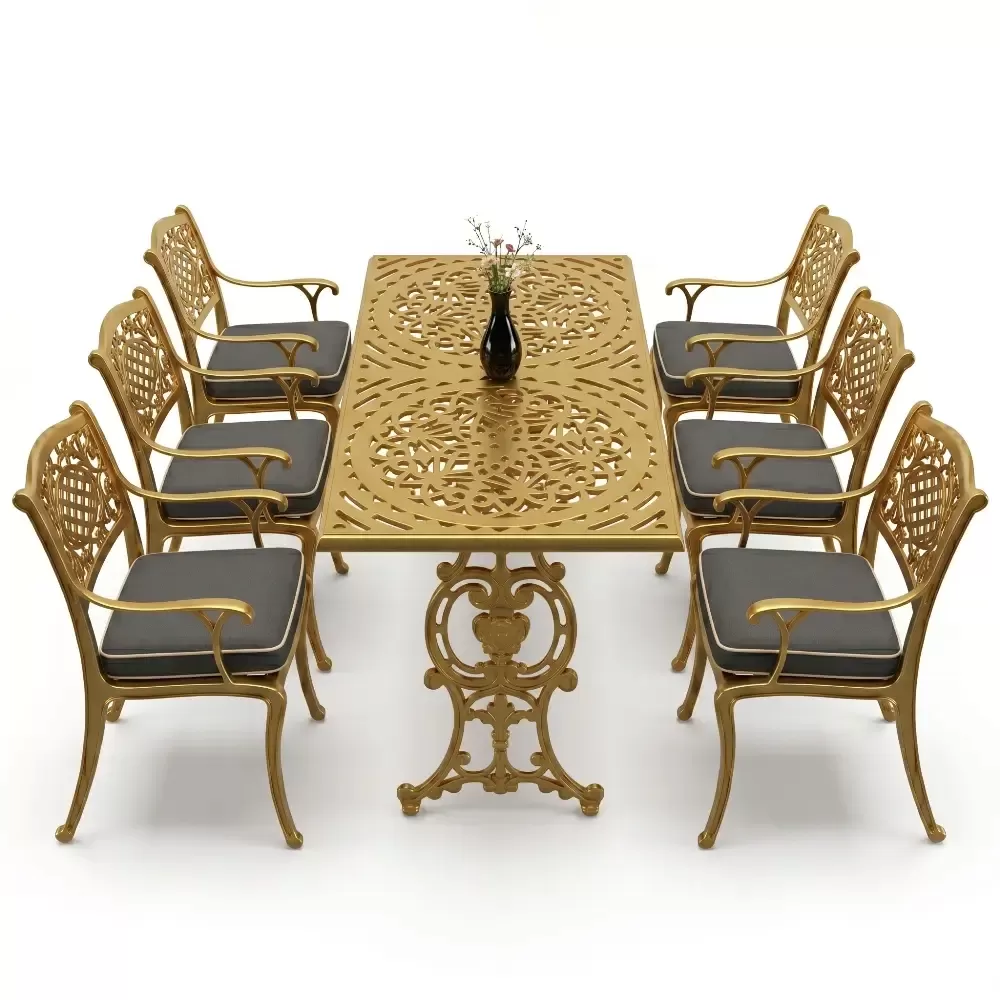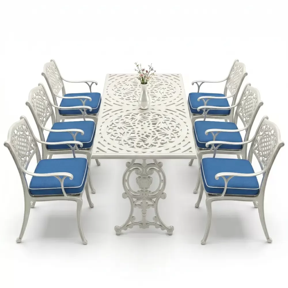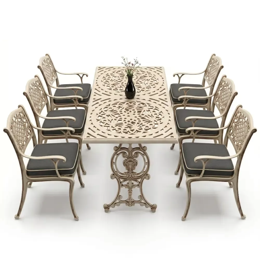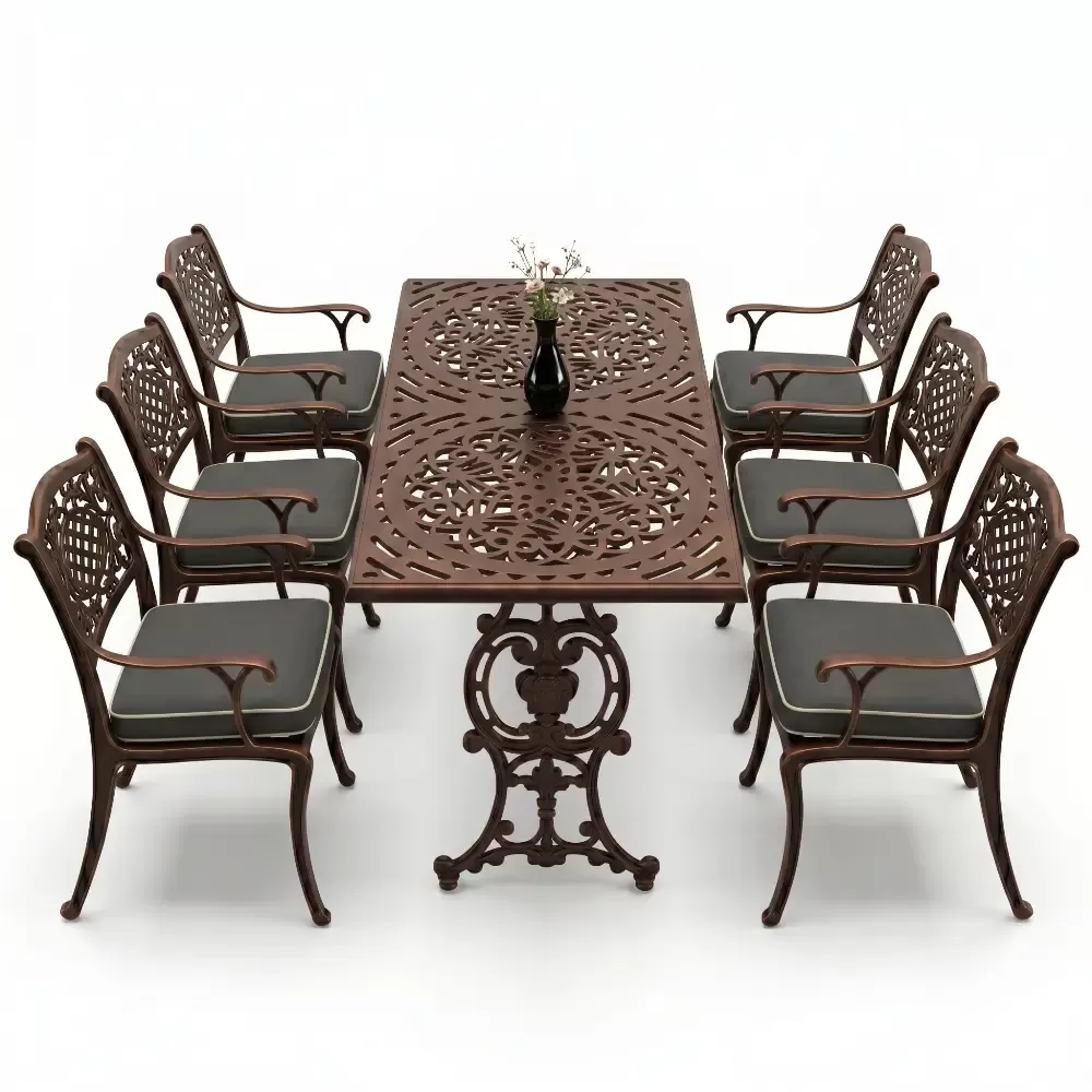 Akbrella imzasini tasiyan 103 MHS model masa takimi, ferforje geleneginin agir ve asil durusunu modern uretim teknolojilerinin hafifligiyle birlestiriyor. Bahce, balkon ve teras gibi acik hava alanlarinda hem dekoratif bir unsur hem de fonksiyonel bir kullanim sunan bu set, uzun yillar boyunca formunu koruyacak sekilde tasarlanmistir. Aluminyum dokum teknolojisi sayesinde paslanmaya karsi tam direncli olan urunumuz, dis mekan mobilyalarinda aranan konforu en ust seviyeye tasiyor.