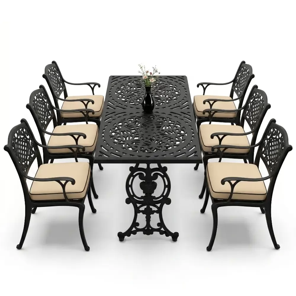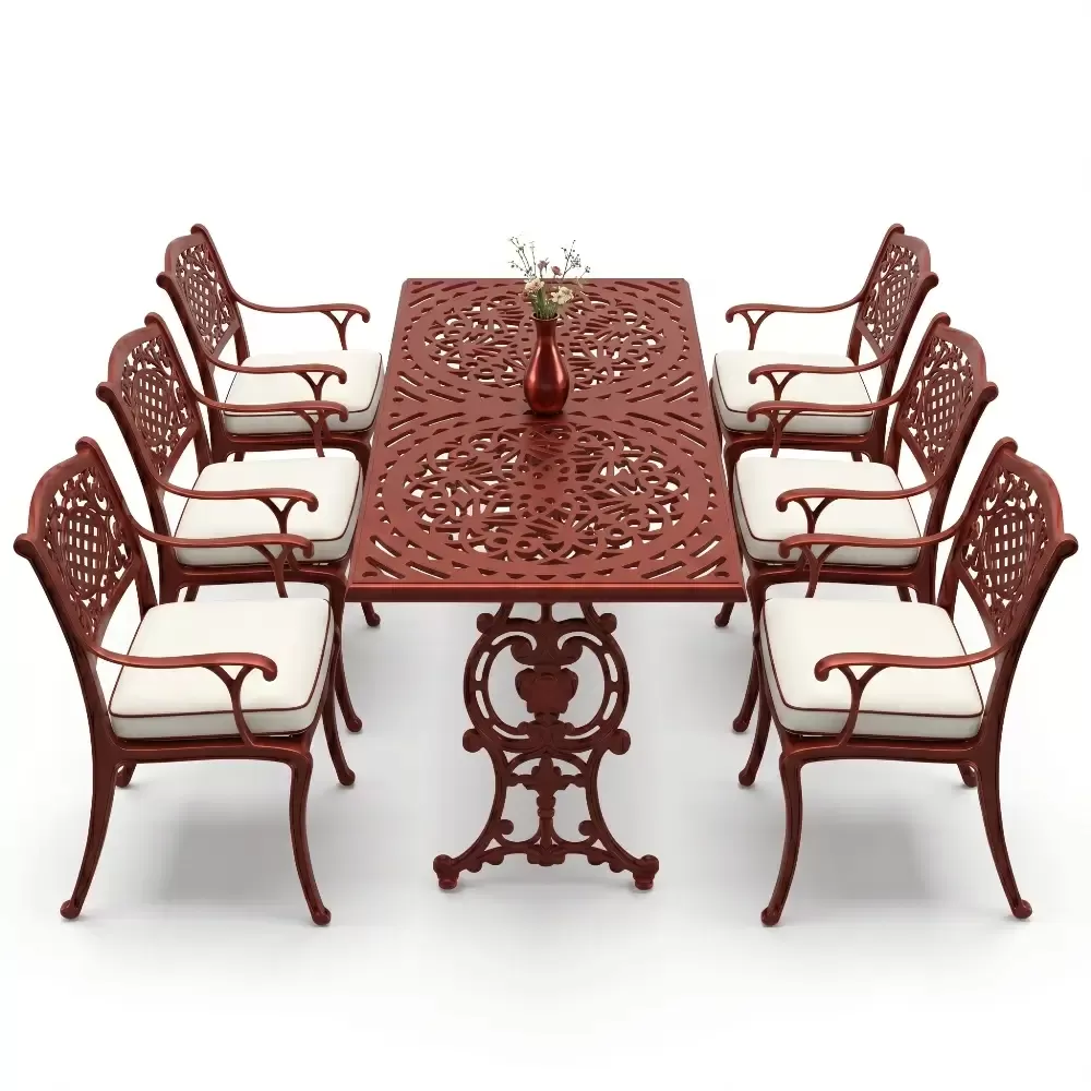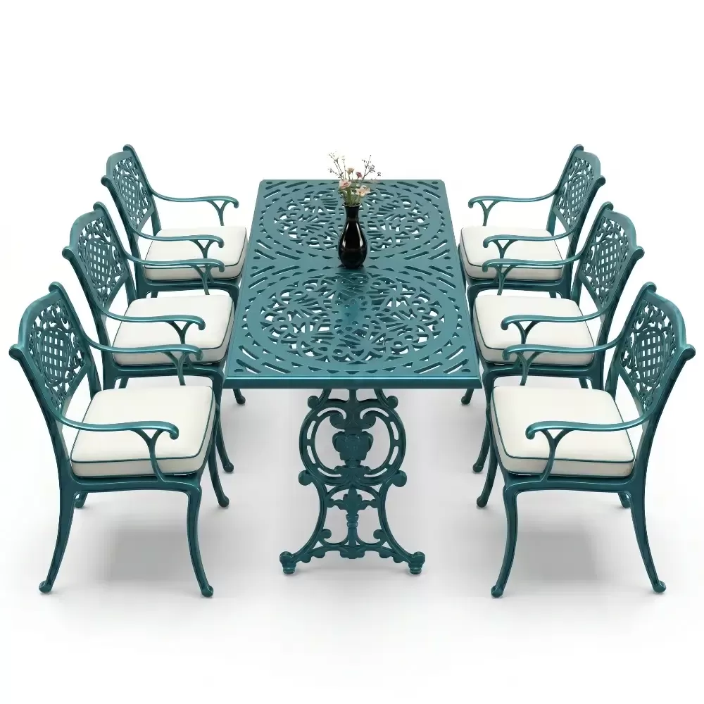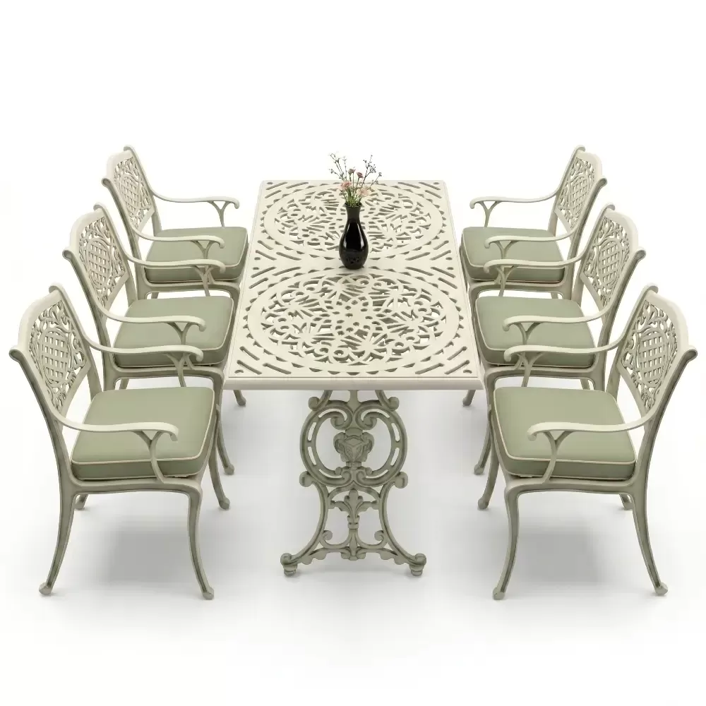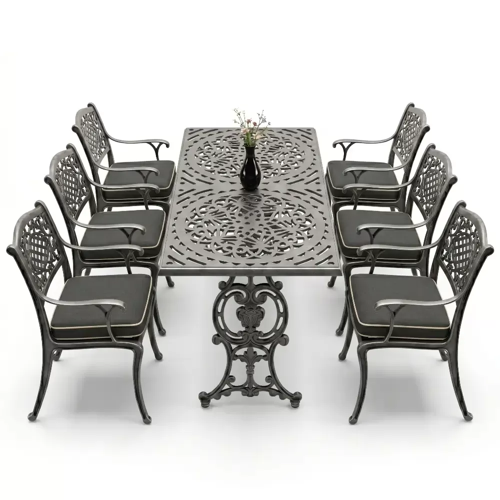 Akbrella imzasini tasiyan 103 MHS model masa takimi, ferforje geleneginin agir ve asil durusunu modern uretim teknolojilerinin hafifligiyle birlestiriyor. Bahce, balkon ve teras gibi acik hava alanlarinda hem dekoratif bir unsur hem de fonksiyonel bir kullanim sunan bu set, uzun yillar boyunca formunu koruyacak sekilde tasarlanmistir. Aluminyum dokum teknolojisi sayesinde paslanmaya karsi tam direncli olan urunumuz, dis mekan mobilyalarinda aranan konforu en ust seviyeye tasiyor.