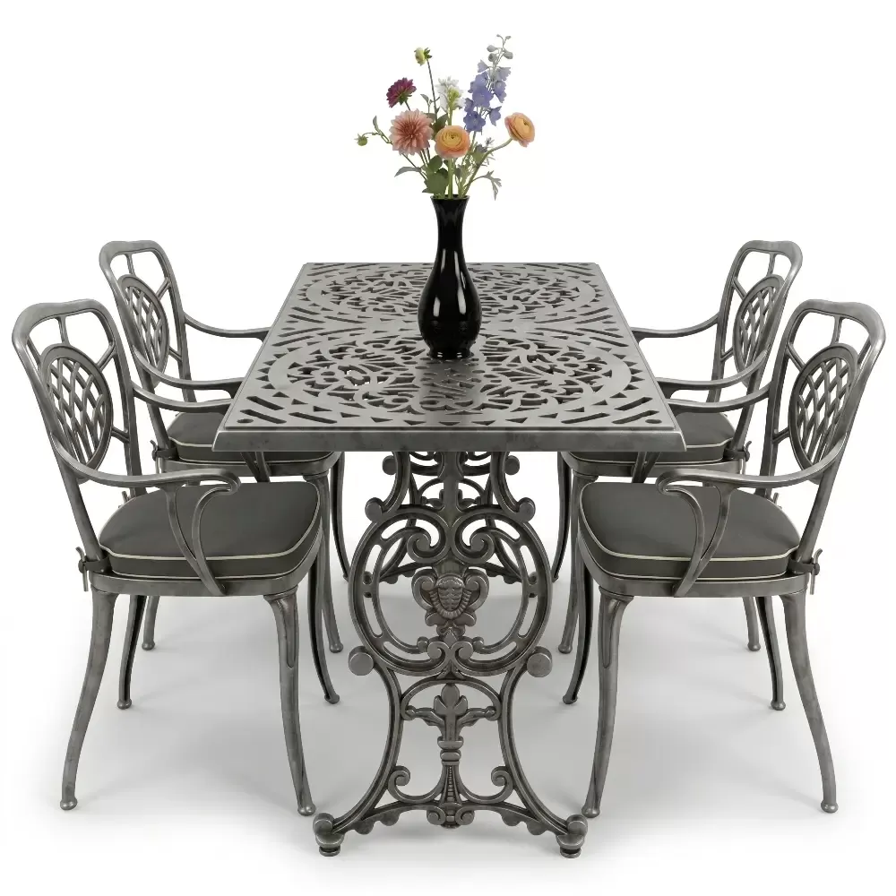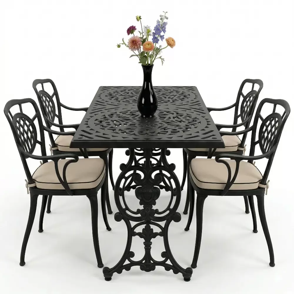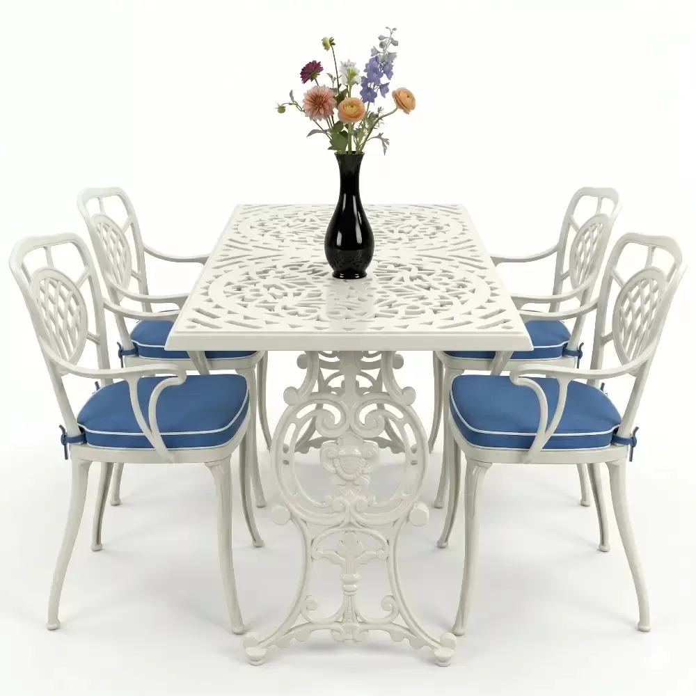 Açık havada geçirilen vakitleri daha sofistike ve ferah bir seviyeye taşıyan 69 MHS alüminyum döküm masa takımı, ferforje sanatının asil hatlarını dikdörtgen formun sağladığı geniş yerleşim imkanıyla birleştiriyor. Akbrella uzmanlığıyla hayata geçirilen bu dört kişilik özel set, 80 cm genişlik ve 160 cm derinlik ölçüleriyle kullanıcısına ferah bir yemek ve sosyal etkileşim alanı vaat eder. Döküm metalin sarsılmaz gücünü asil bir duruşla harmanlayan bu koleksiyon, bahçenizden terasınıza kadar her noktada mekanın prestijini yukarı taşıyan bir mobilya sanatıdır.