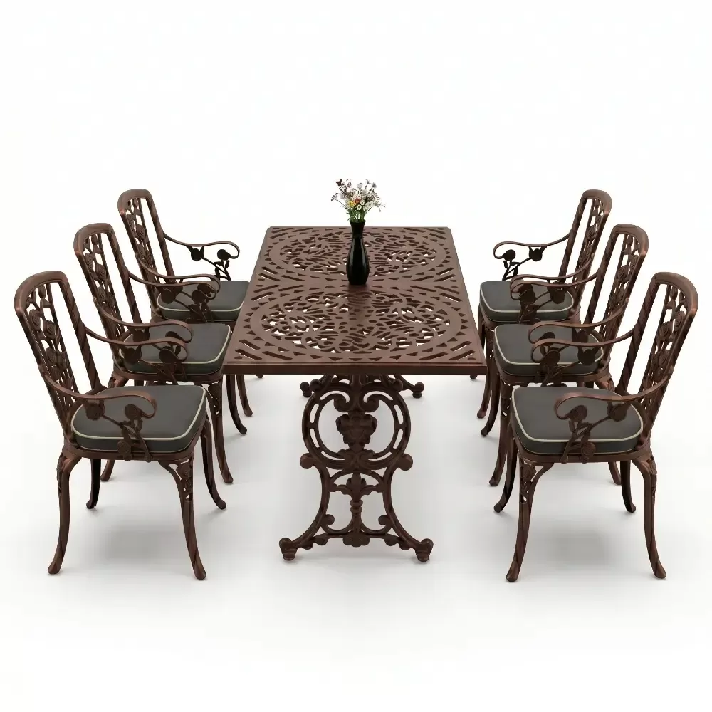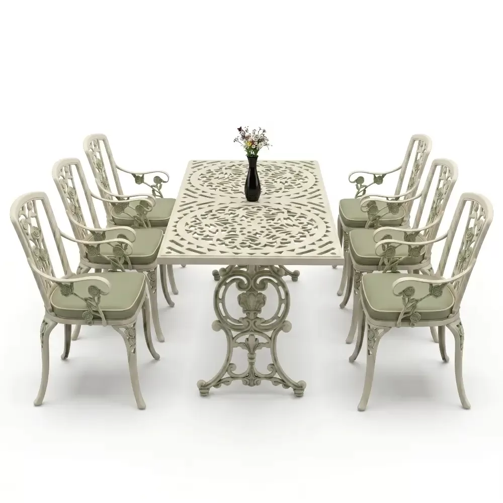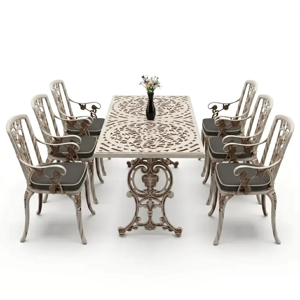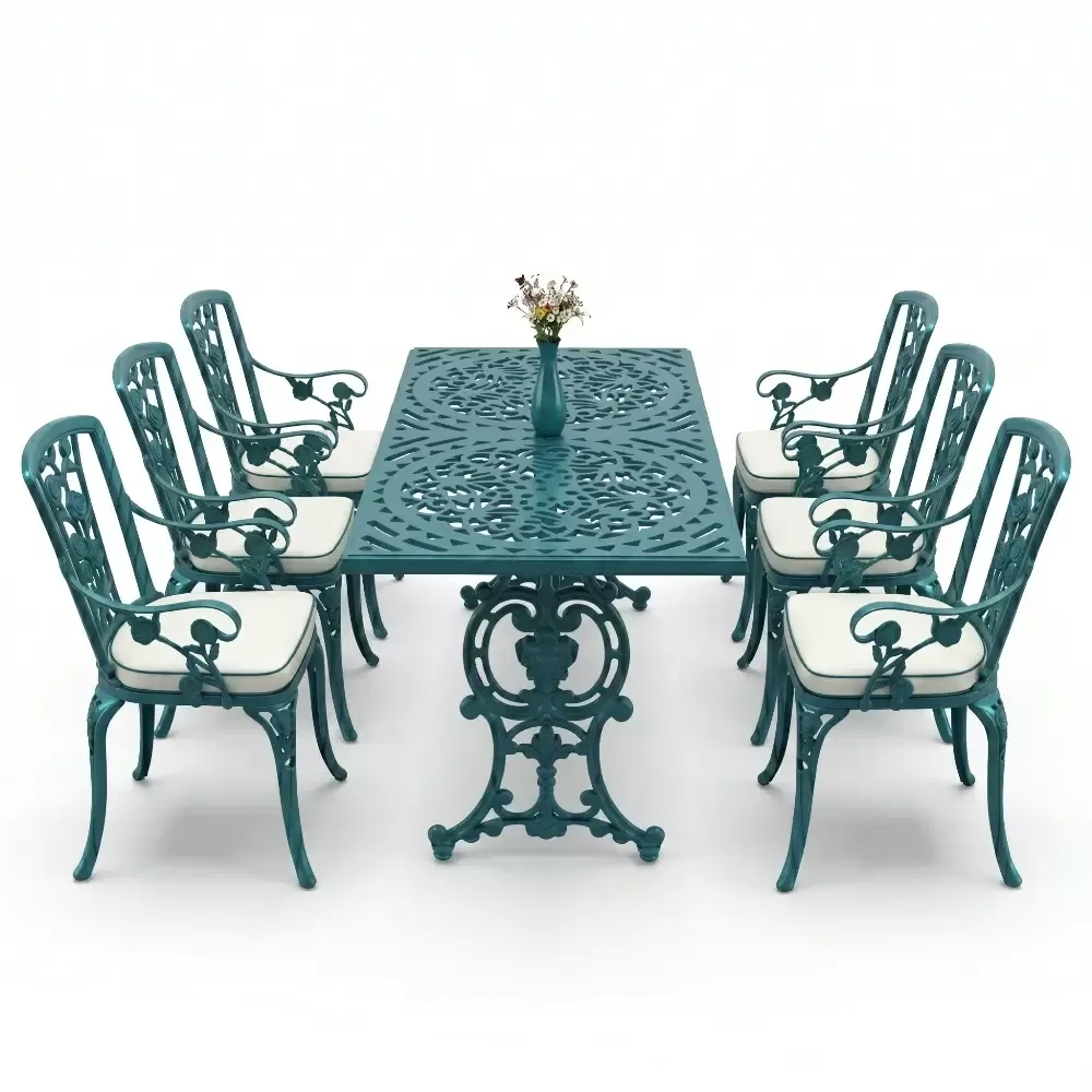 Akbrella uretim tesislerinde yuksek standartlarla hazirlanan 105 MHS model masa takimi, ferforje gorunumunun asaletini aluminyumun hafifligi ve paslanmazlik ozelligiyle harmanliyor. Dikdortgen masa formu, 6 kisilik oturum duzeninde her misafiriniz icin ergonomik ve ferah bir alan tanimlar. Dokum teknolojisinin sundugu ince islemeler, bahce ve teraslarinizda sanatsal bir atmosfer olustururken, urunun saglam yapisi nesiller boyu kullanim vaat eder.