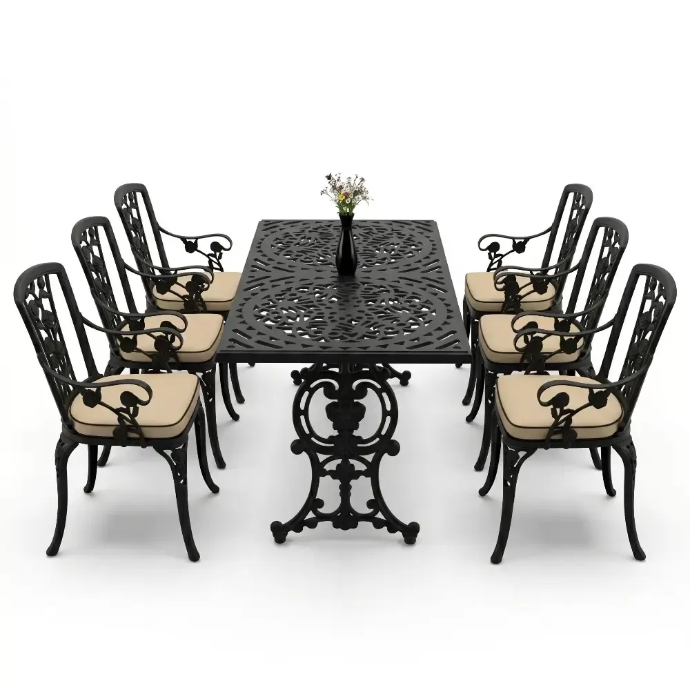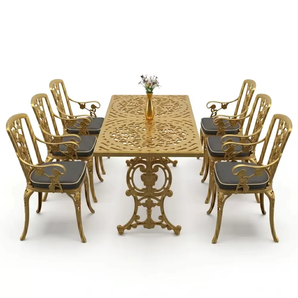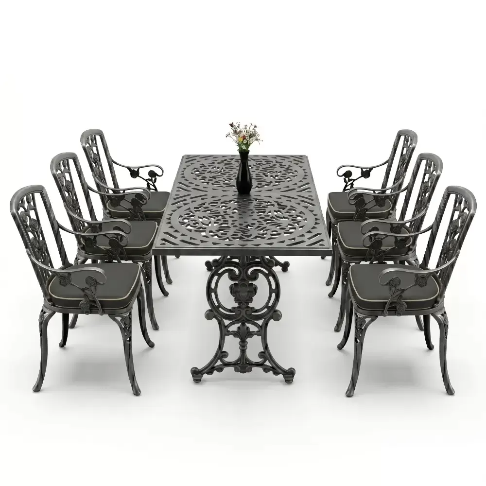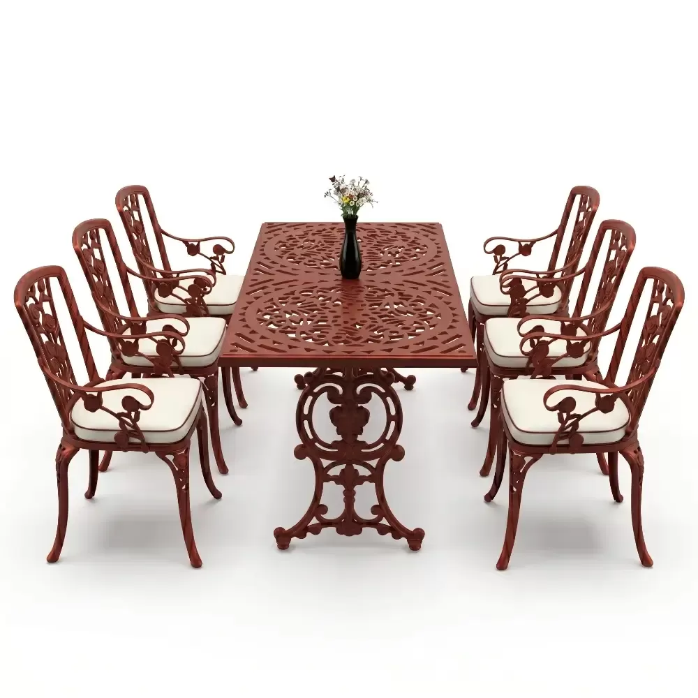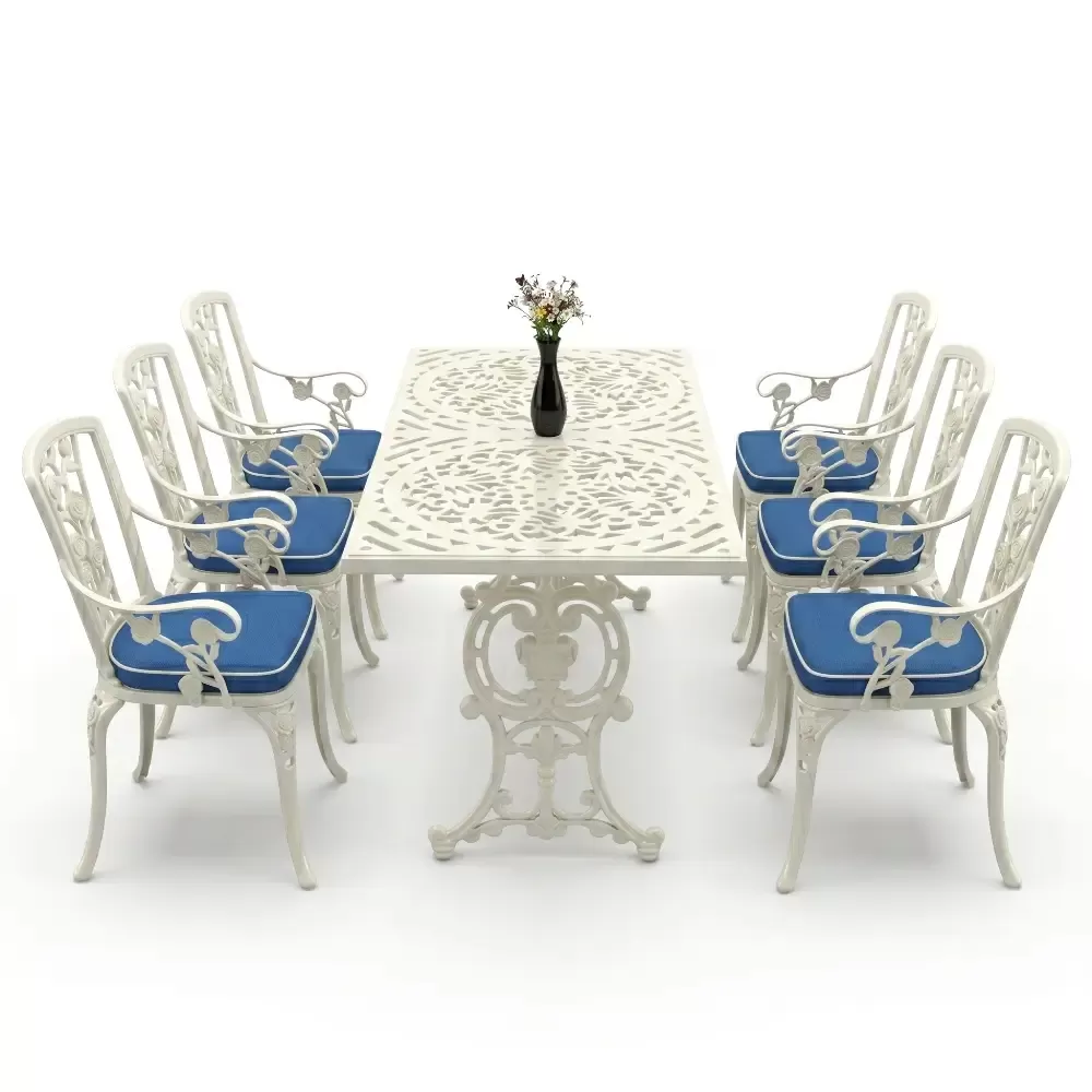 Akbrella uretim tesislerinde yuksek standartlarla hazirlanan 105 MHS model masa takimi, ferforje gorunumunun asaletini aluminyumun hafifligi ve paslanmazlik ozelligiyle harmanliyor. Dikdortgen masa formu, 6 kisilik oturum duzeninde her misafiriniz icin ergonomik ve ferah bir alan tanimlar. Dokum teknolojisinin sundugu ince islemeler, bahce ve teraslarinizda sanatsal bir atmosfer olustururken, urunun saglam yapisi nesiller boyu kullanim vaat eder.