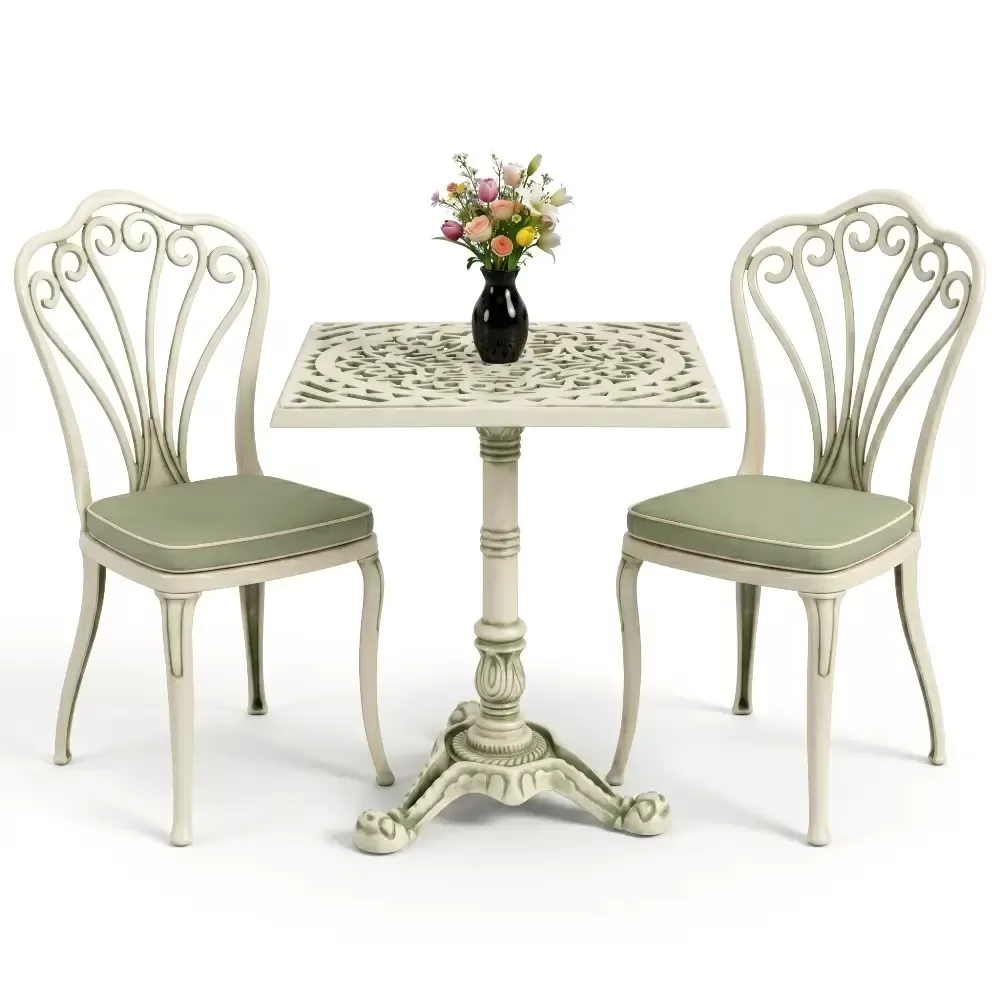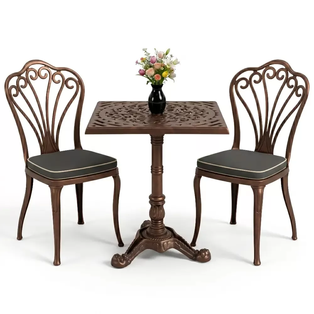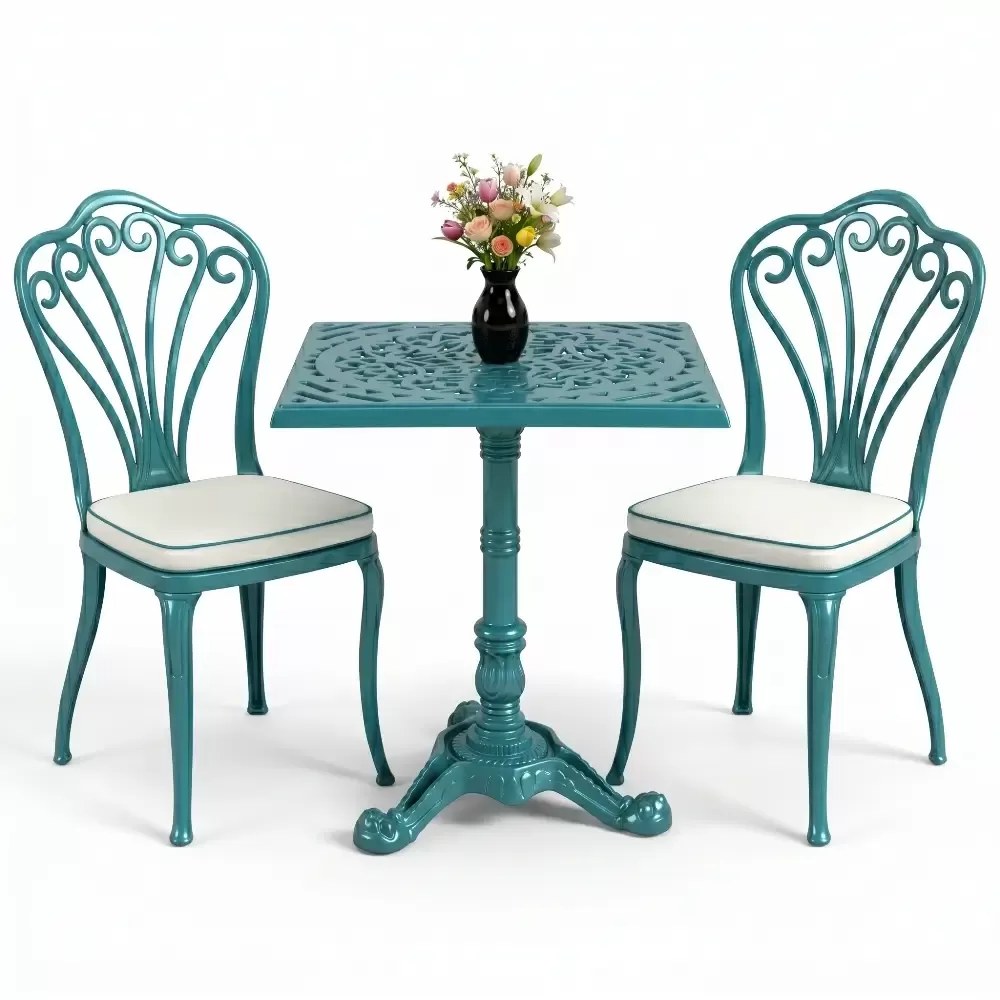 Yüksek kaliteli alüminyum döküm malzemeden üretilen bu takım, doğa şartlarına karşı tam direnç gösterecek şekilde tasarlanmıştır. Demir mobilyaların aksine paslanma ve korozyon riski barındırmaz. Elektrostatik fırın boya teknolojisi ile desteklenen yüzey dokusu; UV ışınlarına, aşırı sıcaklara ve nemli ortamlara karşı üstün koruma sağlayarak ürünün ilk günkü zarafetini uzun yıllar boyunca korumasına yardımcı olur.