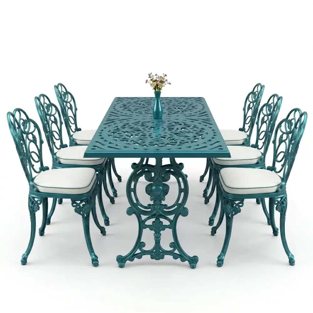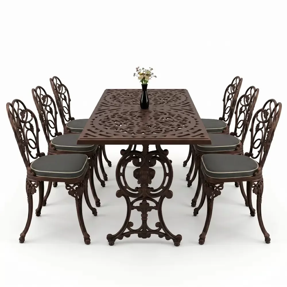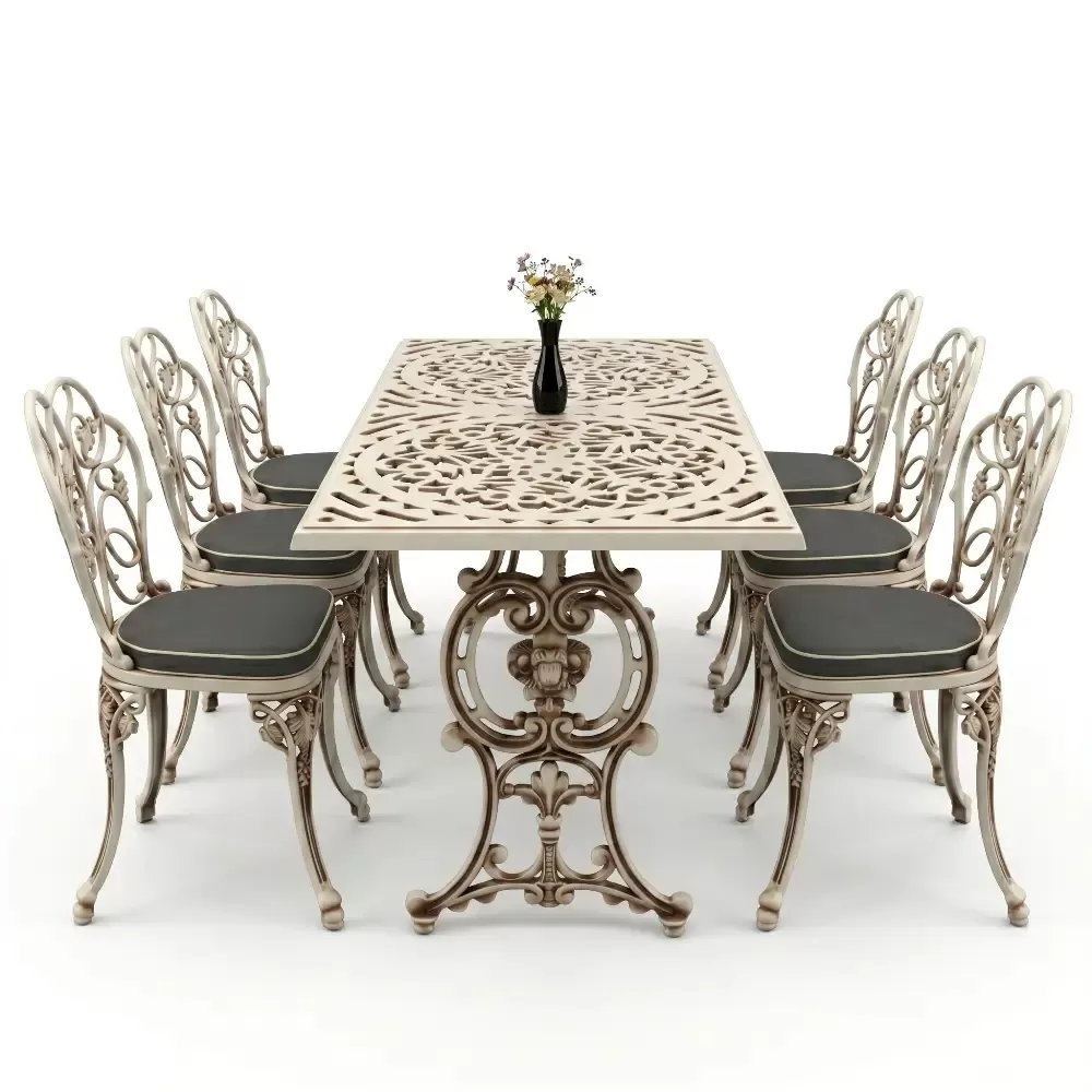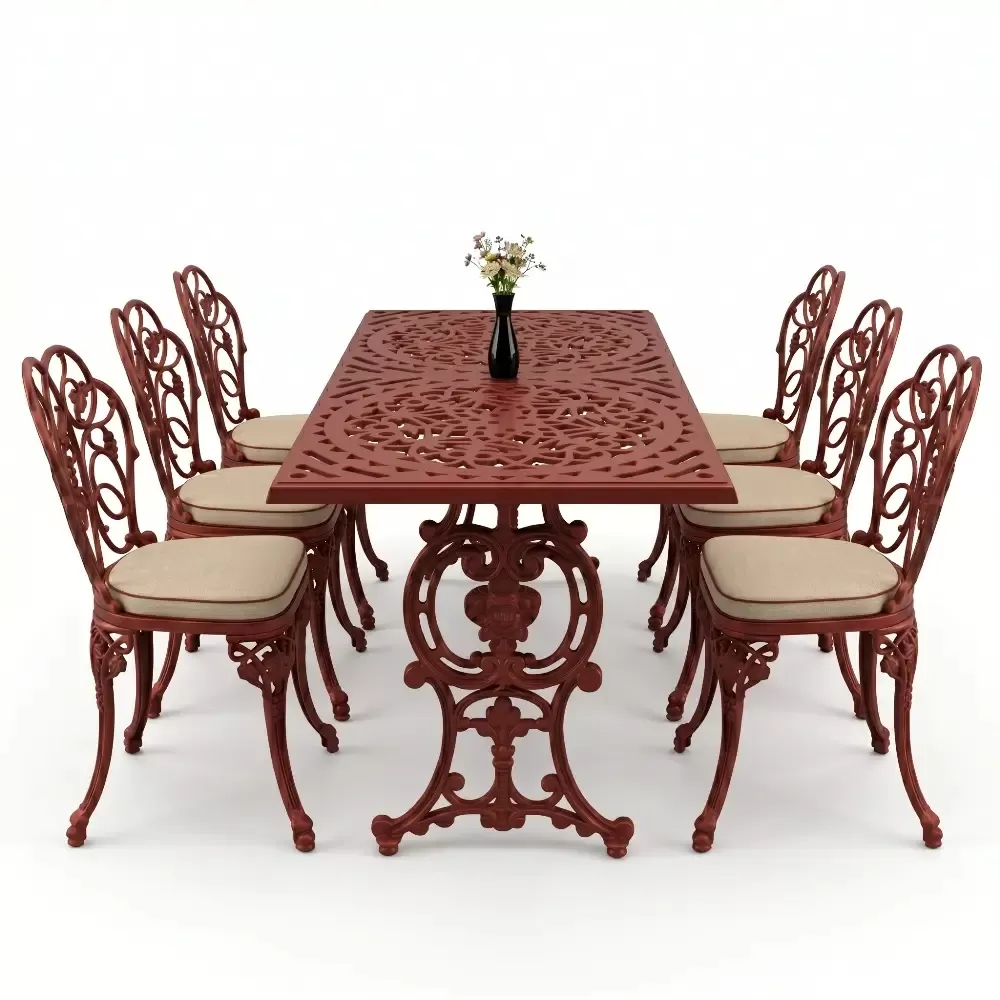 Akbrella dış mekan koleksiyonunun seçkin bir parçası olan 108 MHS modeli, bahçenizde veya terasınızda klasik ferforje estetiğini yaşatırken, modern malzemenin sunduğu hafiflik ve dayanıklılık avantajlarını kapınıza getiriyor. Altı kişilik geniş oturma kapasitesiyle tasarlanan bu takım, dikdörtgen formdaki masası ve ergonomik sandalyeleriyle uzun süreli yemek keyifleri için optimize edilmiştir. Her bir ayrıntısı özenle işlenen döküm motifleri, mekanınıza sanatsal bir derinlik kazandırır.