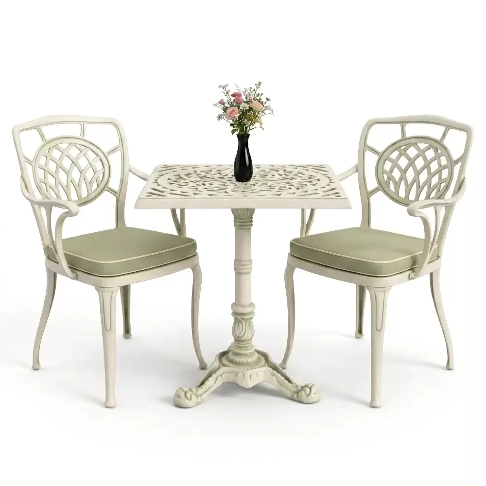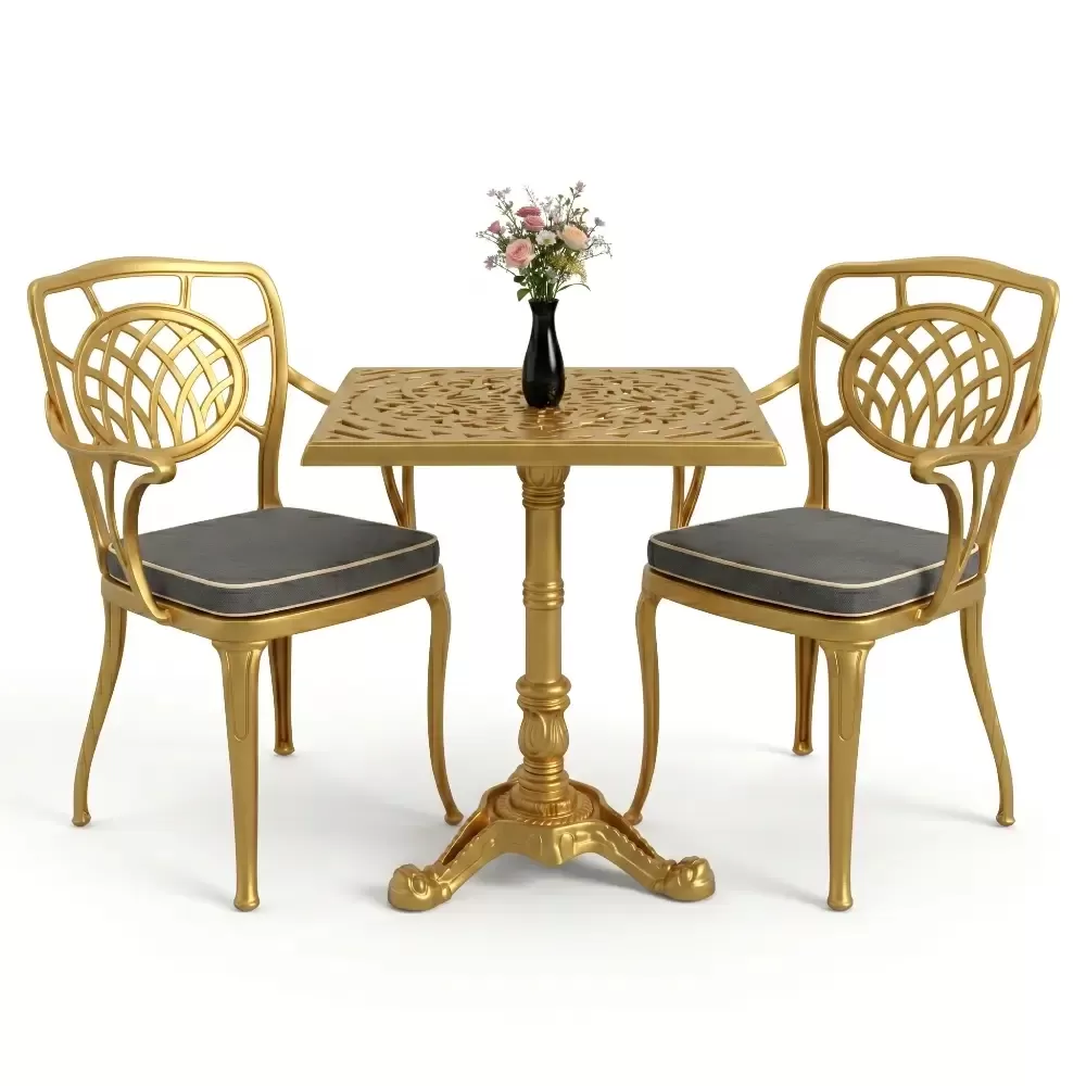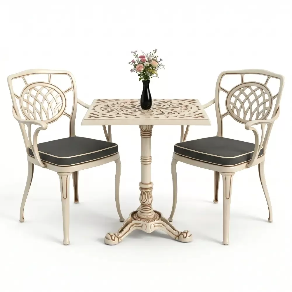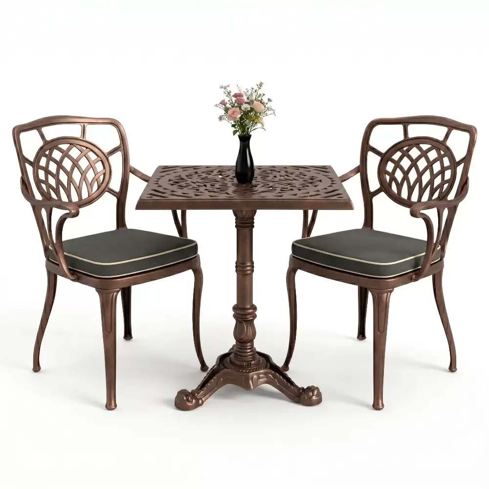 Yüksek kaliteli alüminyum döküm malzemeden üretilen bu takım, doğa şartlarına karşı tam direnç gösterecek şekilde tasarlanmıştır. Demir mobilyaların aksine paslanma ve korozyon riski barındırmaz. Elektrostatik fırın boya teknolojisi ile desteklenen yüzey dokusu; UV ışınlarına, aşırı sıcaklara ve nemli ortamlara karşı üstün koruma sağlayarak ürünün ilk günkü zarafetini uzun yıllar boyunca korumasına yardımcı olur.
