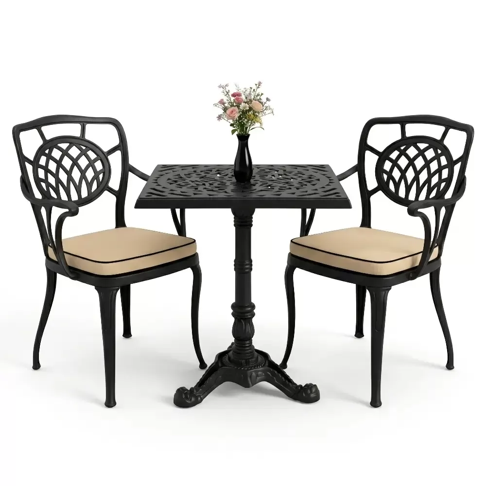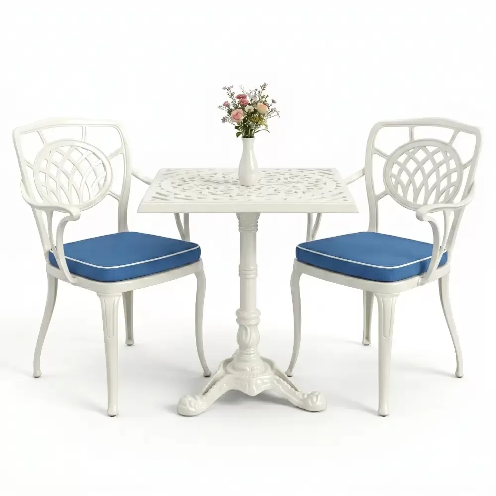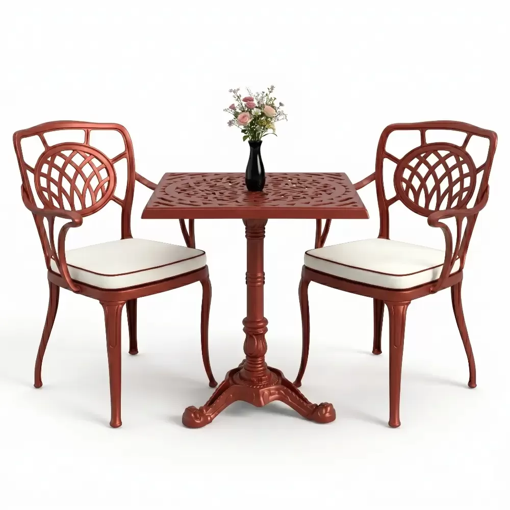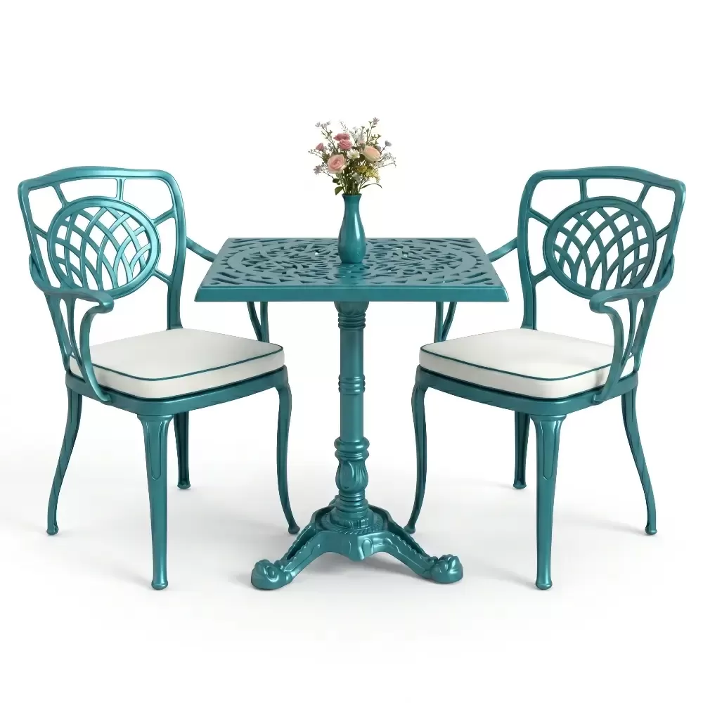 Yüksek kaliteli alüminyum döküm malzemeden üretilen bu takım, doğa şartlarına karşı tam direnç gösterecek şekilde tasarlanmıştır. Demir mobilyaların aksine paslanma ve korozyon riski barındırmaz. Elektrostatik fırın boya teknolojisi ile desteklenen yüzey dokusu; UV ışınlarına, aşırı sıcaklara ve nemli ortamlara karşı üstün koruma sağlayarak ürünün ilk günkü zarafetini uzun yıllar boyunca korumasına yardımcı olur.