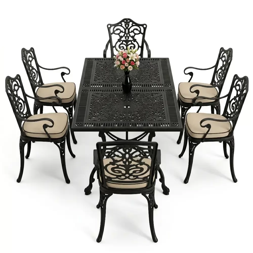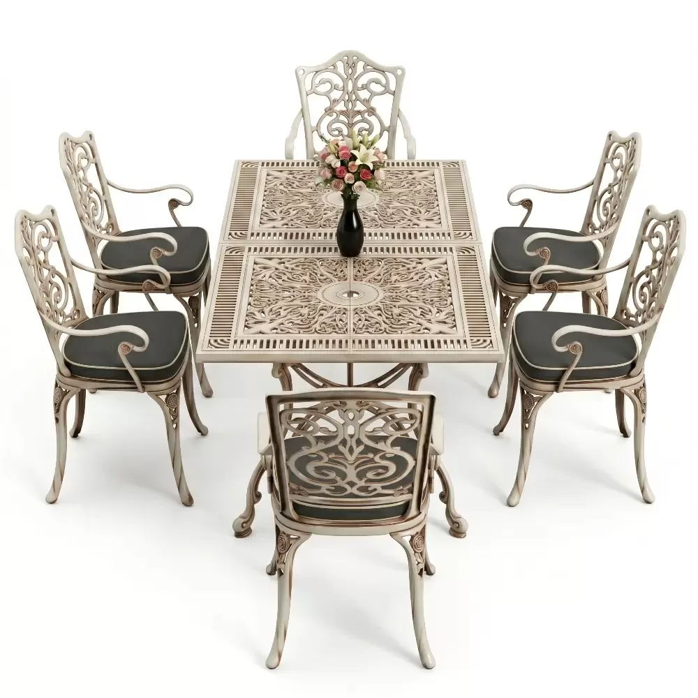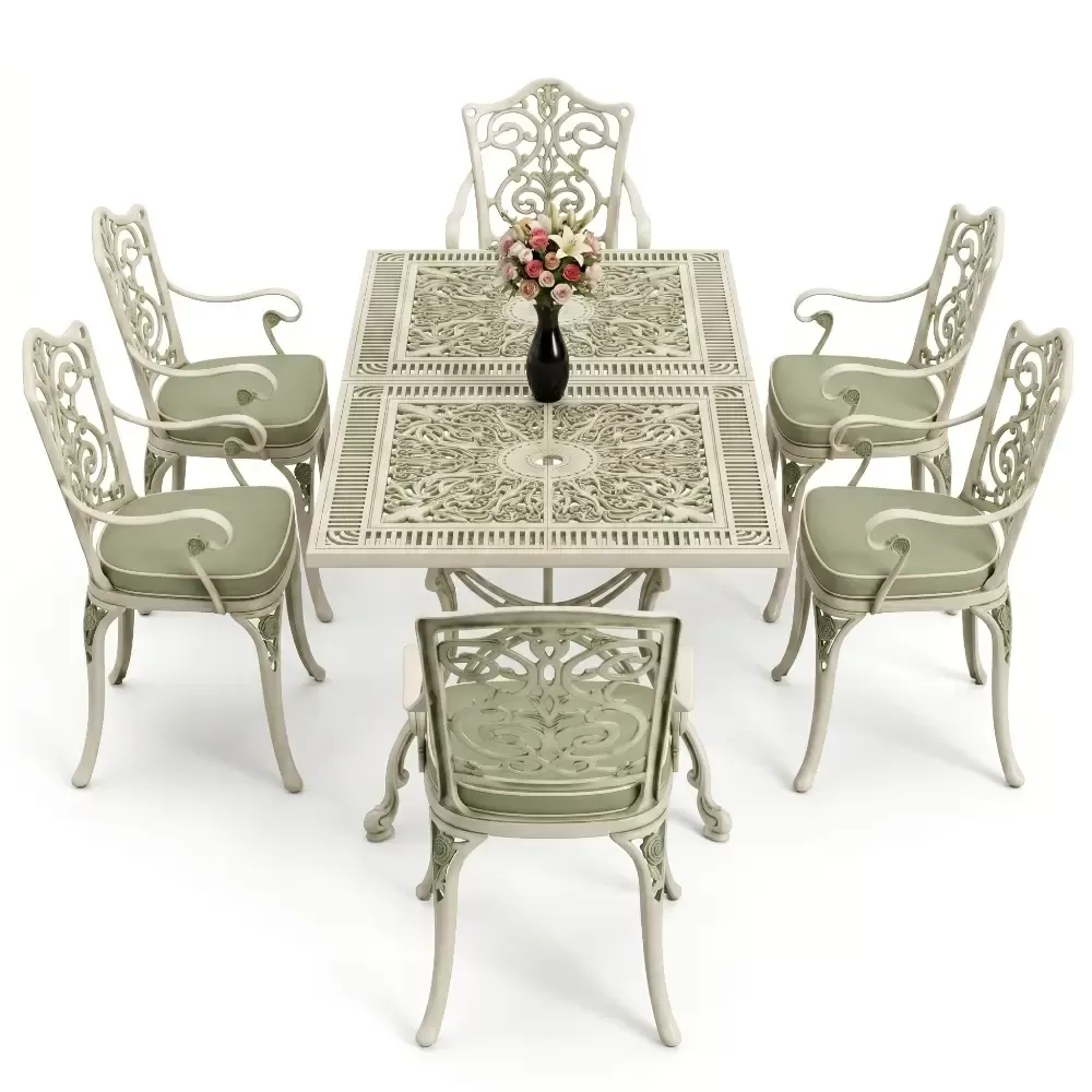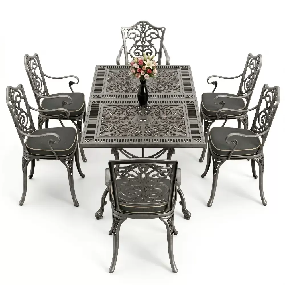 Akbrella dış mekan koleksiyonunun en yeni ve geniş hacimli üyelerinden olan 111 MHS yemek takımı, ferforje estetiğini alüminyum dökümün sarsılmaz dayanıklılığıyla harmanlar. Altı kişilik bu seçkin takım, dikdörtgen formdaki geniş masasıyla sosyal etkileşimlerinize konforlu bir zemin hazırlar. Alüminyum malzemenin doğal paslanmazlık özelliği, sanatsal döküm motifleriyle birleşerek bahçenizde veya terasınızda nesiller boyu sürecek bir mirasın parçası olur.