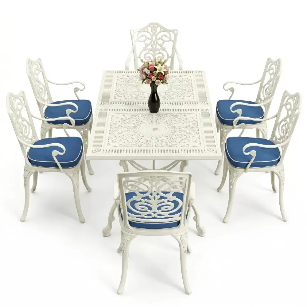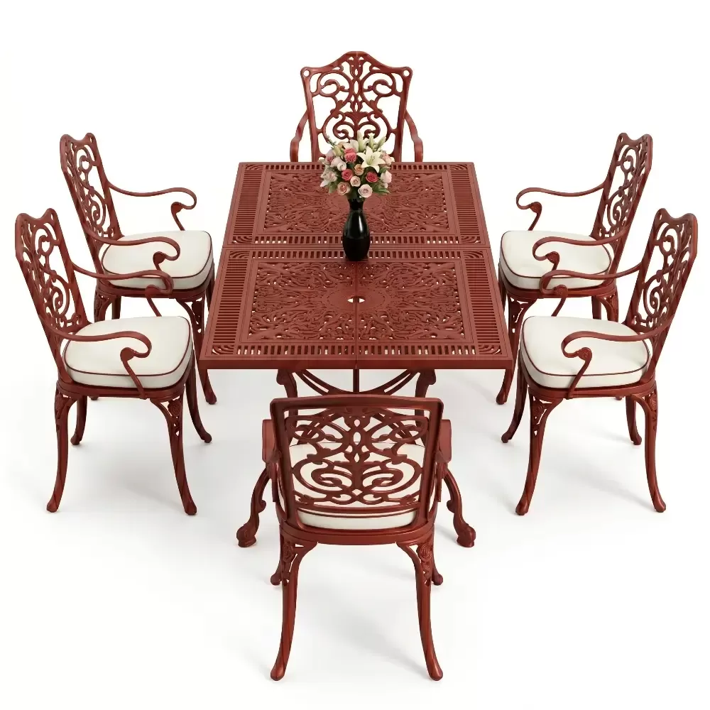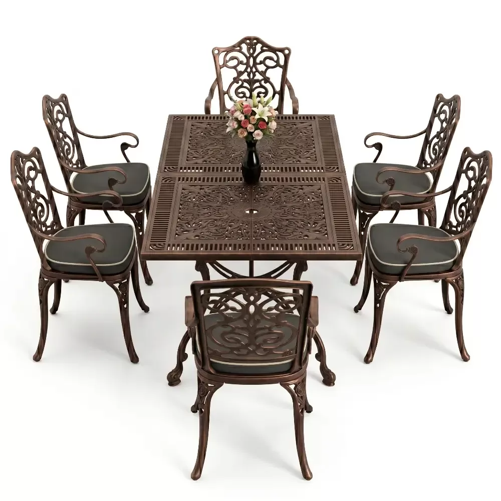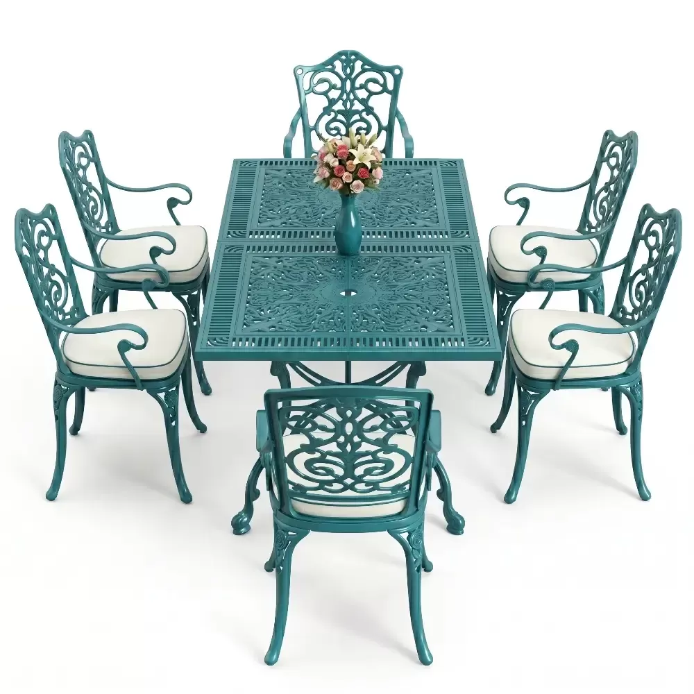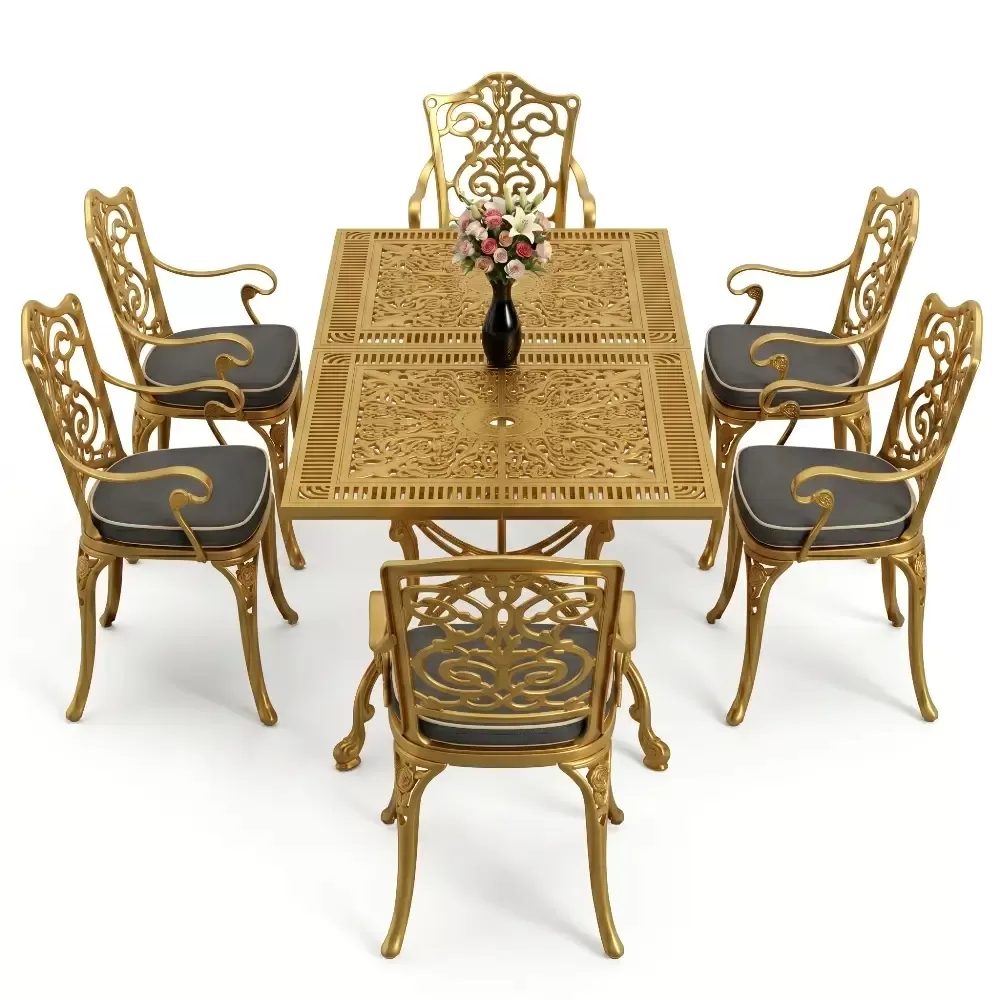 Akbrella dış mekan koleksiyonunun en yeni ve geniş hacimli üyelerinden olan 111 MHS yemek takımı, ferforje estetiğini alüminyum dökümün sarsılmaz dayanıklılığıyla harmanlar. Altı kişilik bu seçkin takım, dikdörtgen formdaki geniş masasıyla sosyal etkileşimlerinize konforlu bir zemin hazırlar. Alüminyum malzemenin doğal paslanmazlık özelliği, sanatsal döküm motifleriyle birleşerek bahçenizde veya terasınızda nesiller boyu sürecek bir mirasın parçası olur.