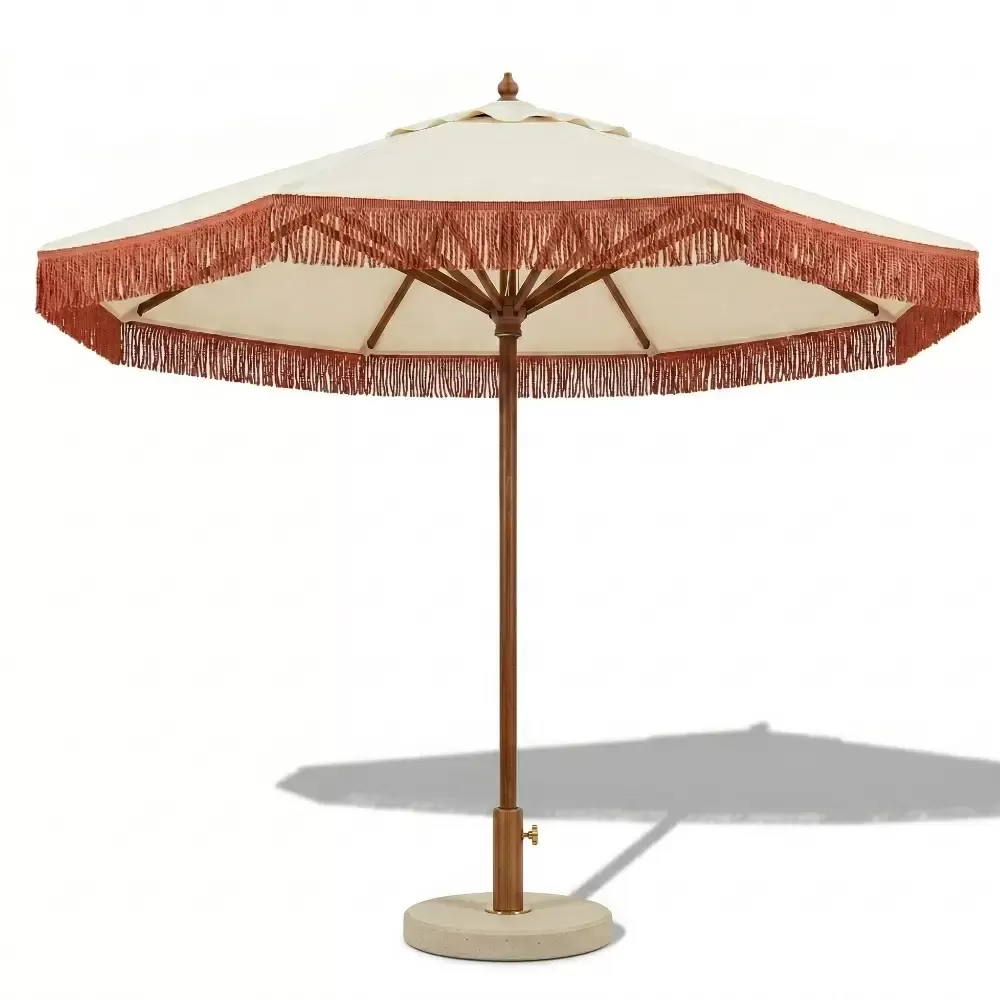 Dış mekanlarınıza nostaljik bir şıklık katan 2.5 Metre Çapındaki saçaklı ahşap şemsiyemiz, tamamen yerli imalat olup fırınlanmış kayın ağacının sağlamlığını lüks makrome işçiliği ile birleştiriyor.