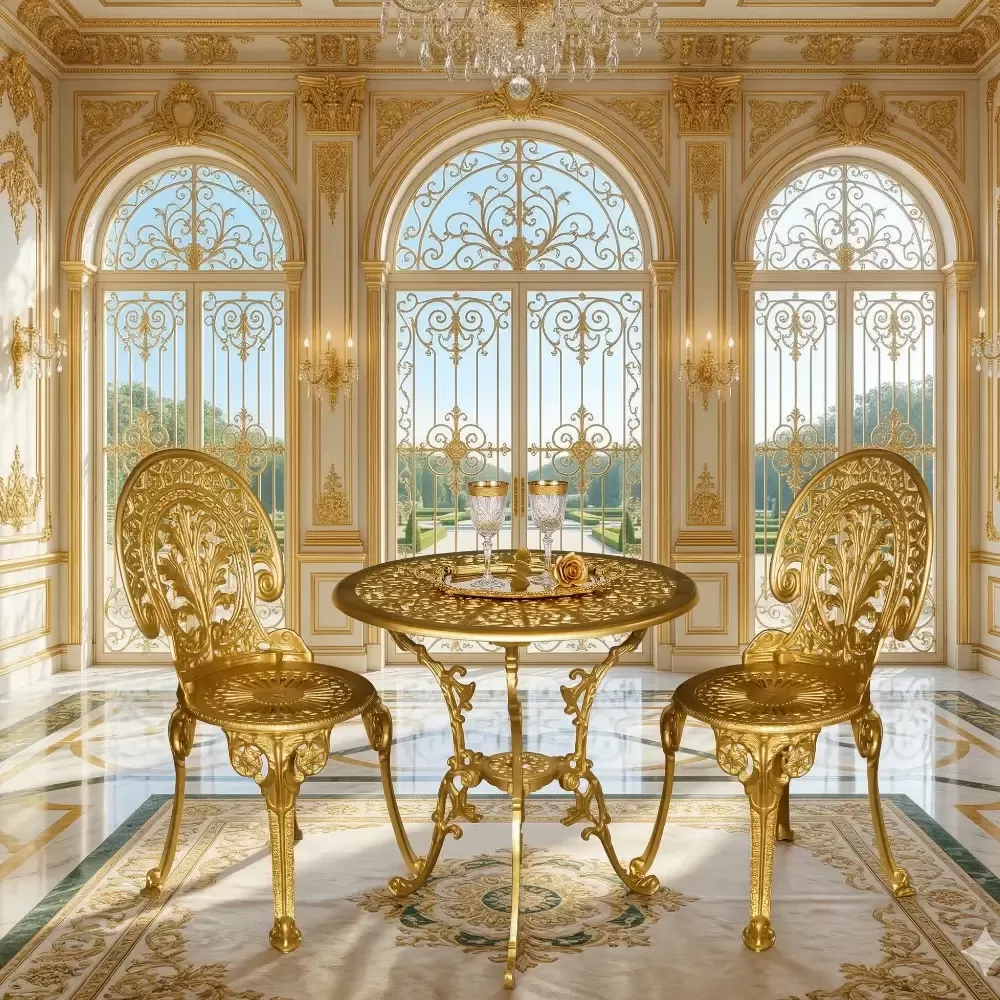 Dış mekan dekorasyonunda uzmanlaşan Akbrella, kendi üretim tesislerinde titizlikle hazırladığı FER TK - 16 kodlu döküm masa sandalye takımı ile tarihi bir asaleti mekanlarınıza taşıyor. Bizans figürlerinin zarafetini gold rengin ihtişamıyla birleştiren bu takım; bahçe, teras, balkon ve profesyonel işletmeler için hem estetik hem de yüksek dayanımlı bir kullanım sunar.