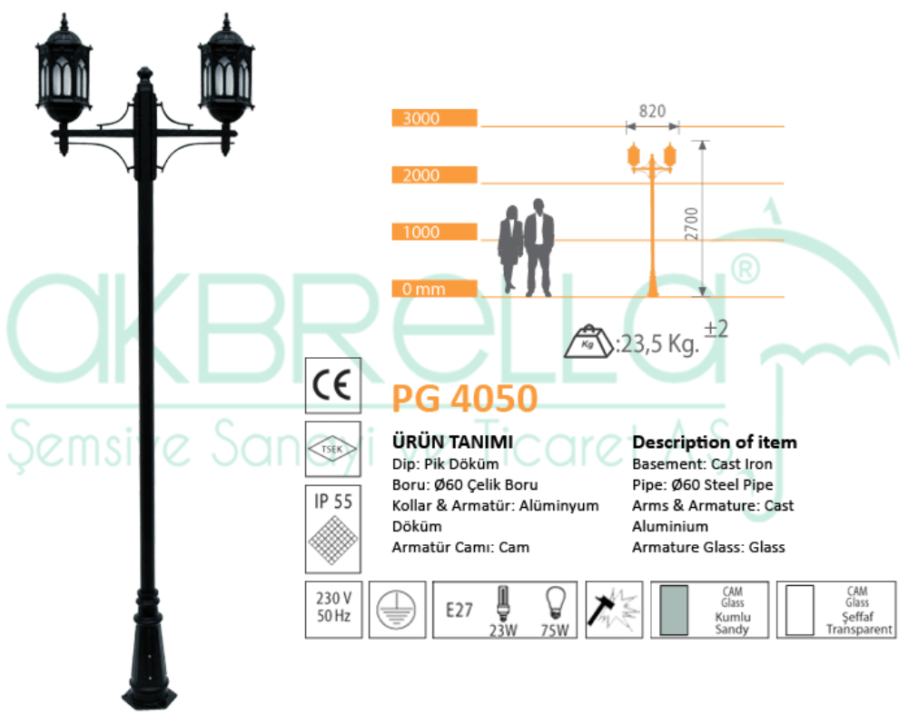 Akbrella, kalite ve müşteri memnuniyetini ön planda tutarak ürettiği PG 4050 modeliyle dış mekanlarınıza değer katmayı hedefliyor. CE, TSE ve IP55 sertifikalarıyla güvenliğini kanıtlayan bu ürün, uzun yıllar boyunca sorunsuz bir aydınlatma