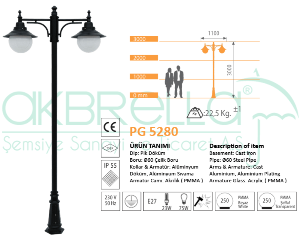 Akbrella, dış mekan aydınlatmasında kalite ve estetiği bir araya getiren öncü bir marka olarak, PG 5280 ile de bu iddiasını sürdürüyor. CE, TSE ve IP55 gibi kalite belgeleriyle tescillenen bu ürün, güvenli ve dayanıklı bir aydınlatma çözümü sunuyor.