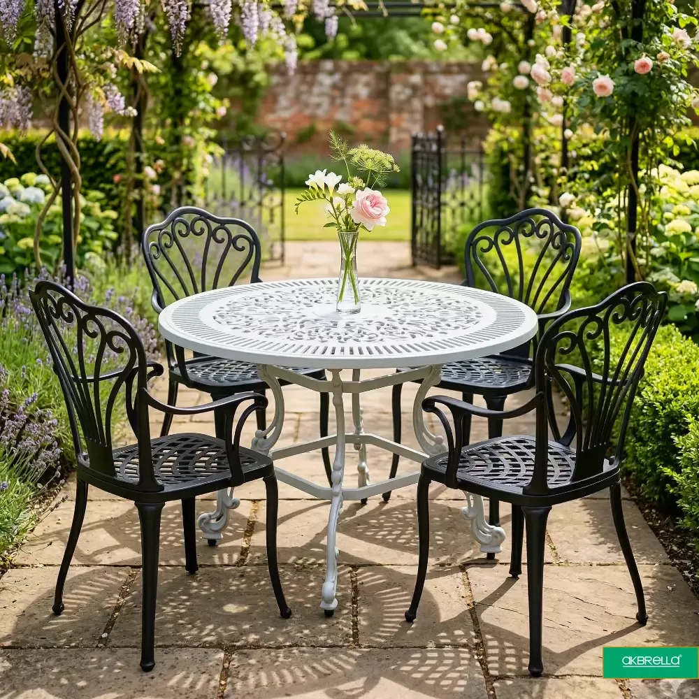 Dış mekan dekorasyonunda uzmanlaşan Akbrella, kendi üretim tesislerinde titizlikle hazırladığı PG 04TK B4 kodlu döküm masa sandalye takımı ile ihtişamı konforla birleştiriyor. Tavuskuşu figürlerinin zarafetini 100 cm çapındaki yuvarlak döküm masasıyla sunan bu set; bahçe, teras, balkon ve profesyonel cafe işletmeleri için prestijli bir atmosfer oluşturur.