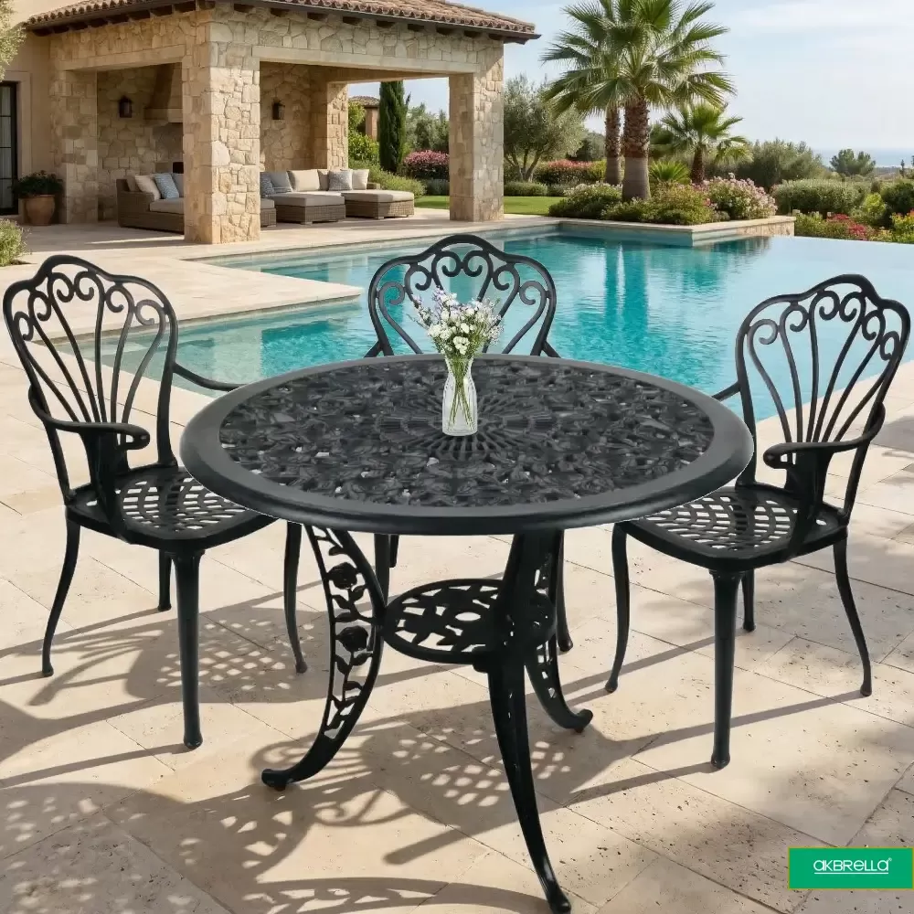 Dış mekan dekorasyonunda uzmanlaşan Akbrella, kendi üretim tesislerinde titizlikle hazırladığı PG 7500TK D3 kodlu döküm masa sandalye takımı ile ihtişamı konforla birleştiriyor. Tavuskuşu figürlerinin zarafetini 90 cm çapındaki yuvarlak döküm masasıyla sunan bu set; bahçe, teras, balkon ve profesyonel işletmeler için uzun ömürlü ve şık bir çözümdür.