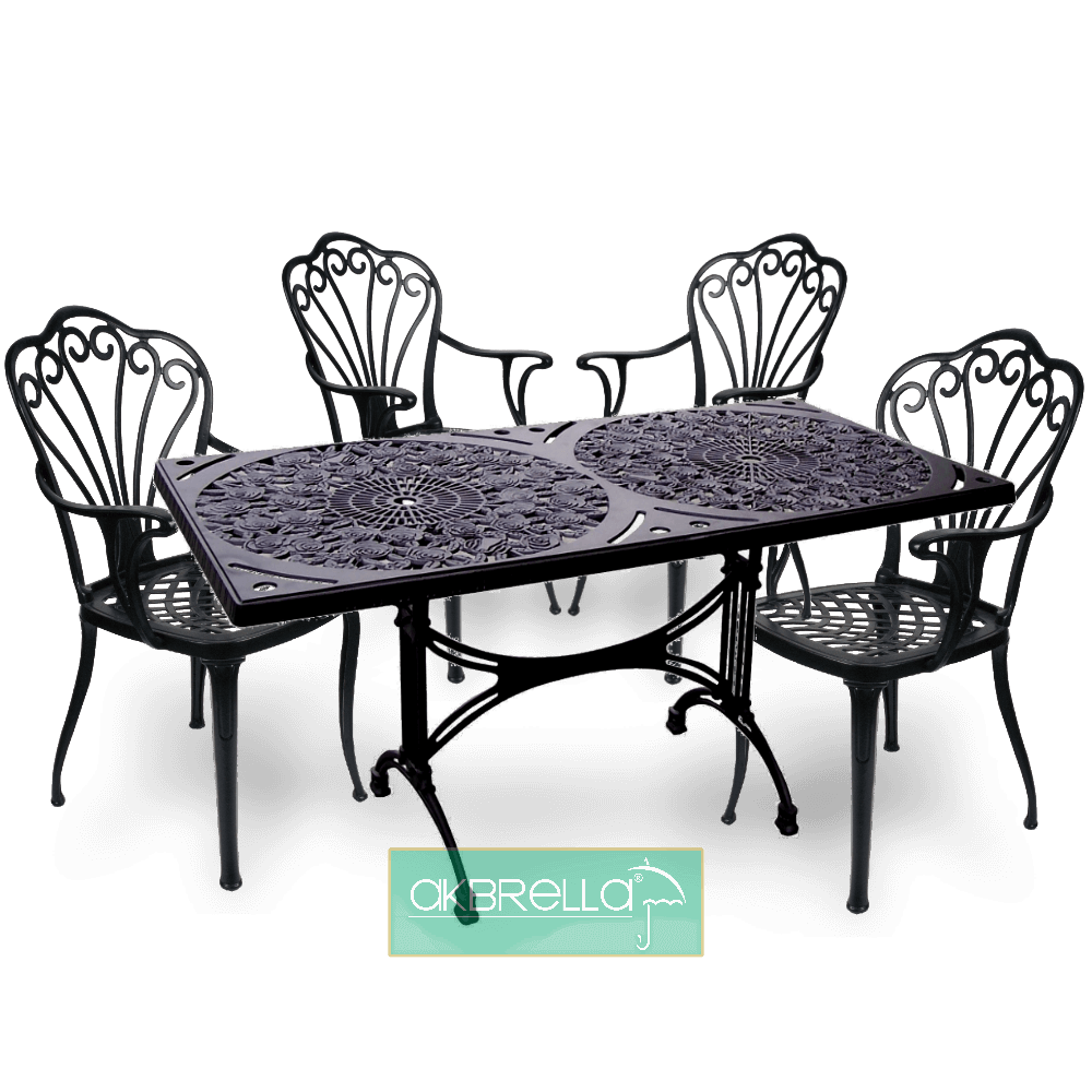 %100 alüminyum döküm malzemeden üretilen bu takım, uzun ömürlü kullanım için elektrostatik toz boya ile kaplanmıştır. Bu sayede, hava koşullarına karşı yüksek direnç gösterir ve yıllarca ilk günkü görünümünü korur. Mat, parlak ve eskitme gibi farklı boya seçenekleri ile kişisel zevkinize uygun hale getirebilirsiniz.