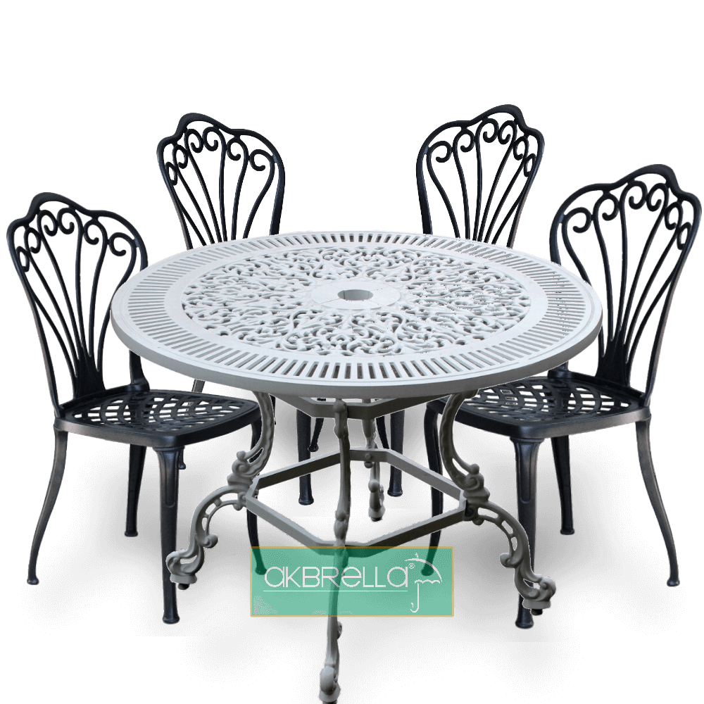 Akbrella markasının özenle tasarladığı PG 04TK A4 kodlu 4 Kişilik Döküm Ferforje Kolsuz Tavuskuşu Masa Sandalye Takımı, dış mekanlarınıza benzersiz bir estetik ve konfor sunuyor. 100 cm çapındaki yuvarlak masa, göz alıcı tavuskuşu motifli sandalyelerle birleşerek bahçenizi, balkonunuzu veya terasınızı adeta bir sanat eserine dönüştürüyor.