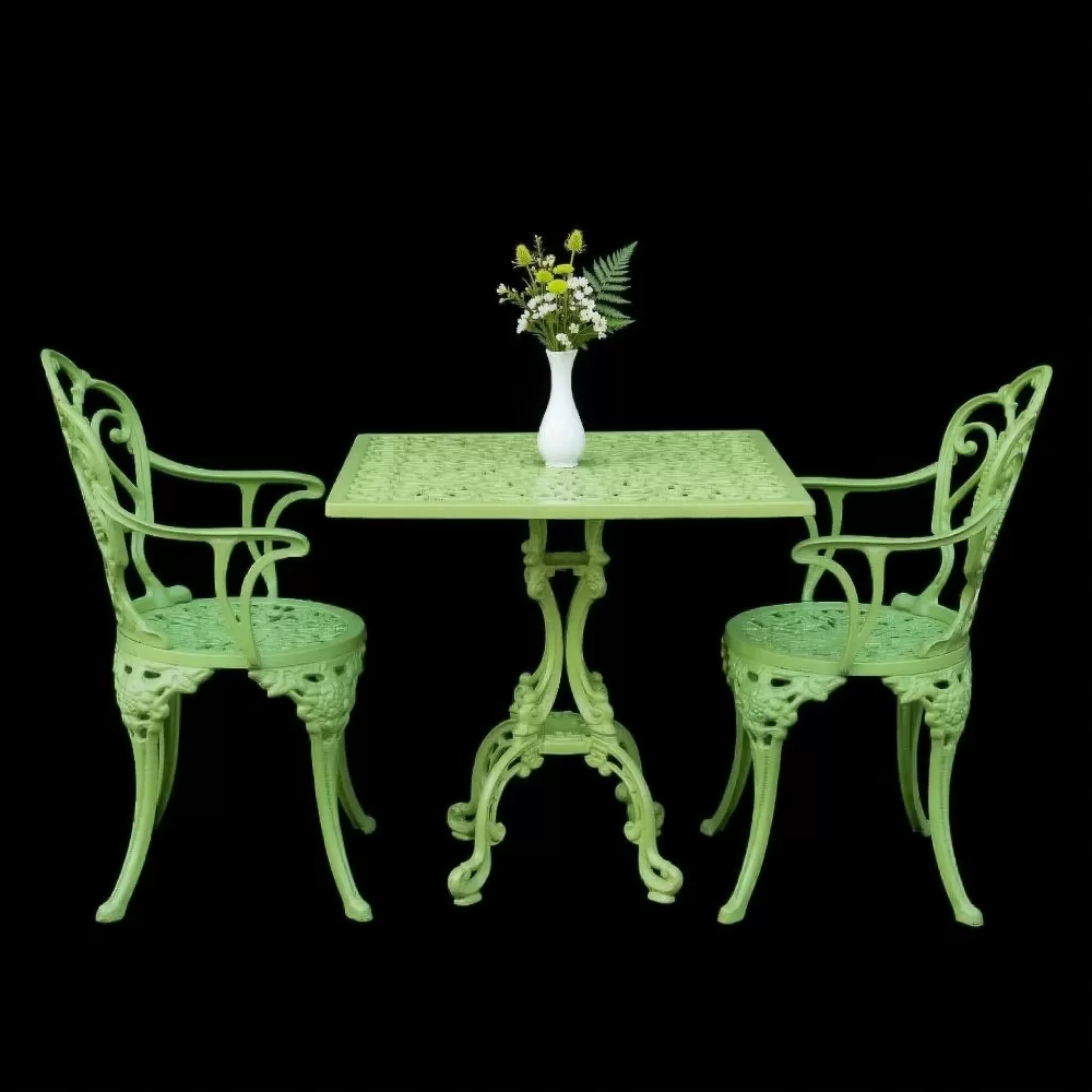 Elektrostatik toz boya teknolojisi ile fırınlanarak renklendirilen takımımız; güneşin UV ışınlarına, yoğun neme ve yağışlara karşı tam dirençlidir. Demir ferforje ürünlerin aksine alüminyum gövde asla oksitlenme ve çürüme yapmaz.