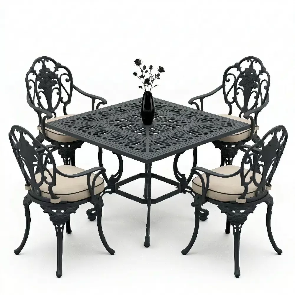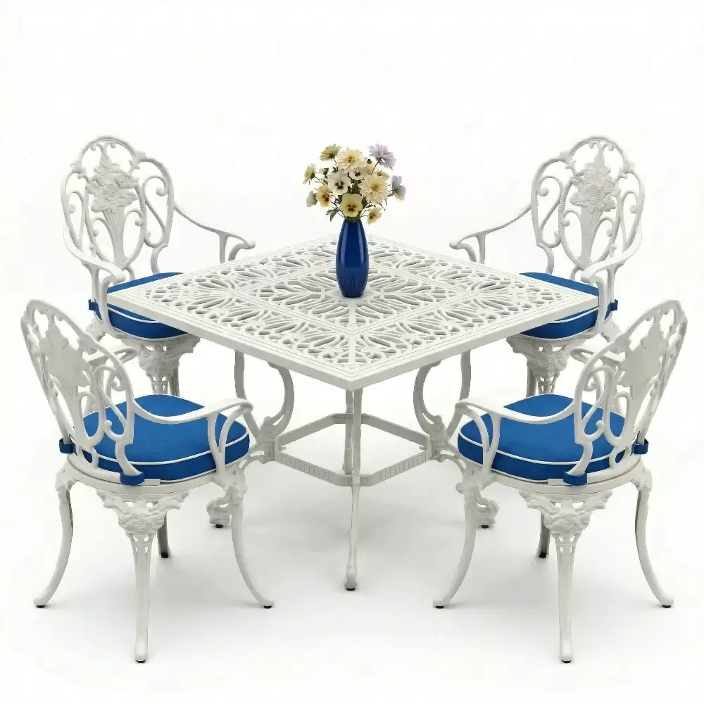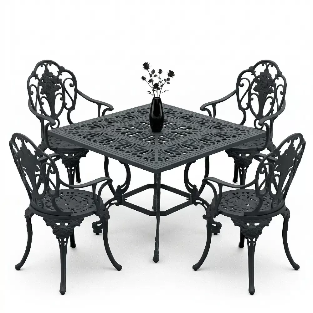 Ismini sandalyelerindeki ince iscilikle islenmis kabartma gul motiflerinden alan Model 13, Akbrella koleksiyonunun en romantik ve prestijli uyelerinden biridir. 100x100 cm kare masa yapisiyla 4 kisilik samimi ve konforlu bir yemek ortami sunan bu takim, dis mekanlariniza bir saray bahcesi zarafeti katar. Agir ferforje gorunumunu, hafif ve paslanmaya karsi tam direncli ETA 160 alasimli aluminyum dokum teknolojisiyle yeniden yorumladik.