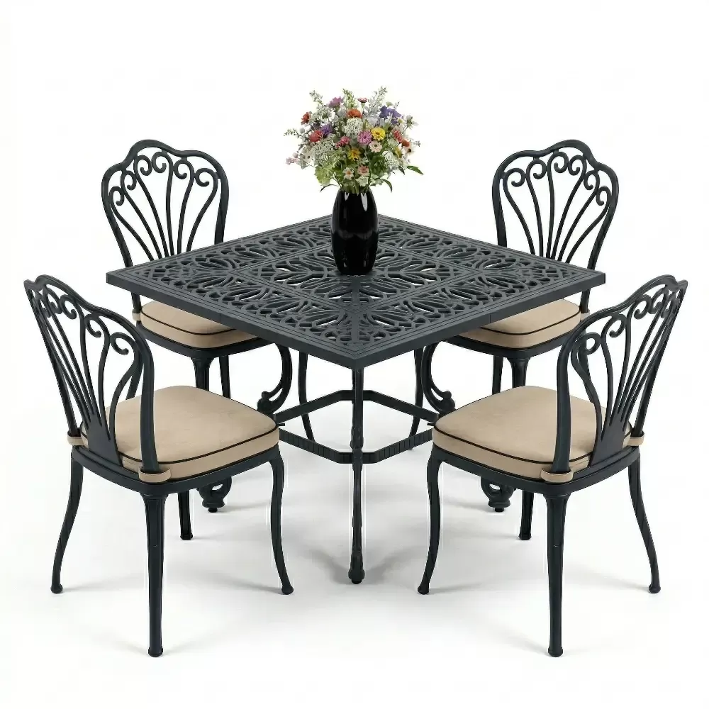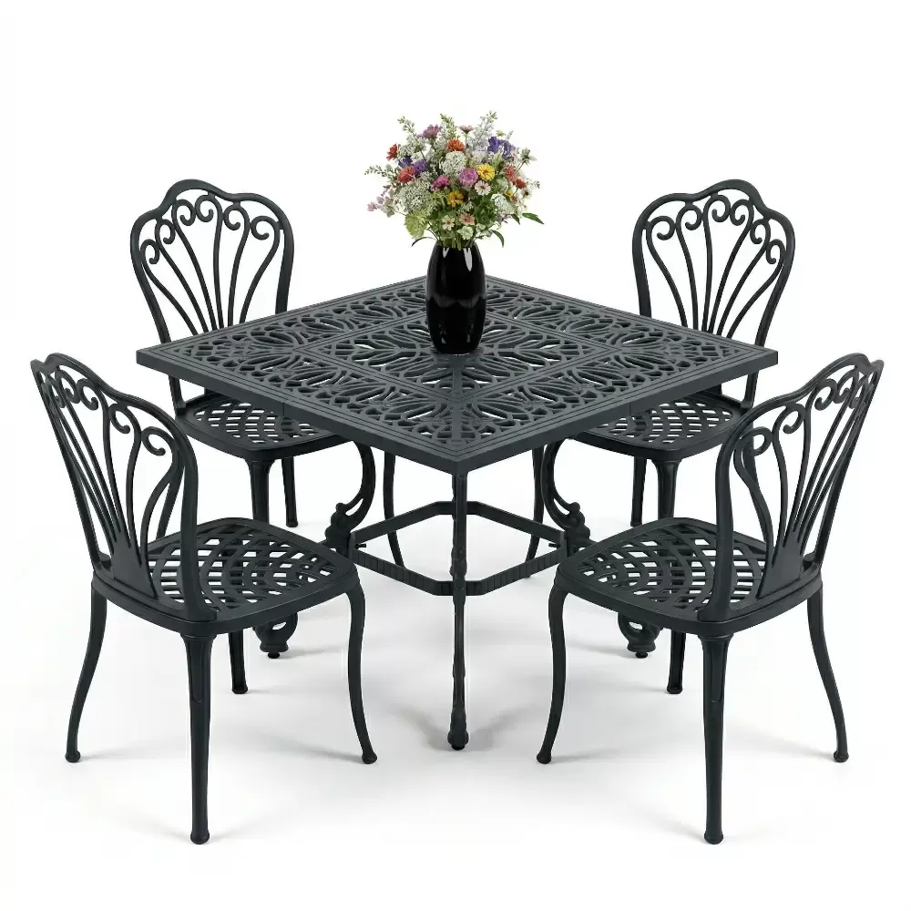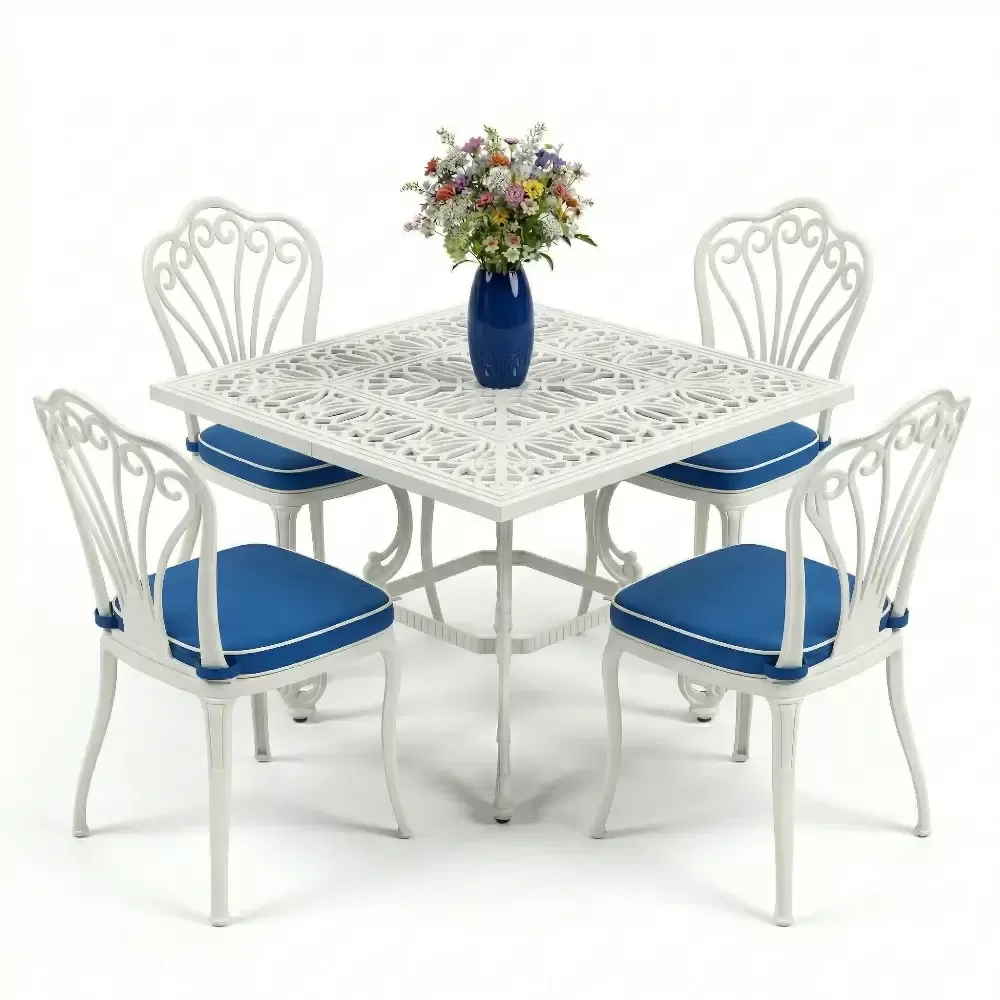 Ismini sandalyelerindeki detayli ve zarif tavuskusu kabartma desenlerinden alan Model 15, dis mekan dekorasyonunda luks ve zarafeti bir arada sunuyor. 100x100 cm kare masa formuyla 4 kisilik prestijli bir yemek alani saglayan bu tasarim, Akbrella uzmanligiyla uretilen en ozel serilerimizden biridir. Geleneksel ferforje estetigini, paslanmaya karsi tam direncli ETA 160 alasimli aluminyum dokum hafifligi ile bulusturarak yasam alanlarinizi bir sanat eserine donusturuyoruz.