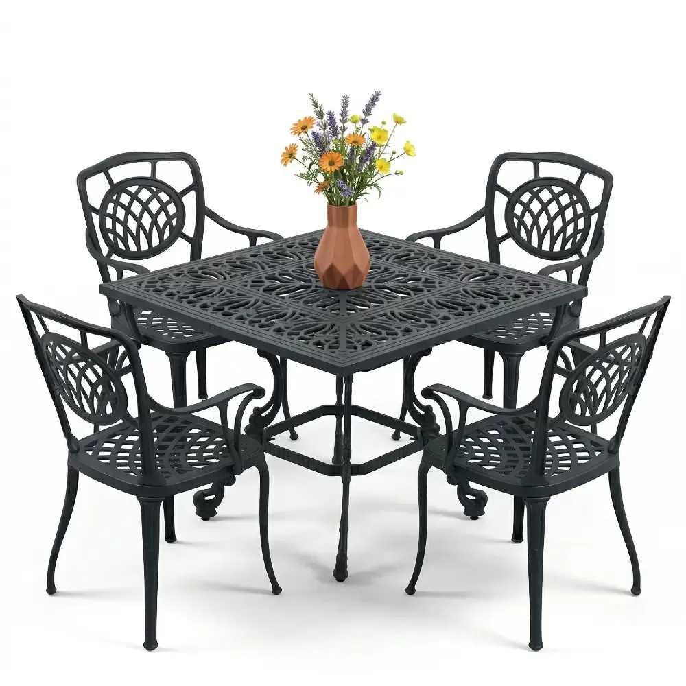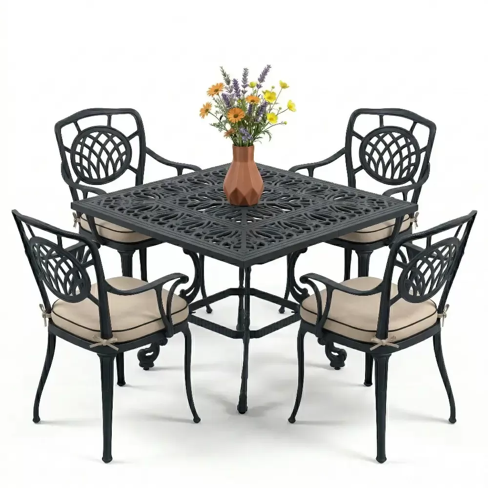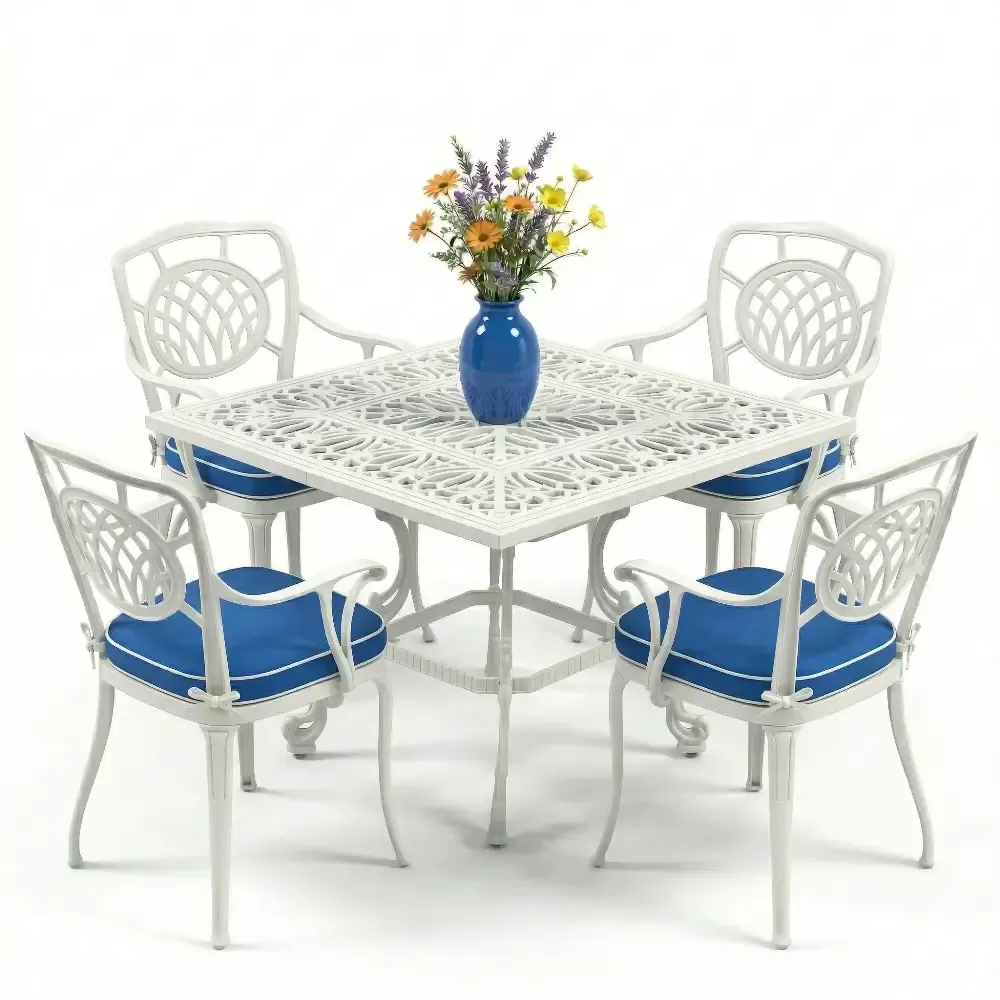 Ismini sandalyelerindeki karakteristik ay kabartma desenlerinden alan Model 18, bahcenize veya balkonunuza sofistike bir hava katmak icin Akbrella tarafindan tasarlandi. 100x100 cm kare olculeriyle 4 kisilik ideal bir kullanim sunan bu takim, kompakt yapisiyla hem dar hem de genis alanlarda luks bir yemek bolumu olusturmaniza olanak tanir. Agir ve bakimi zor ferforje yerine, paslanmaya karsi tam direncli ETA 160 alasimli aluminyum dokum teknolojisiyle uretilmistir.