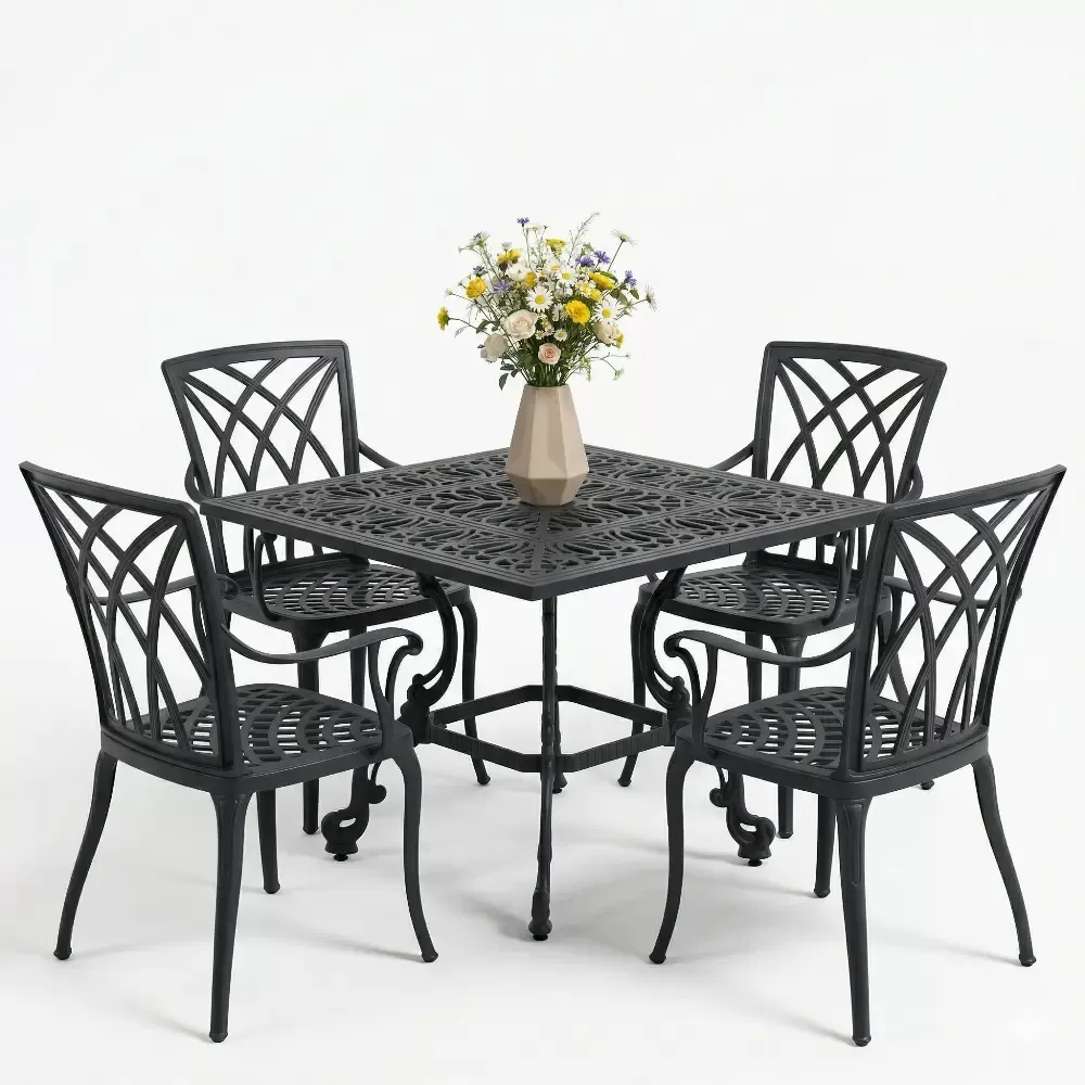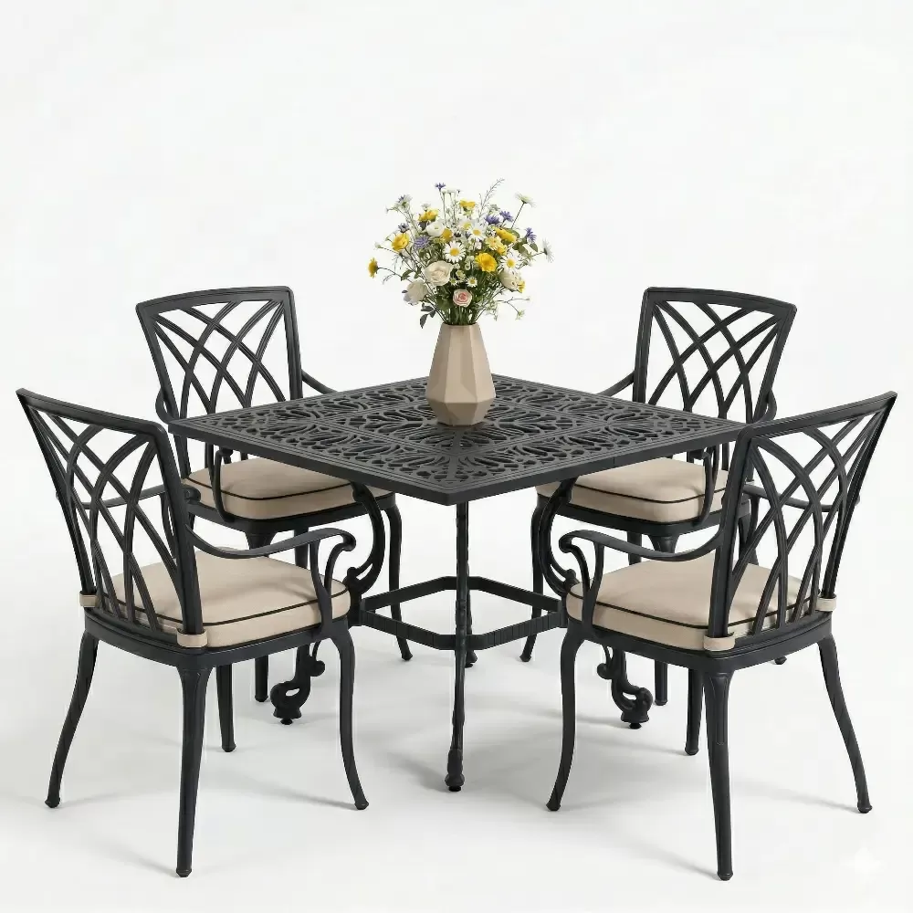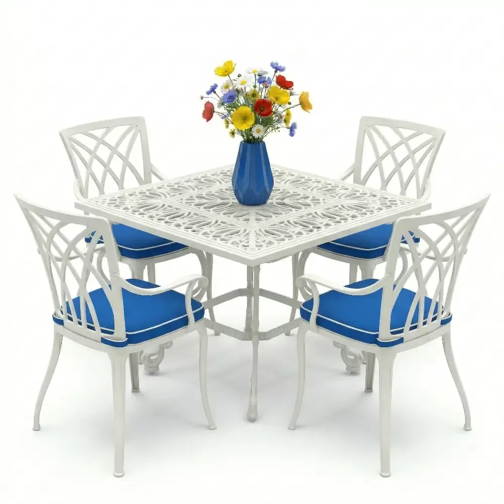 Ismini sandalyelerindeki keskin ve modern diyagonal kabartma desenlerinden alan Model 20, minimalist tasarimi klasik ferforje ruhuyla harmanliyor. 100x100 cm kare formuyla 4 kisilik samimi ve konforlu bir yemek alani sunan bu takim, ozellikle dar alanlarda fonksiyonel bir luks yaratmak isteyenler icin tasarlandi. Akbrella uzmanligiyla uretilen bu seri, paslanmaya karsi tam direncli ETA 160 alasimli aluminyum dokum kalitesini bahcenize tasiyor.
