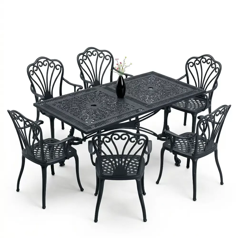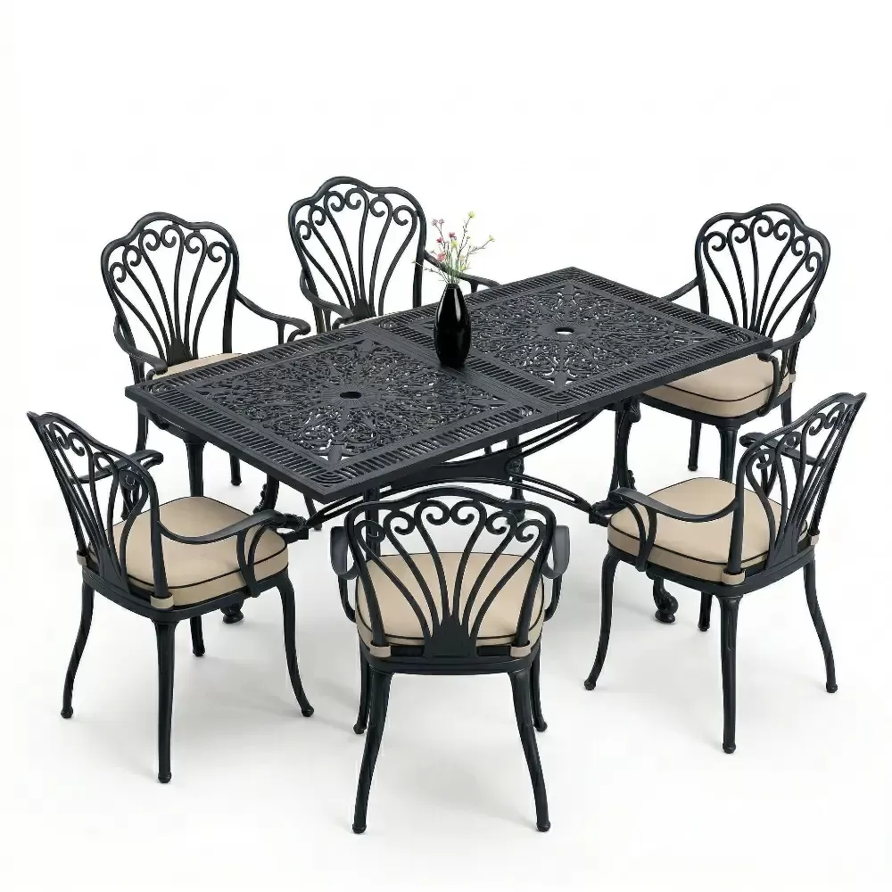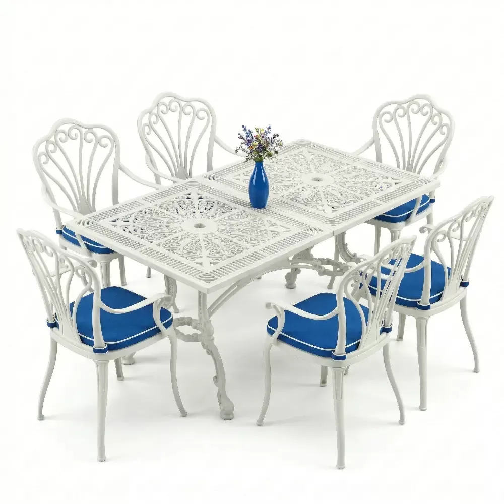 Ismini sandalyelerindeki gorkemli tavuskusu kabartmalarindan alan Model 26, dis mekan dekorasyonunda luks ve estetik arayanlar icin Akbrella tarafindan ozel olarak uretildi. 75x150 cm olculerindeki genis dikdortgen masasiyla 6 kisilik yemek davetlerinizde konforun yeni adresi olacak. Bu takim, geleneksel ferforje ruhunu hafif ve uzun omurlu ETA 160 aluimnyum dokum kalitesiyle modern cagın teknolojisine tasiyor.