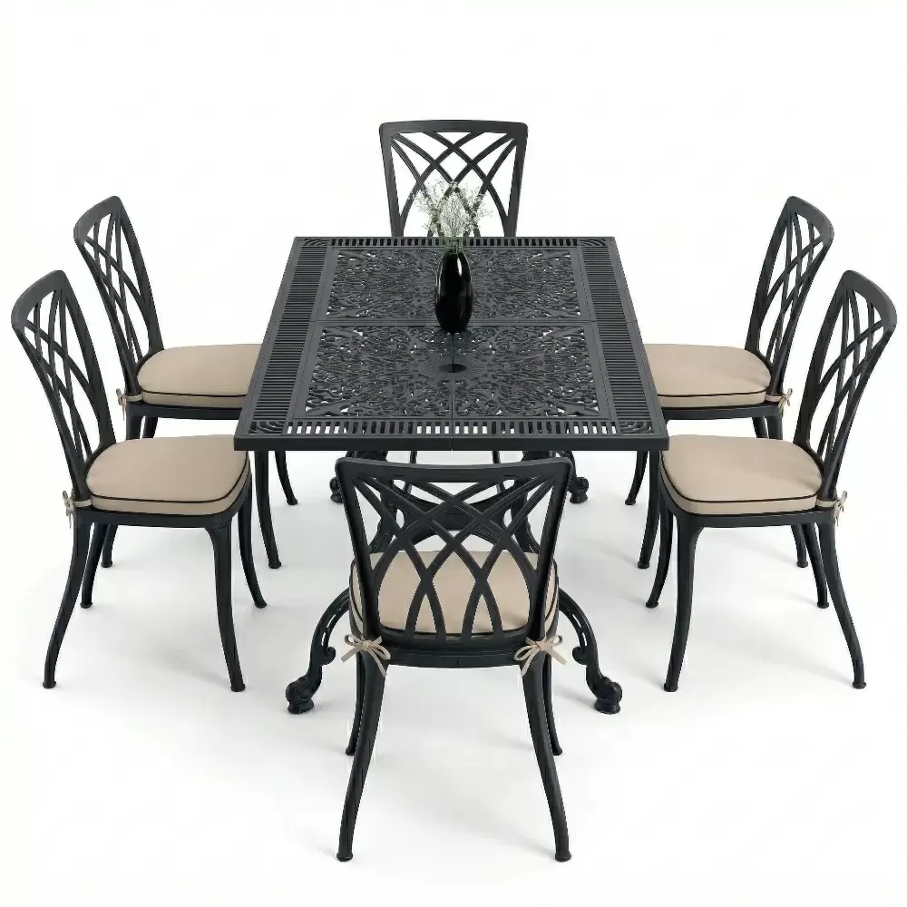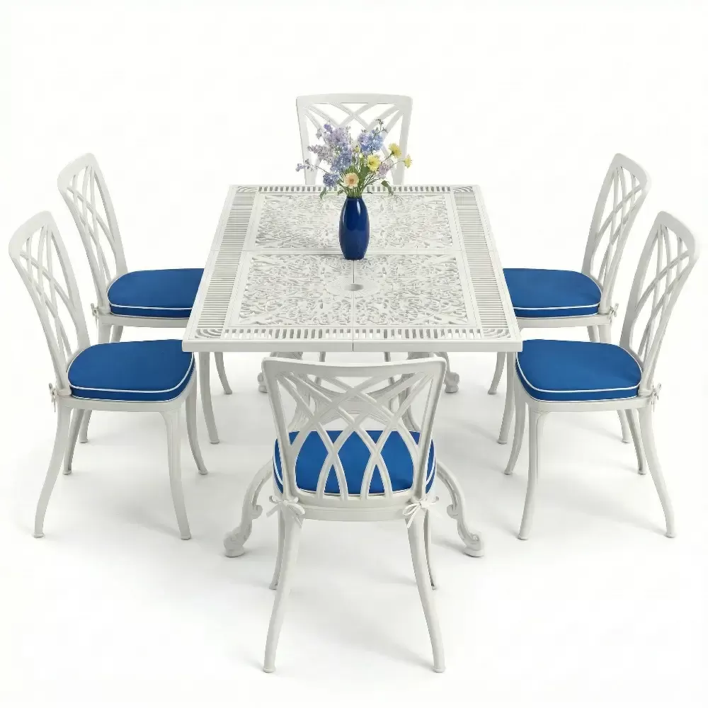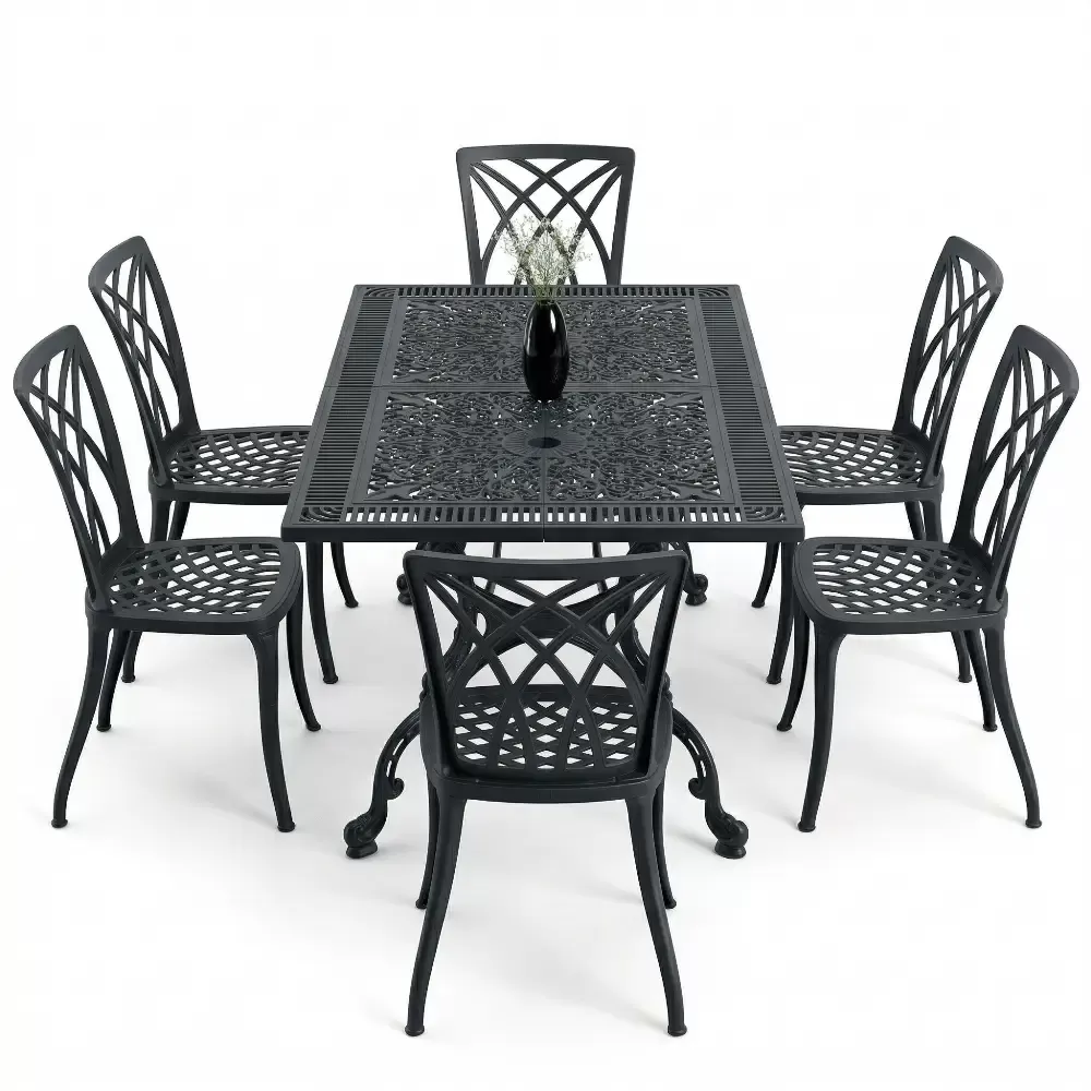 Bahçe ve teras dekorasyonunda fark yaratmak isteyenler için tasarlanan Model 30, ismini sandalyelerindeki özgün diyagonal kabartma desenlerinden alıyor. Klasik ferforje estetiğini, paslanmaya karşı ömür boyu dirençli ETA 160 alaşımlı döküm alüminyum kalitesiyle harmanladık. 75x150 cm ölçülerindeki geniş dikdörtgen masasıyla bu takım, 6 kişilik davetleriniz için hem şık hem de son derece dayanıklı bir çözüm sunuyor.