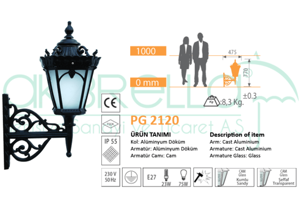 77 cm yüksekliğe, 47.5 cm ene sahip olan PG 2120, yukarı yöne bakan ferforje kolları ile dikkat çeker. Bu tasarım, hem görsel olarak şık bir duruş sergiler hem de aydınlatma işlevini en verimli şekilde yerine getirir. E27 duy tipi sayesinde, dilediğiniz güçte ve renkte ampul kullanarak, aydınlatma ihtiyaçlarınızı kişiselleştirebilirsiniz.