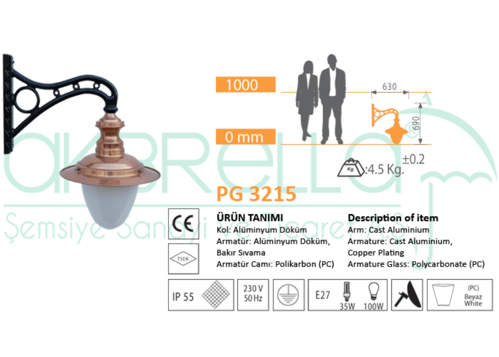 Akbrella markasının özenle tasarladığı PG 3215 dış mekan aydınlatma apliği, estetik ve dayanıklılığı bir araya getiren benzersiz bir üründür. Alüminyum döküm tekniğiyle üretilen bu aplik, uzun ömürlü ve sağlam yapısıyla dikkat çeker. Daire kollu tasarımı ve bakır kapaklı armut şeklindeki dış mekan aydınlatma başlığı, her türlü dış mekana zarif bir dokunuş katar.