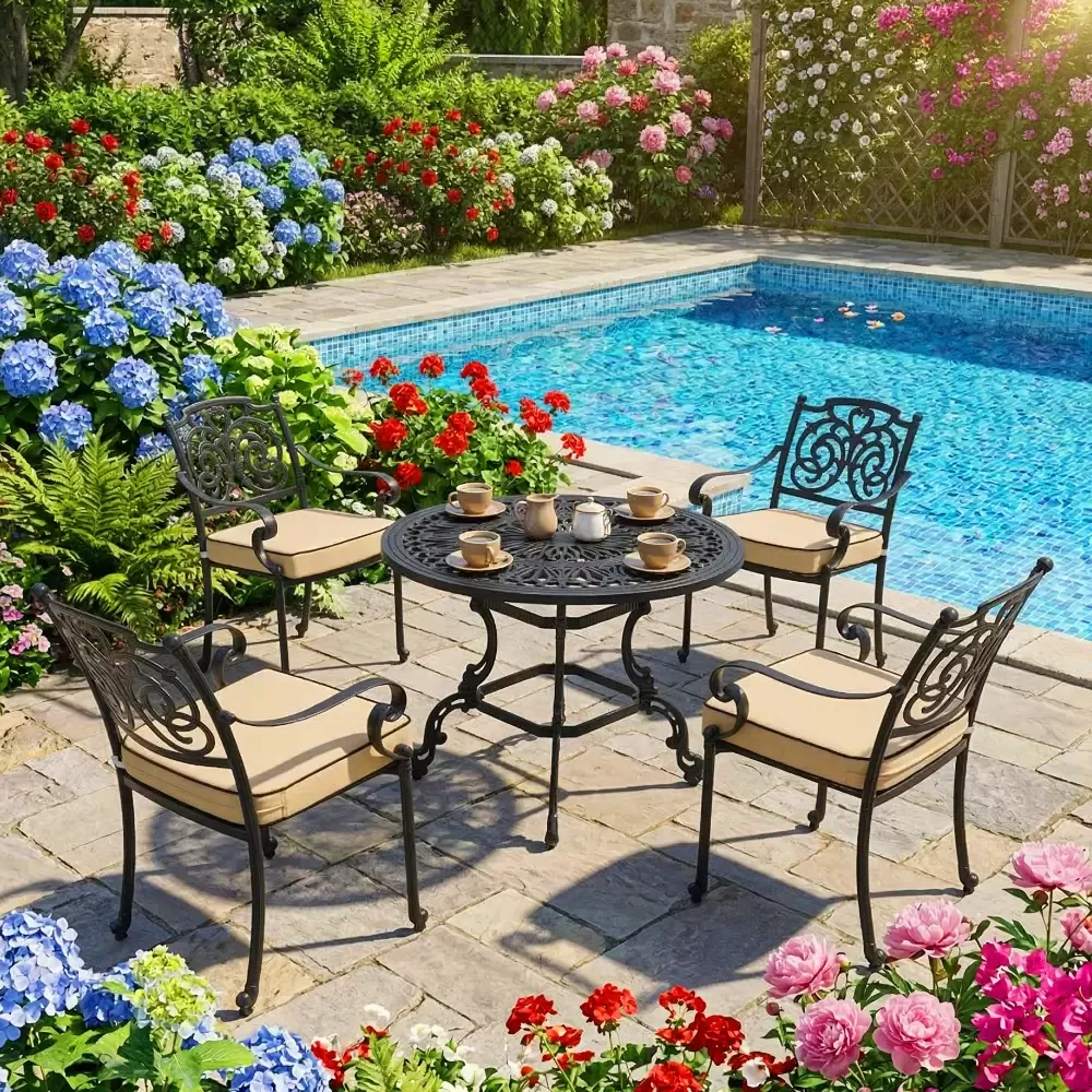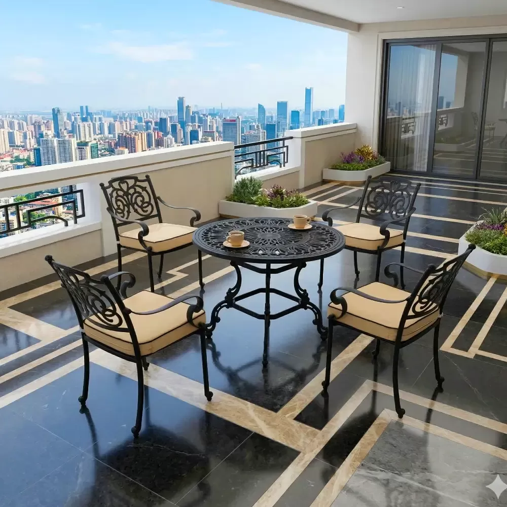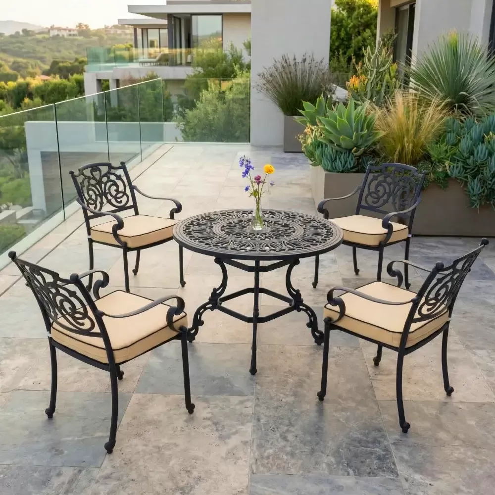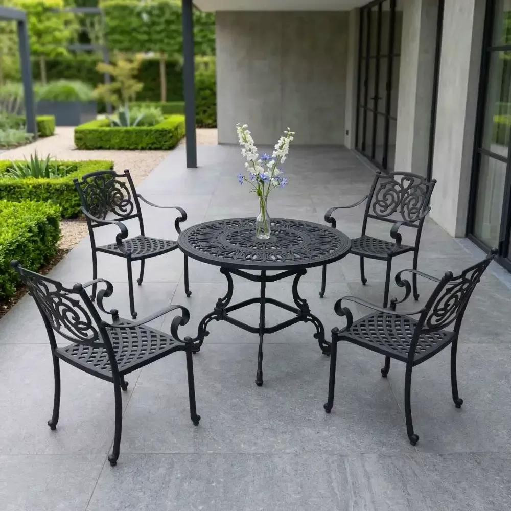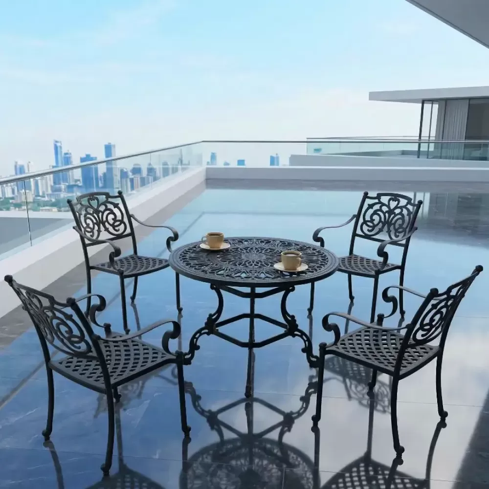 Dış mekan dekorasyon uzmanı Akbrella, kendi tesislerinde zarif kelebek motifleriyle ürettiği LXY 115 döküm oturma grubunu beğeninize sunuyor. Siyahın asaletini 100 cm çapındaki geniş yuvarlak döküm masasıyla birleştiren bu set; bahçe, teras, balkon ve profesyonel cafe işletmeleri için paslanmaz alüminyum döküm kalitesini estetikle harmanlar.