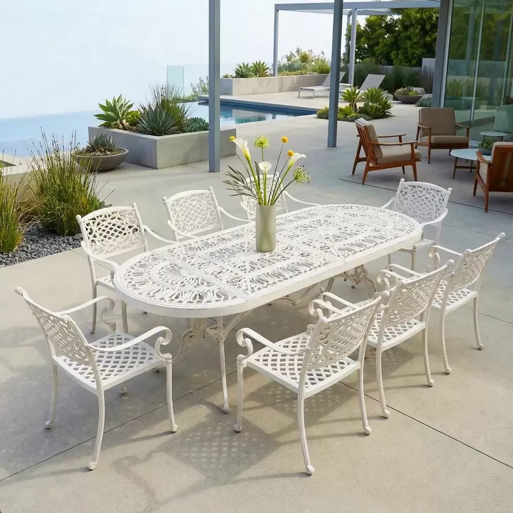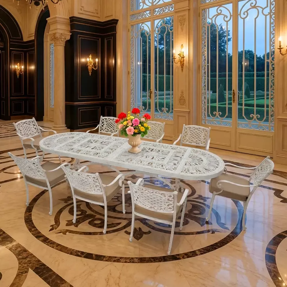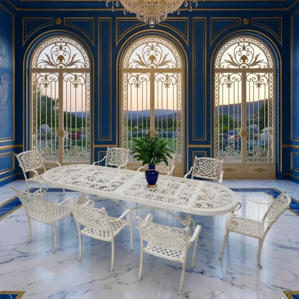 Geniş dış mekanlar ve kalabalık davetler için tasarlanan LXY 130, Akbrella üretici uzmanlığıyla mekanlarınıza değer katıyor. 210 cm uzunluğundaki zarif elips masası ve güneş figürlü 8 adet ergonomik kollu sandalyesiyle bu takım; bahçeler, geniş teraslar ve kurumsal işletmeler için paslanmaz alüminyum döküm kalitesini estetikle harmanlar.