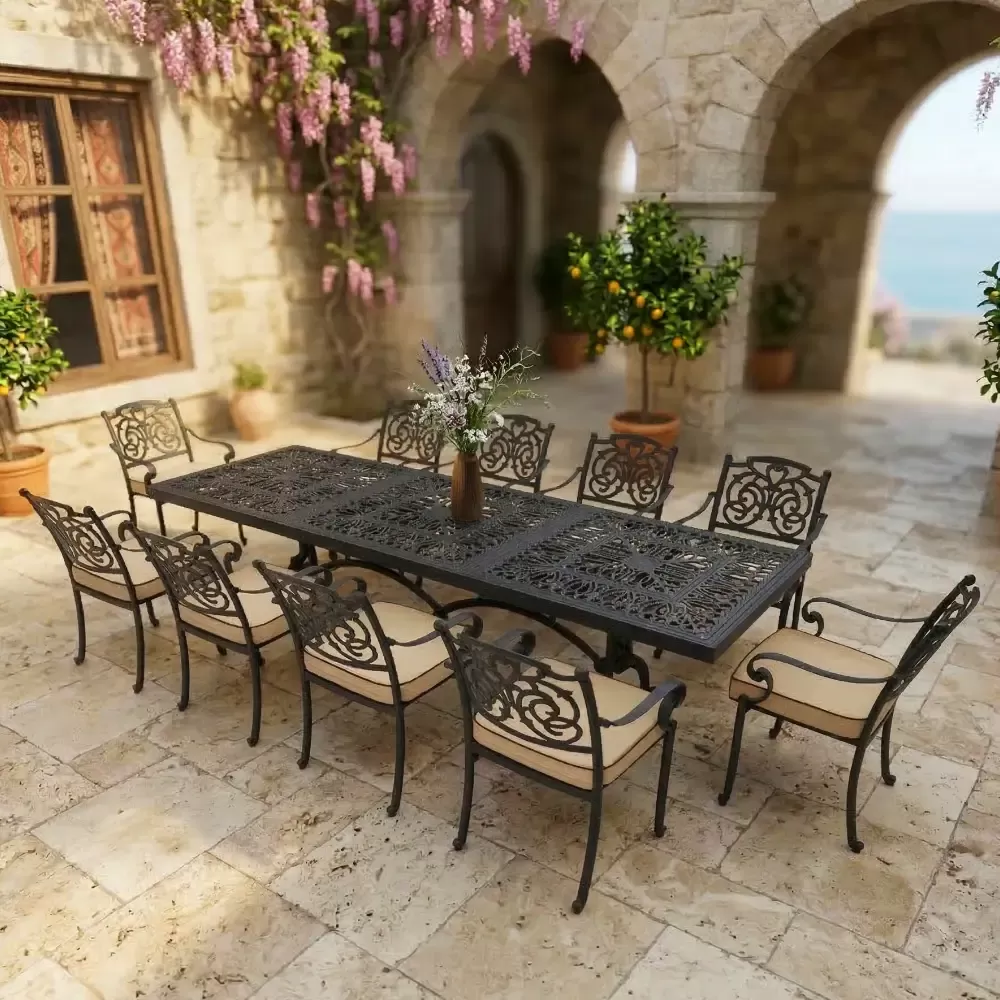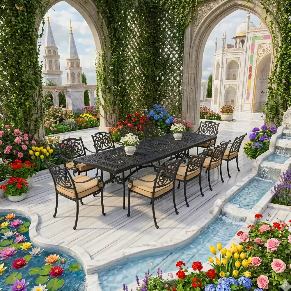 Kalabalık davetler ve geniş dış mekanlar için tasarlanan LXY 100-1, Akbrella üretici uzmanlığıyla mekanlarınıza değer katıyor. 300 cm uzunluğundaki devasa dikdörtgen masası ve kelebek figürlü 10 adet ergonomik kollu sandalyesiyle bu takım; büyük bahçeler, geniş teraslar ve kurumsal cafe işletmeleri için paslanmaz alüminyum döküm kalitesini estetikle birleştirir.