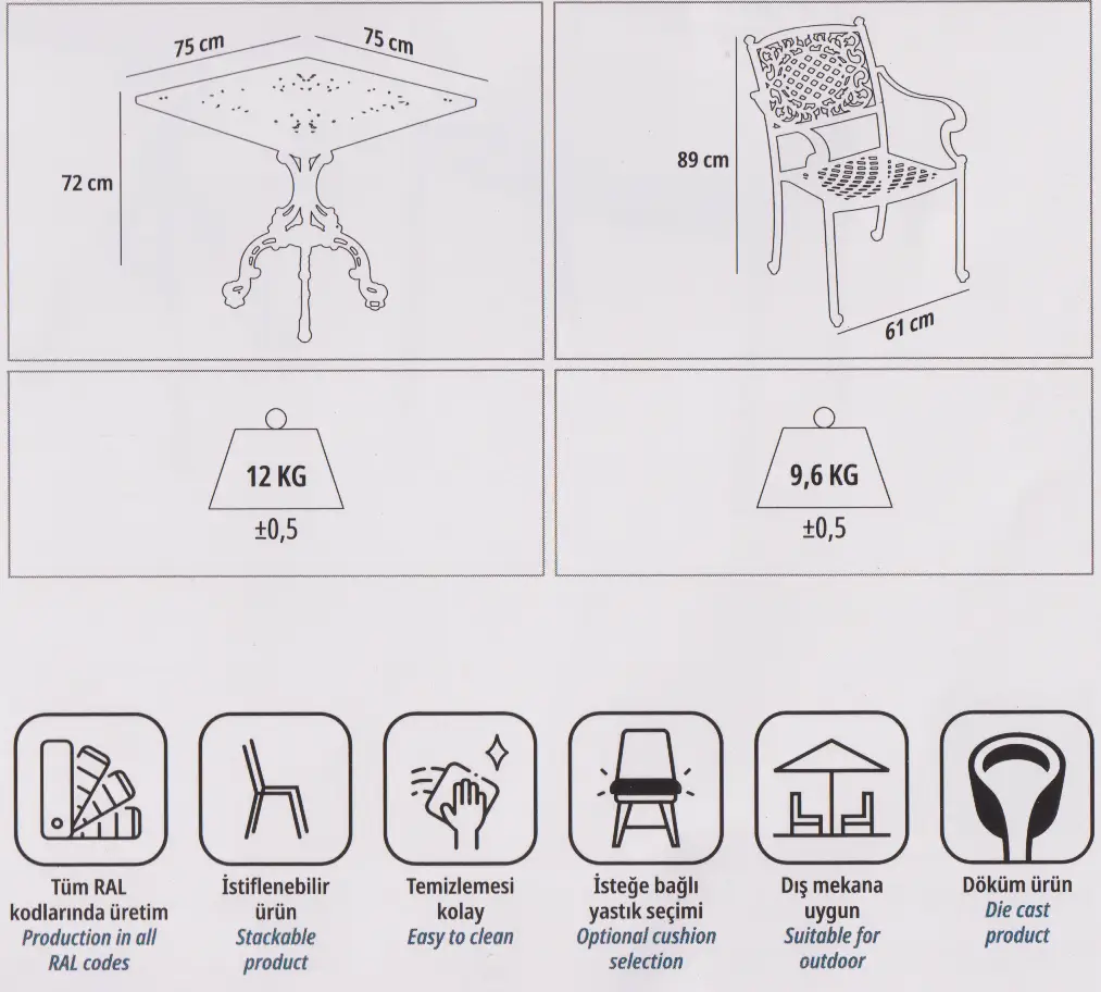 - Masa Boyutları: 75 cm (boy) x 75 cm (en) x 72 cm (yükseklik)