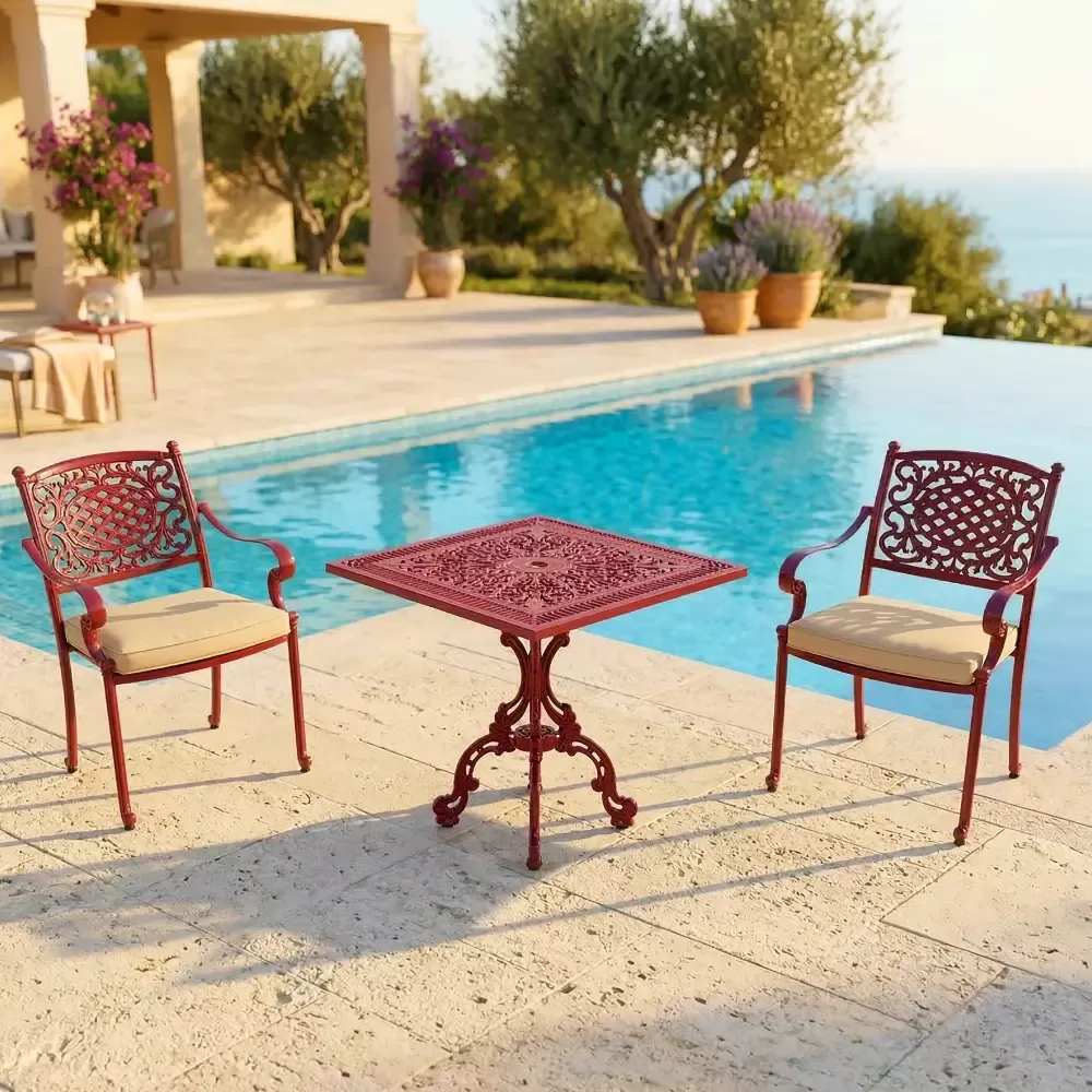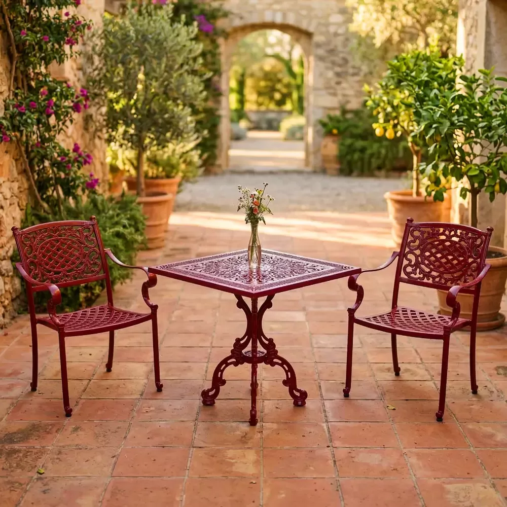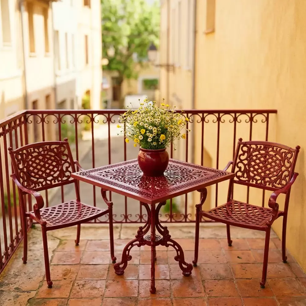 Elektrostatik toz boya teknolojisi ile fırınlanarak renklendirilen takımımız; güneşin UV ışınlarına, yoğun neme ve yağışlara karşı tam dirençlidir. Demir ferforje ürünlerin aksine alüminyum gövde asla oksitlenme ve çürüme yapmaz.