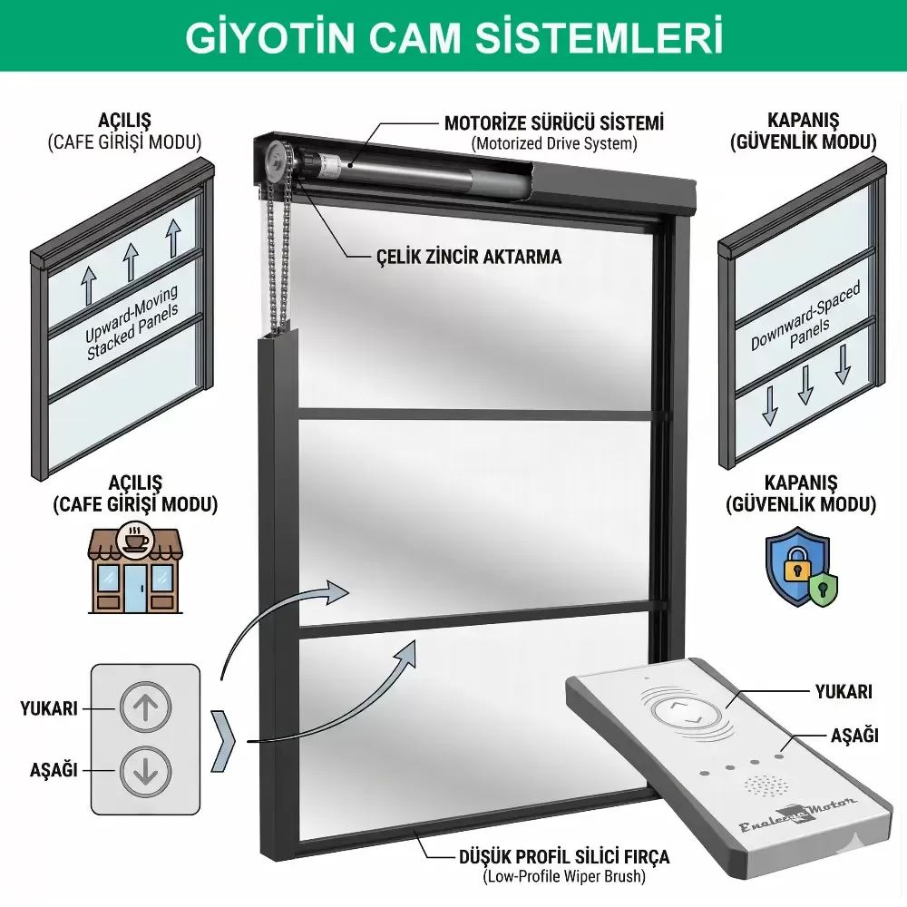 Sistem kapalıyken yüksek güvenlikli kilit mekanizması, açıkken ise cam korkuluk (küpeşte) görevi görür.