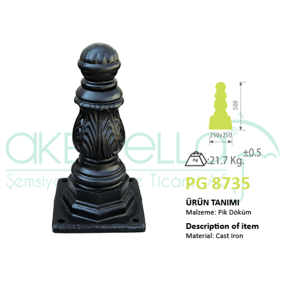 PG 8735, %100 alüminyum malzemeden üretilmiştir. Bu sayede, hava koşullarına ve dış etkenlere karşı yüksek dayanıklılık gösterir. Ürünün uzun ömürlü olmasını sağlamak amacıyla, elektrostatik toz boya ile boyanmıştır. Bu boyama şekli, ürünün yüzeyine mükemmel bir koruma sağlayarak, renk solmasını ve korozyonu önler.