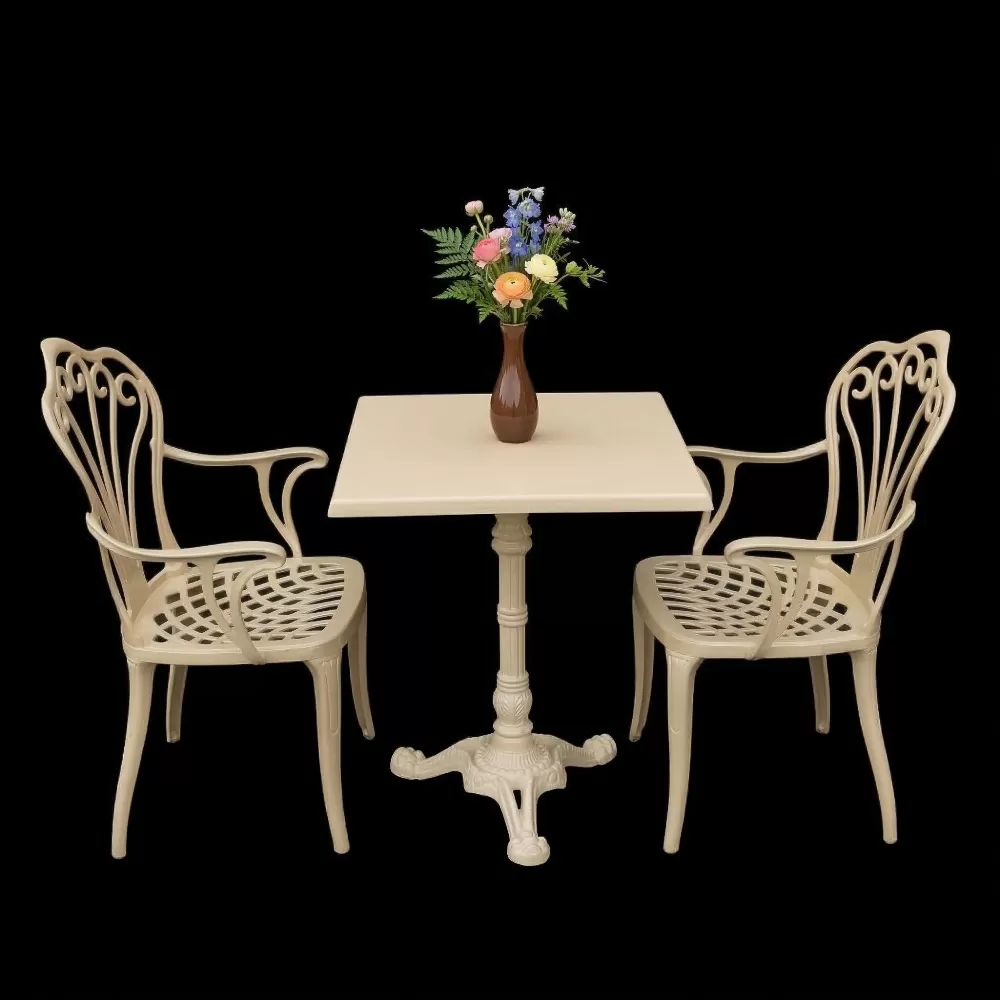 2 Kişilik 60x60 cm kare dış mekan bahçe balkon için alüminyum döküm ferforje kollu gül motifli masa sandalye takımı